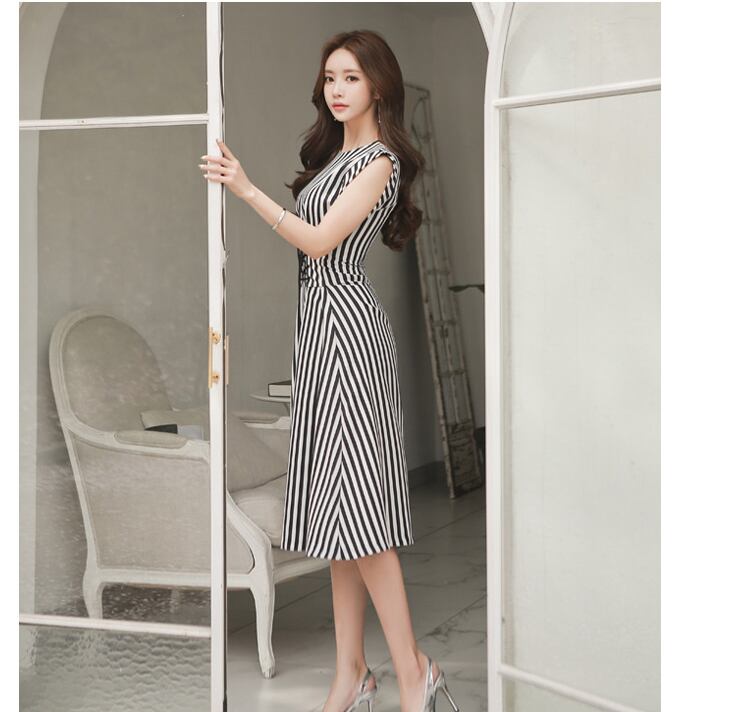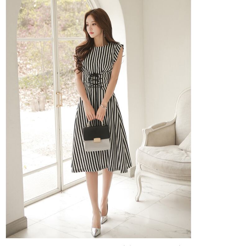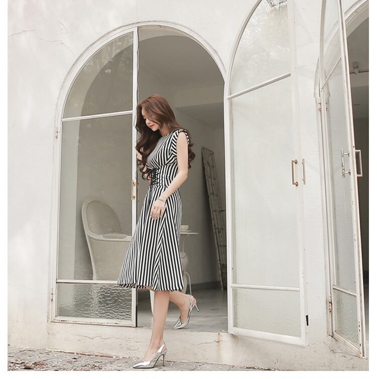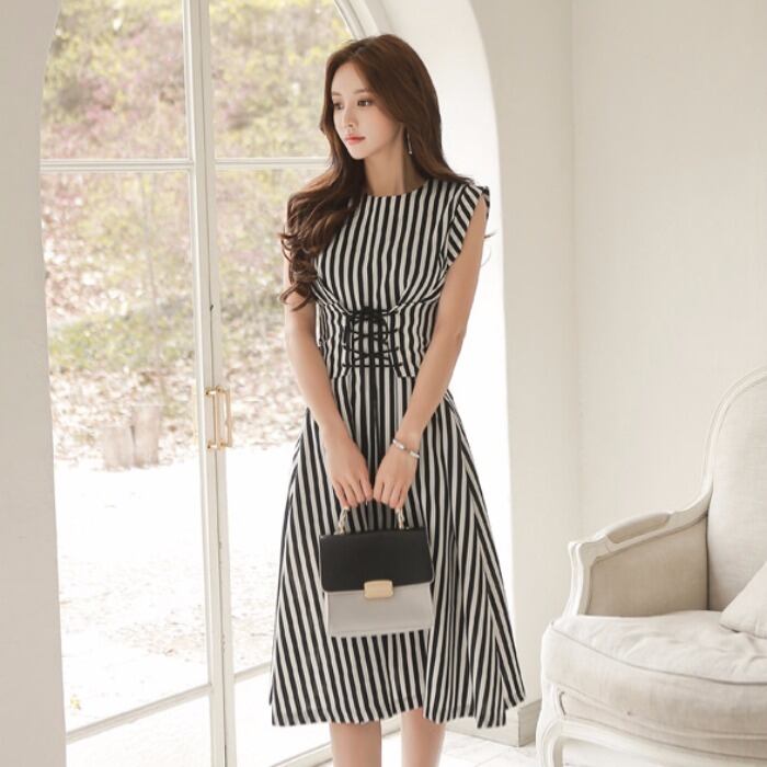 【dress】夏好感度UP!韓国風気質満点レトロラウンドネックストライプ柄ワンピース