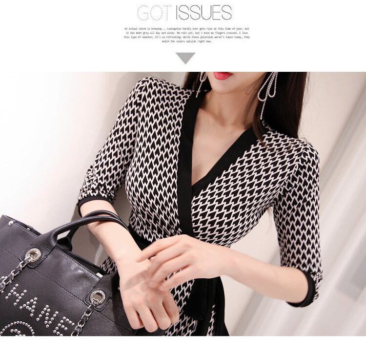 【dress】気質満点レトロ着痩せスリットプリントVネックワンピース