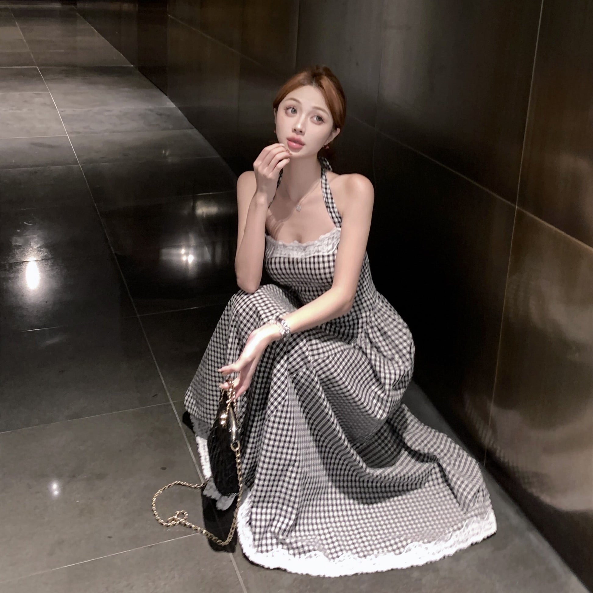 【dress】レース切り替えバックリボンチェック柄ワンピースF7789