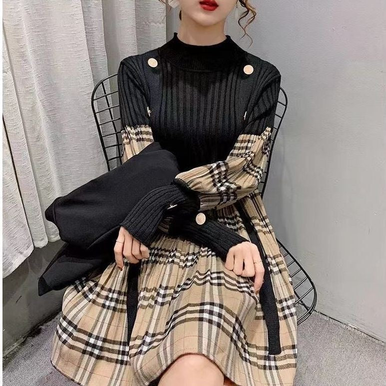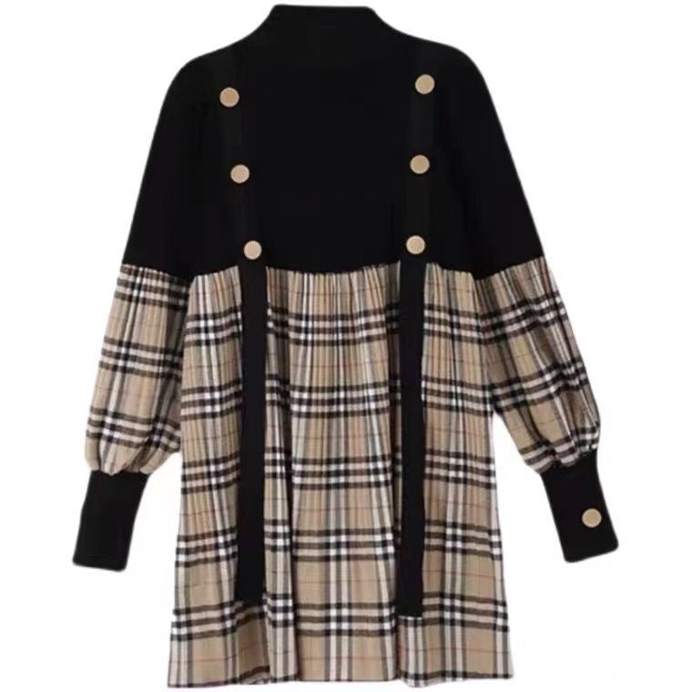 【dress】長袖切り替えチェック柄ワンピースF8136
