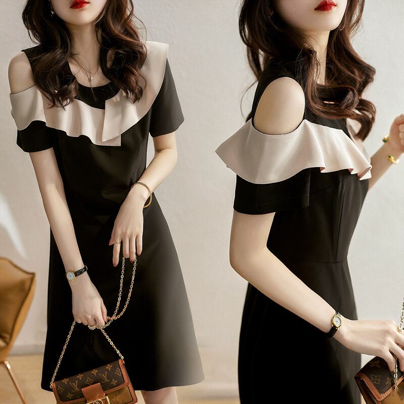 【dress】美感いっぱい? ?オフショルダーフリルデザイン配色デートワンピースF0048