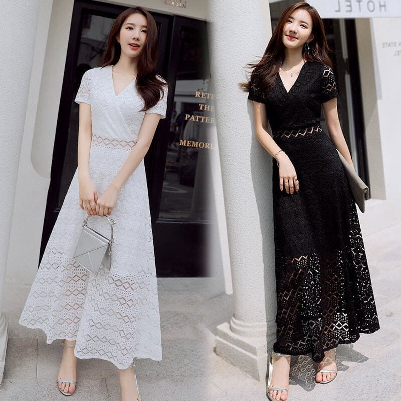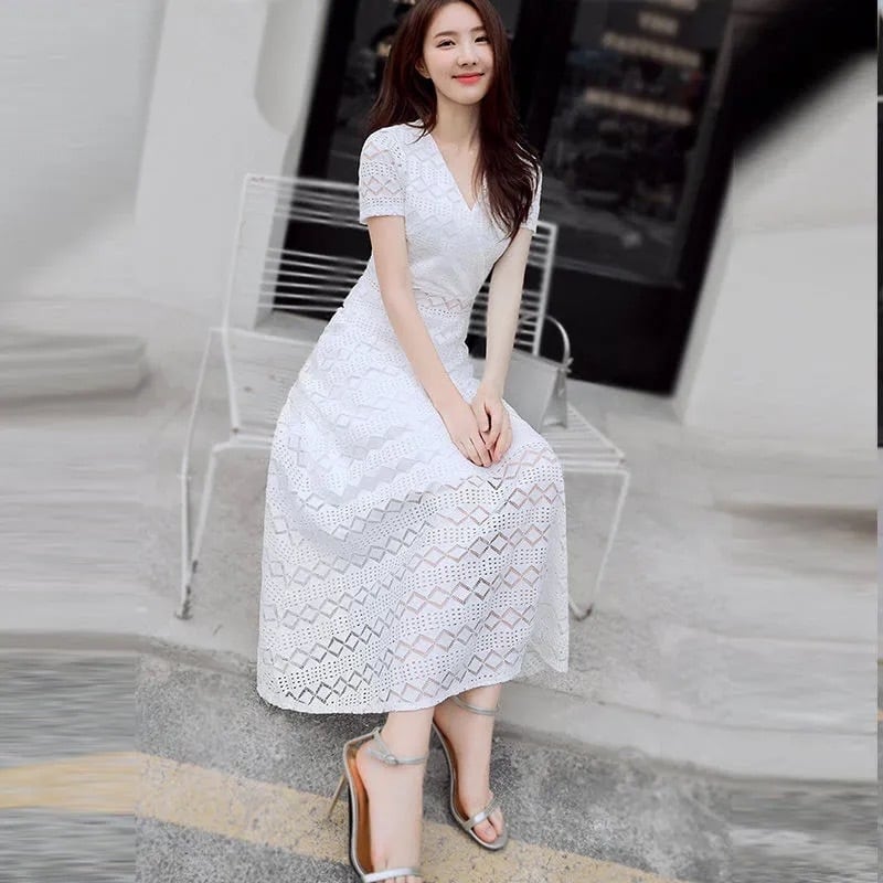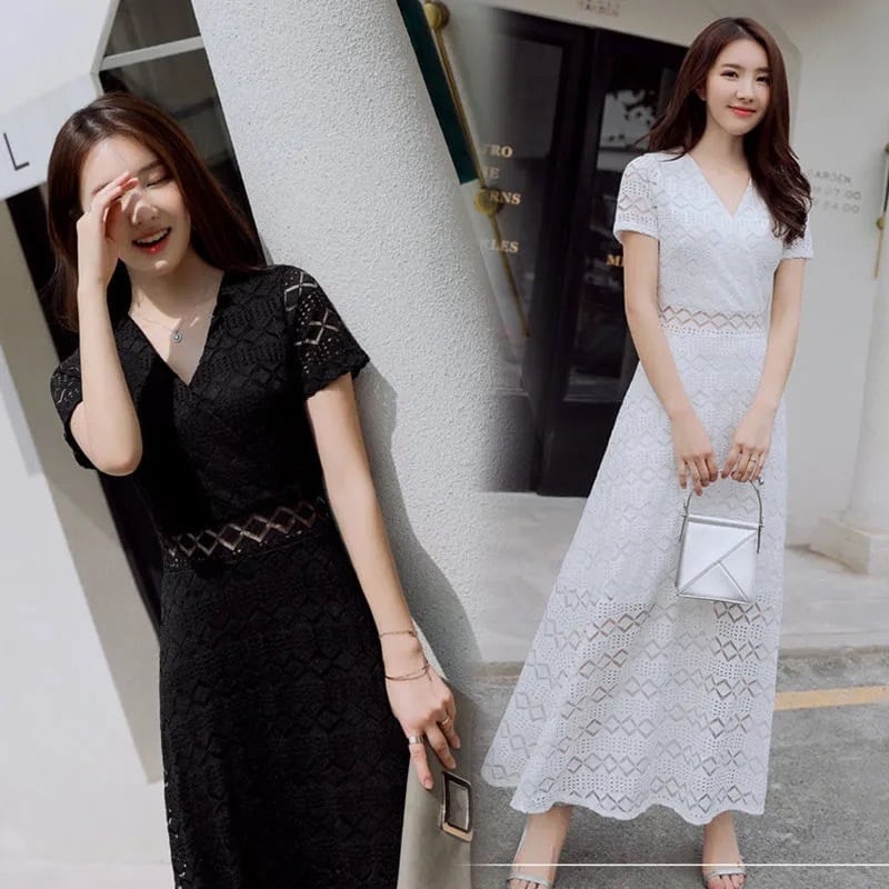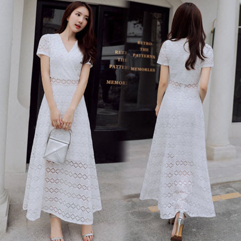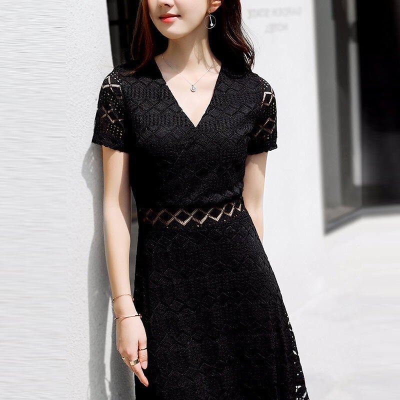 【dress】今季トレンドレース着痩せハイウエストAライン透かし彫り無地ワンピースF0117