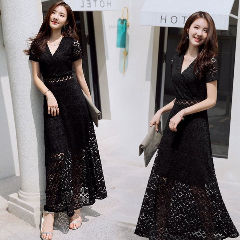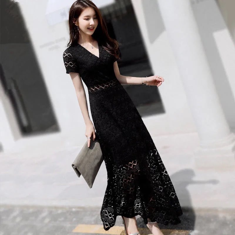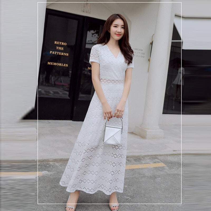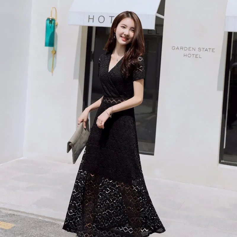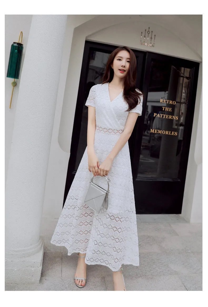 【dress】今季トレンドレース着痩せハイウエストAライン透かし彫り無地ワンピースF0117