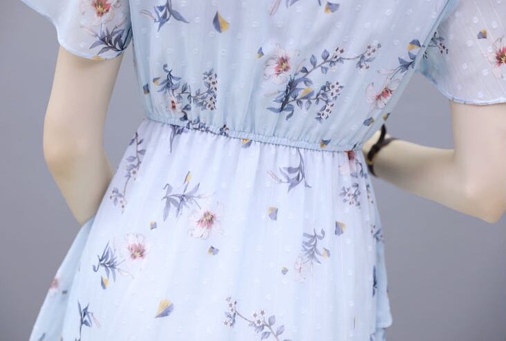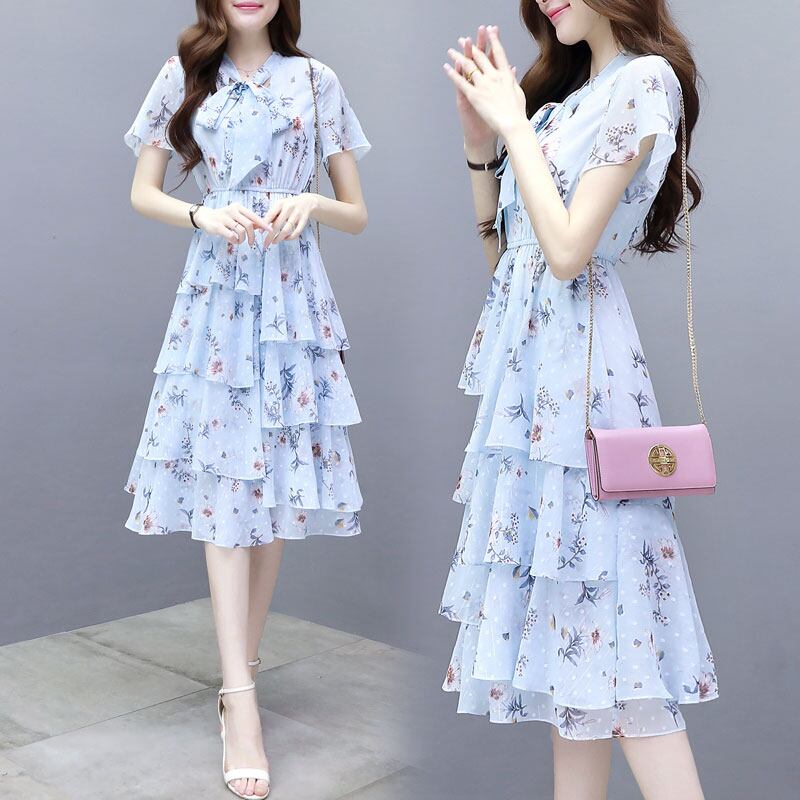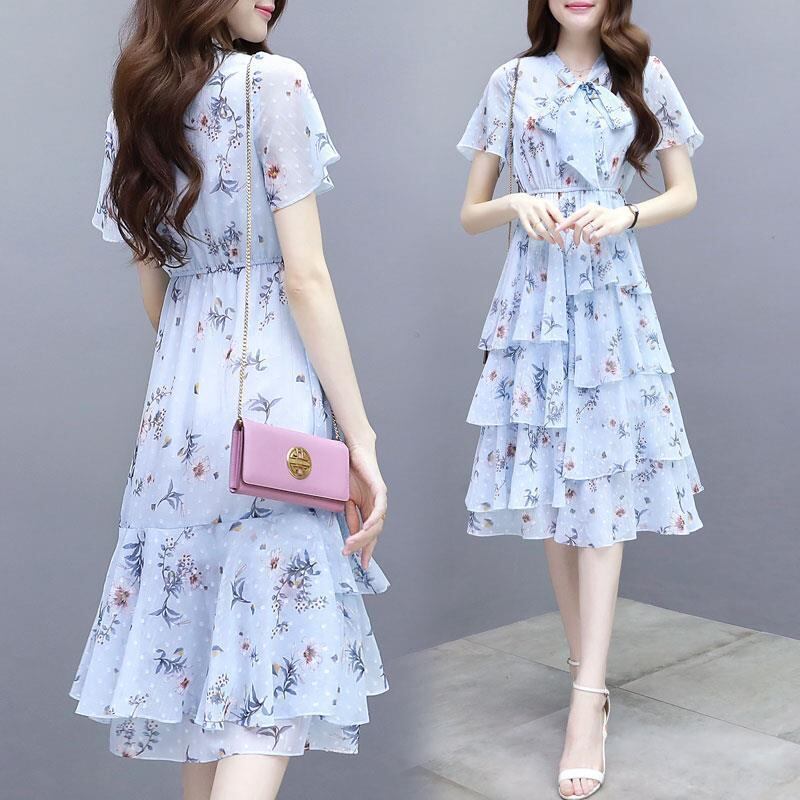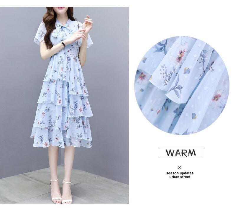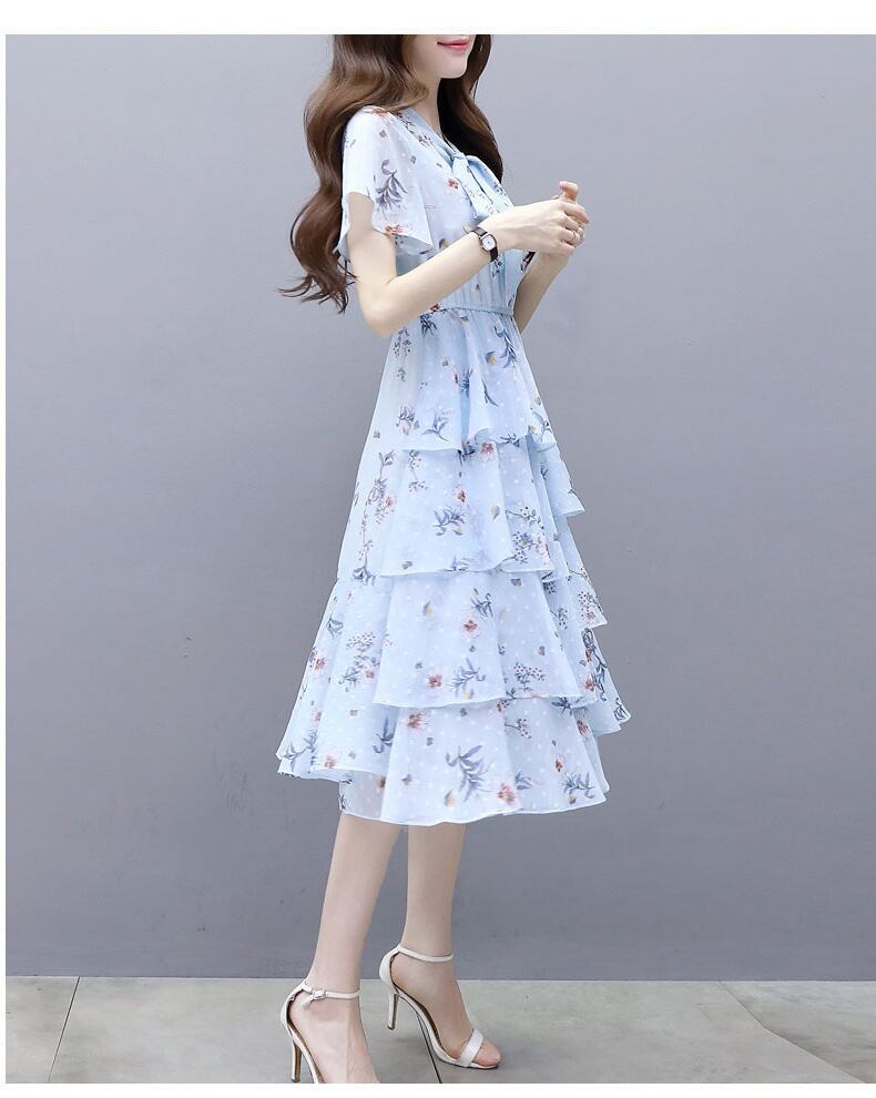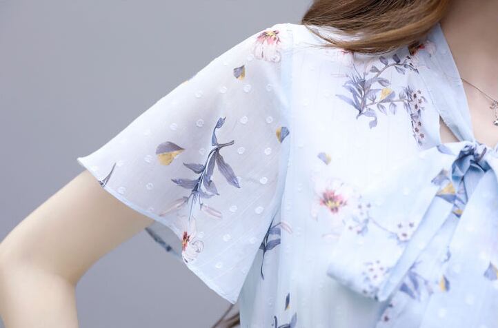【dress】清新スウィート〜タイカラーフレアスリーブ韓国風ギャザー花柄ワンピースF0296