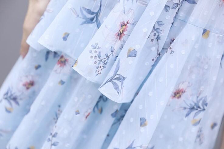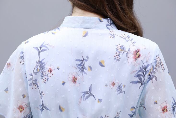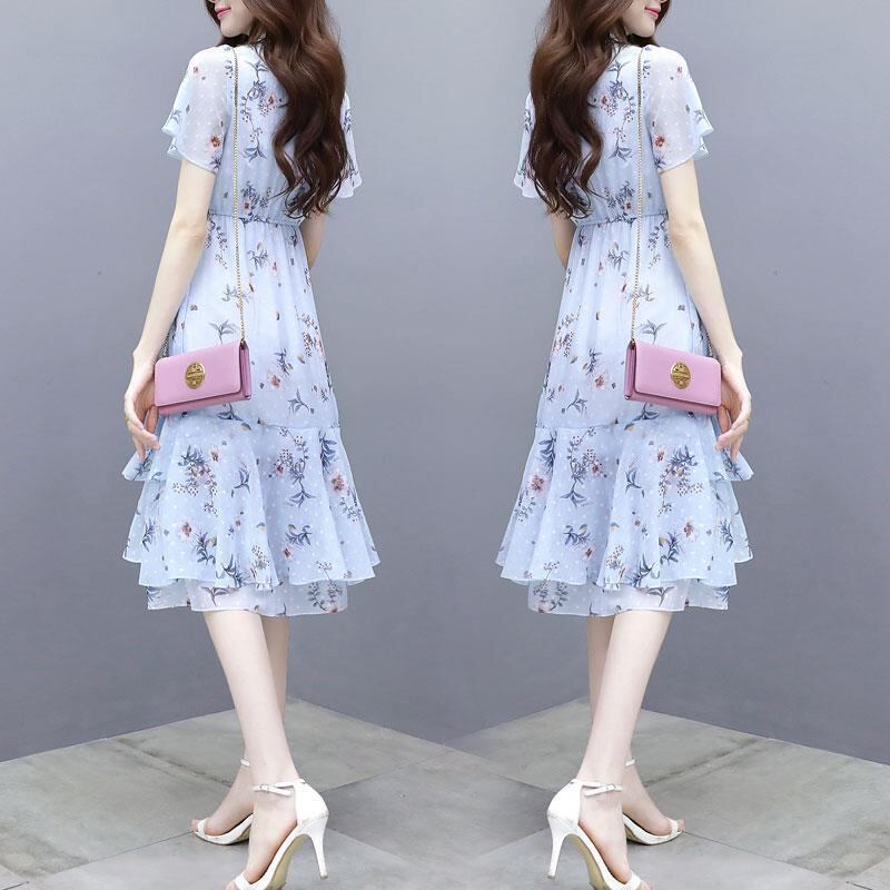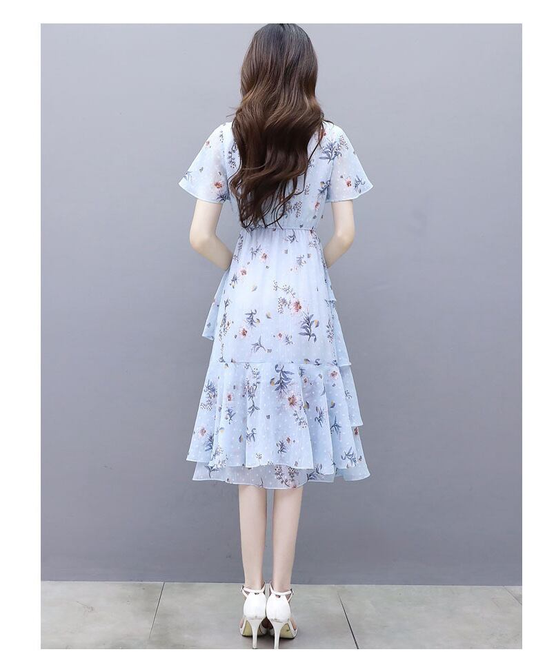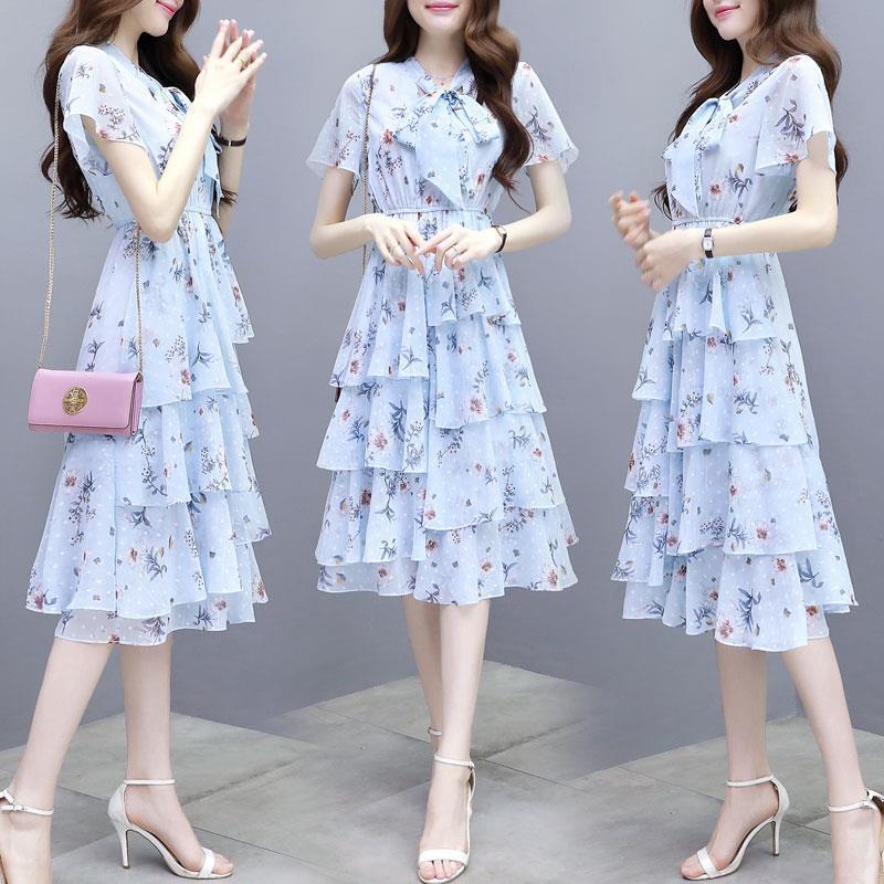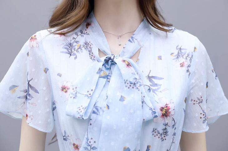 【dress】清新スウィート〜タイカラーフレアスリーブ韓国風ギャザー花柄ワンピースF0296