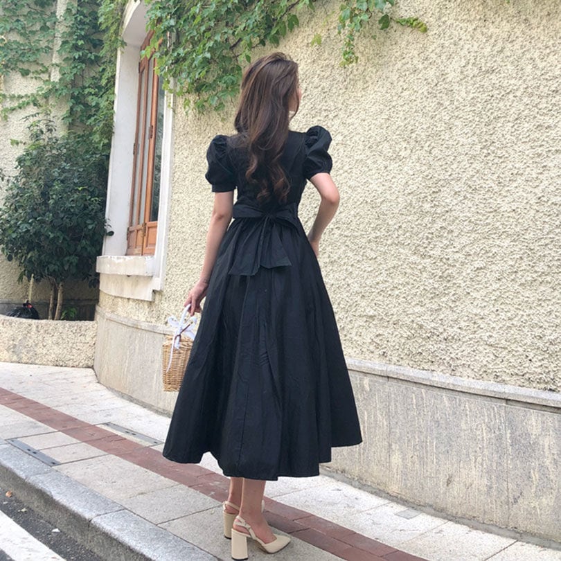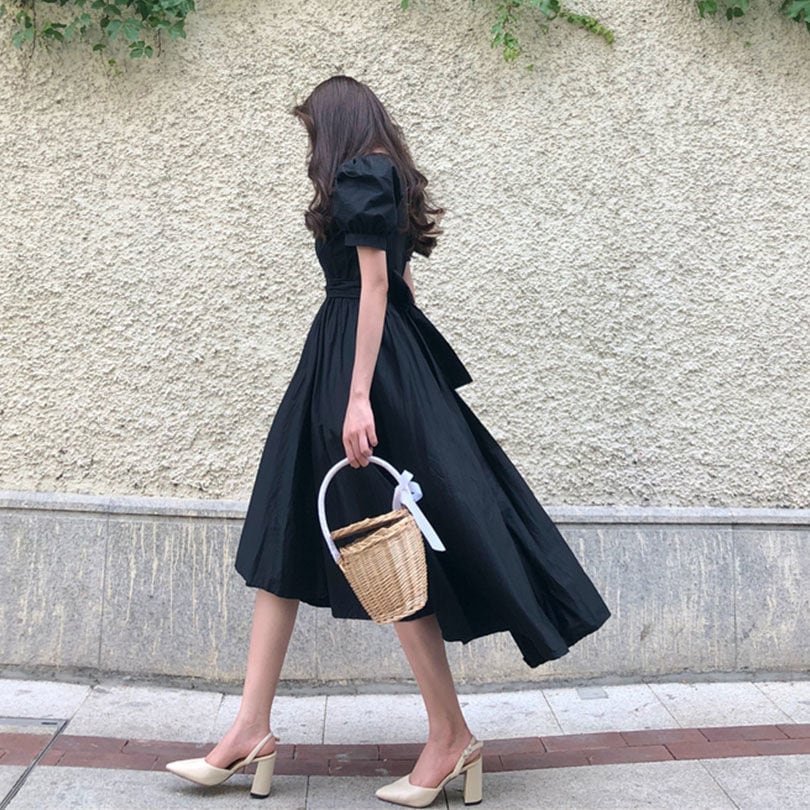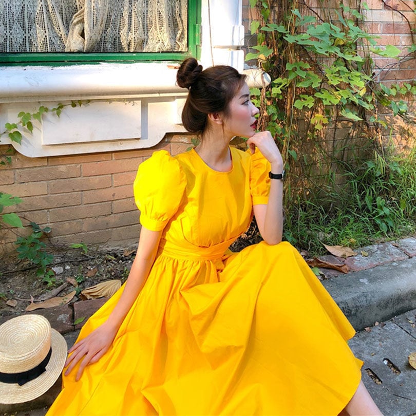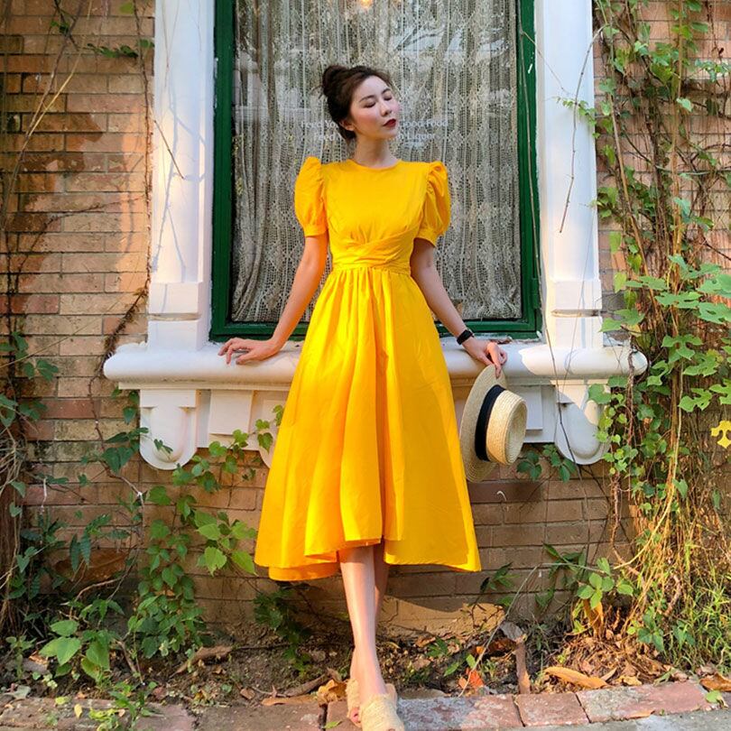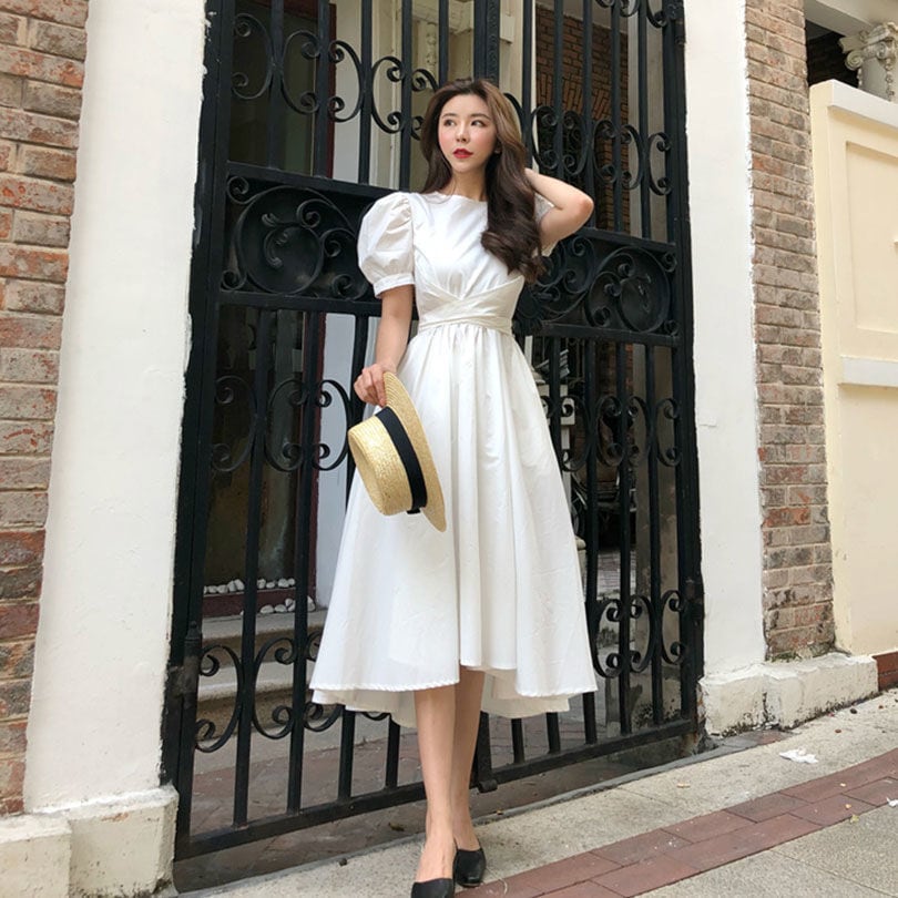 【dress】一目惚れ!ラウンドネック半袖パフ袖体型カバーファッション無地ワンピースF0627