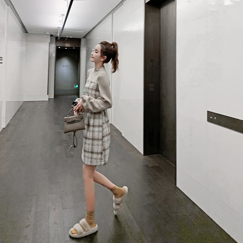 【dress】店長推薦韓国ファッション長袖ラウンドネック切り替えチェック柄ワンピースF0784