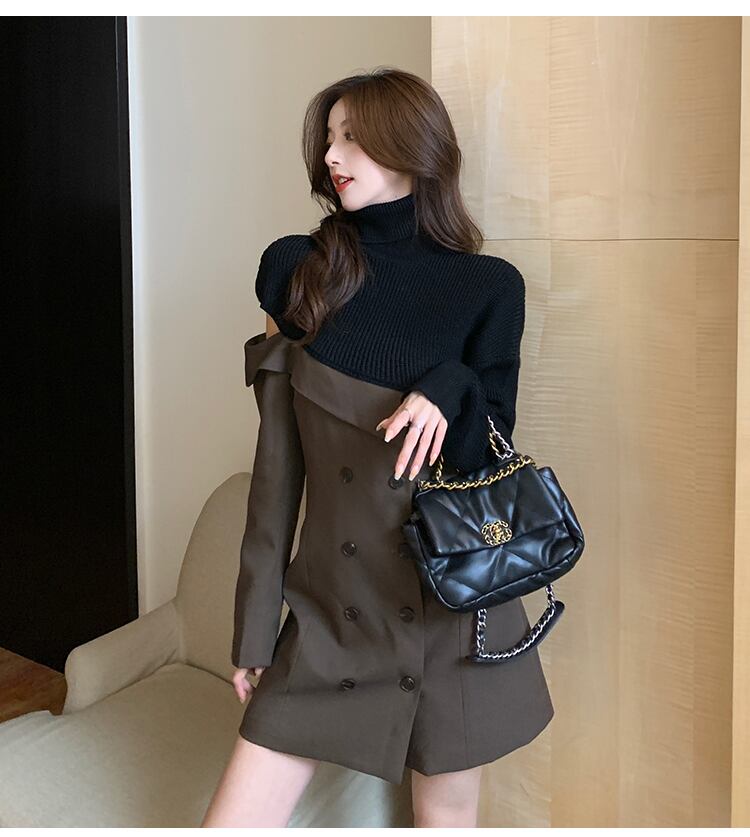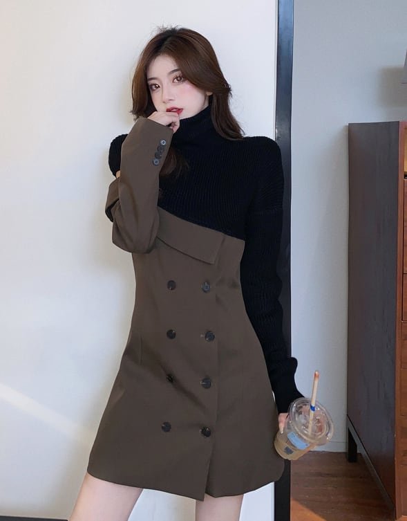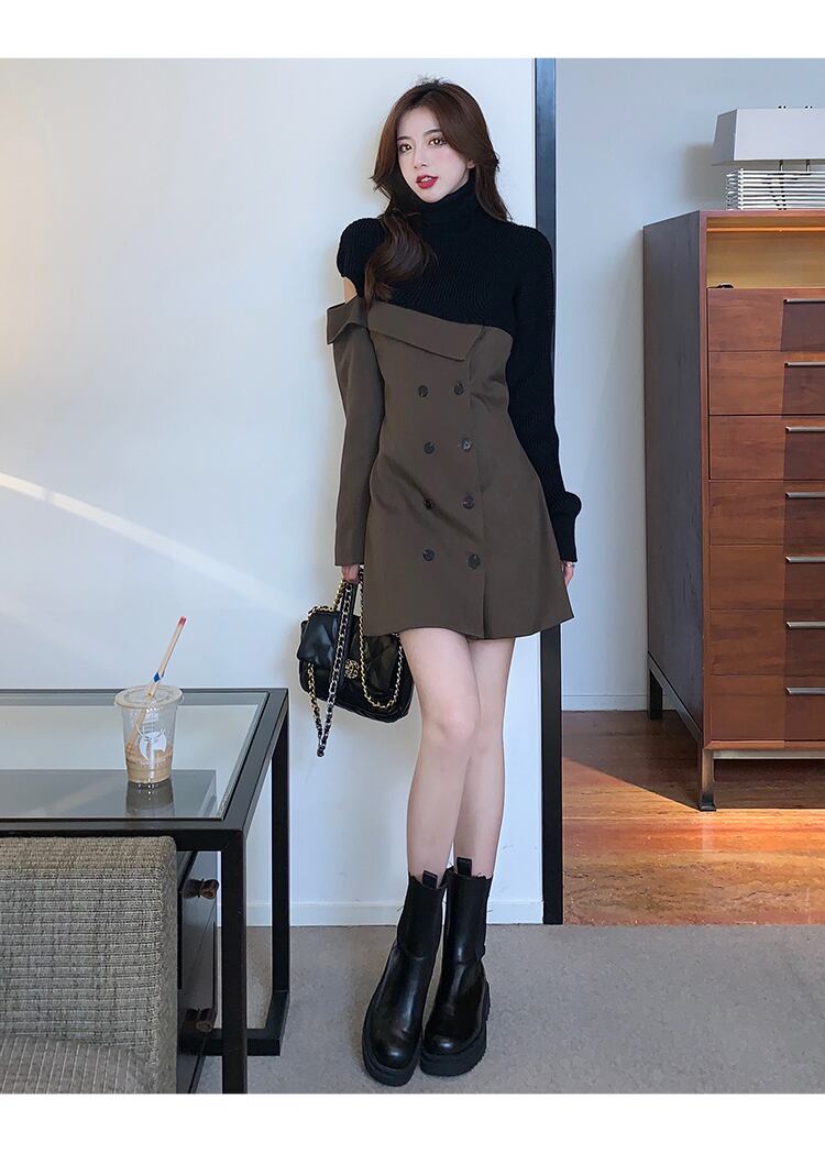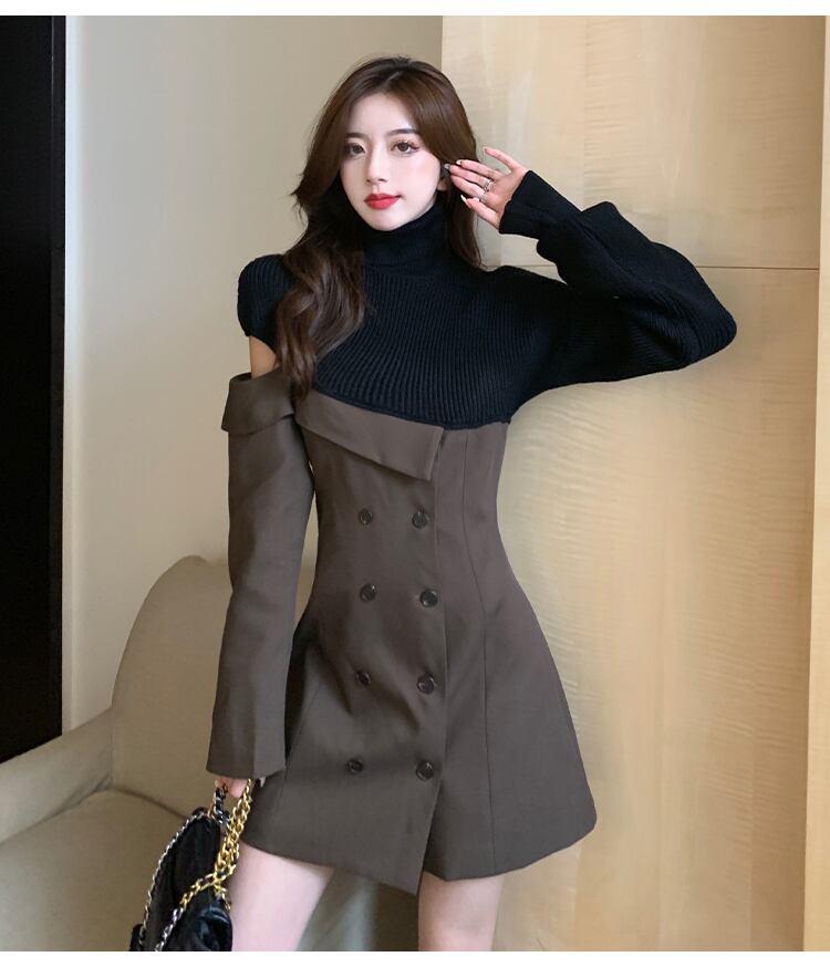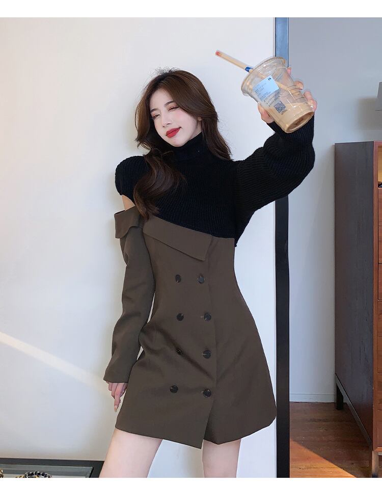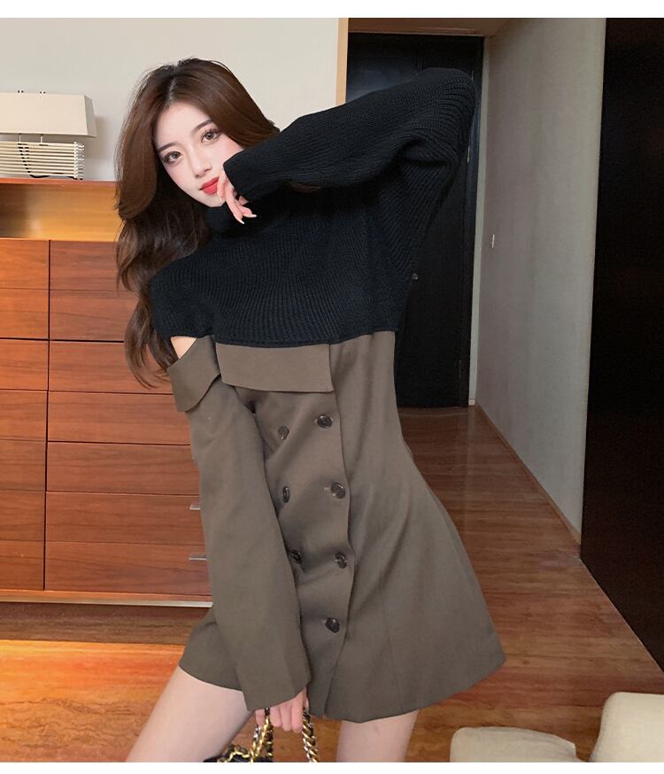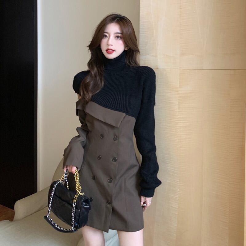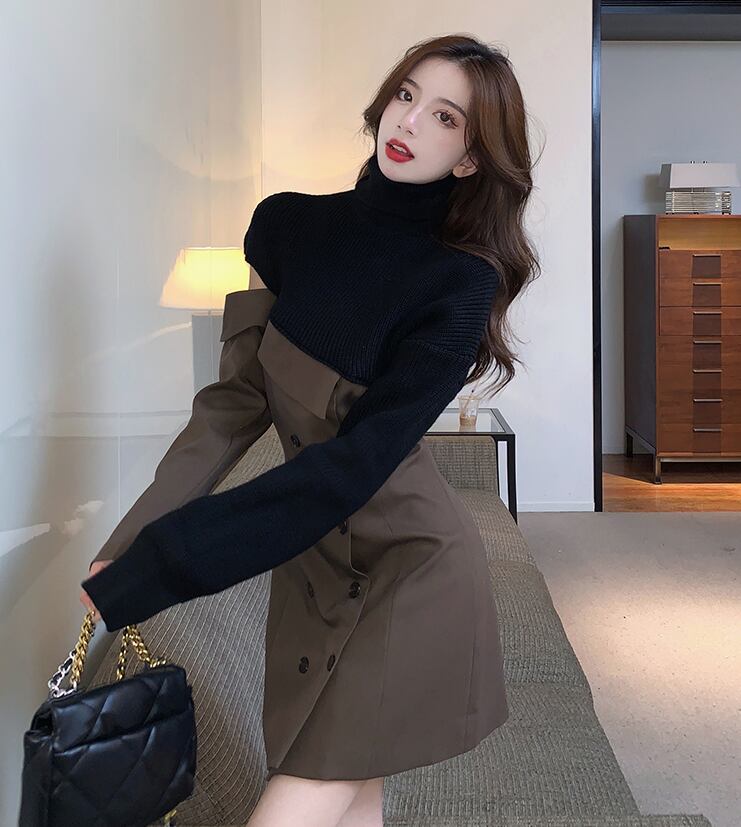 【dress】一目惚れ!ハイネック長袖ニット替え体型カバーファッション配色ワンピースF0972