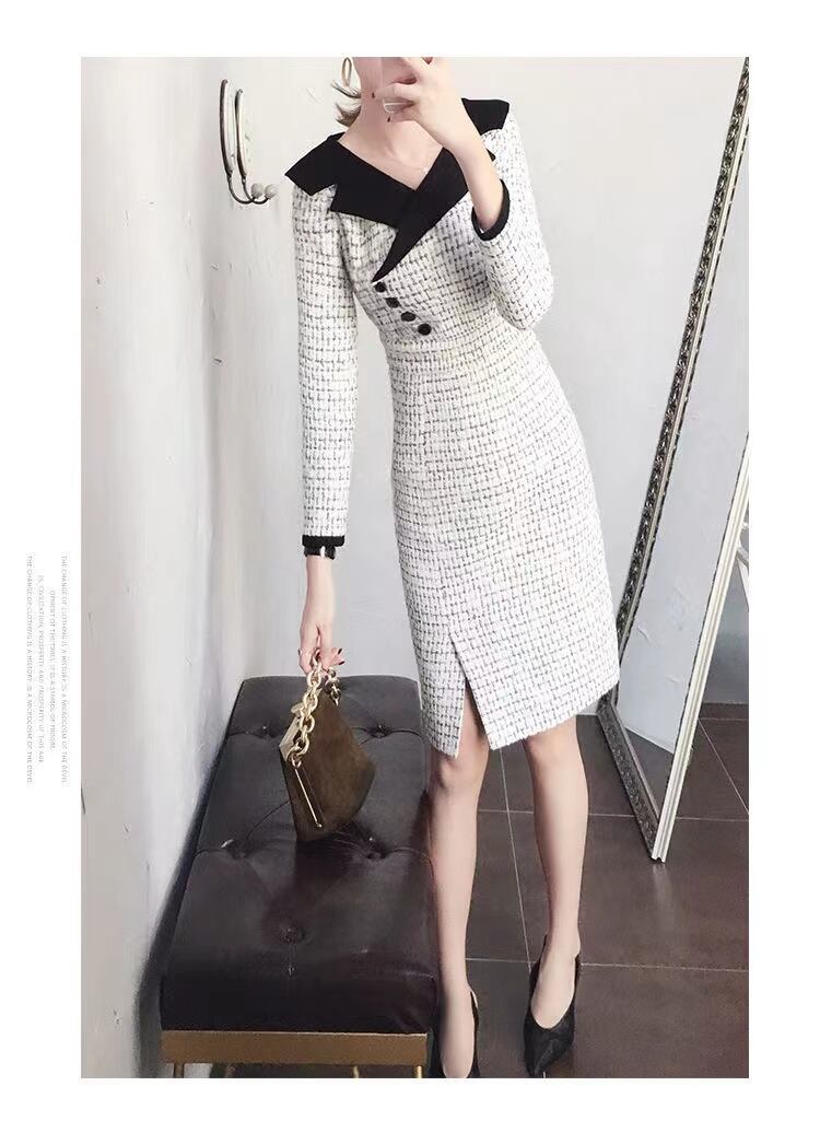 【dress】気質溢れる♪韓国風ラペル長袖スリットチェック柄体型カバー配色タイトフォーマルワンピースF1407