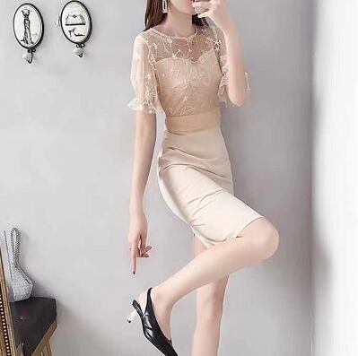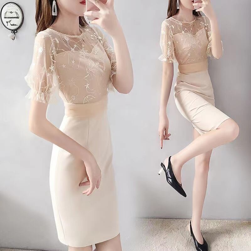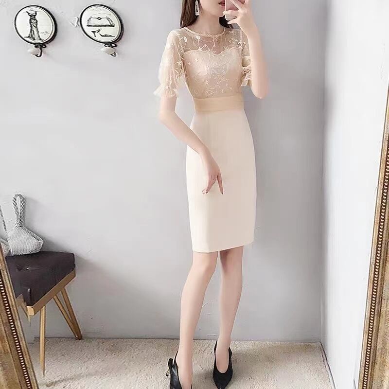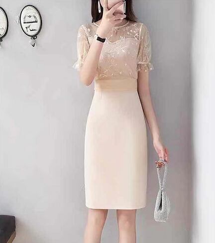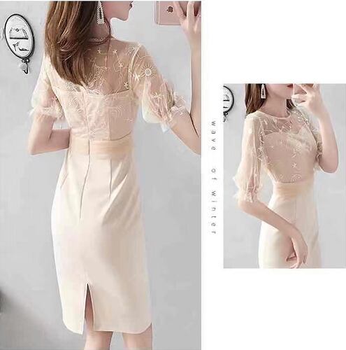 【dress】気質溢れる♪エレガントOL通勤ラウンドネックラッパ袖レース切り替えデートワンピースF2026