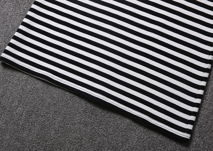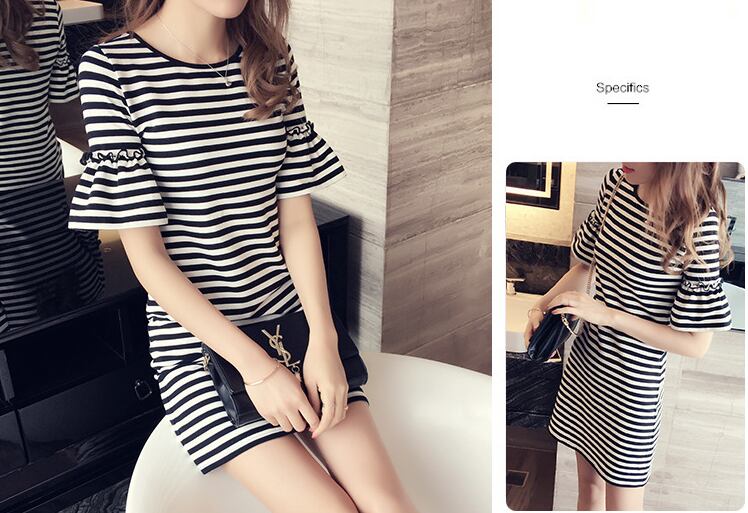 【dress】気質溢れる♪ラウンドネックラッパ袖半袖韓国ファッションボーダー柄ワンピースF2149