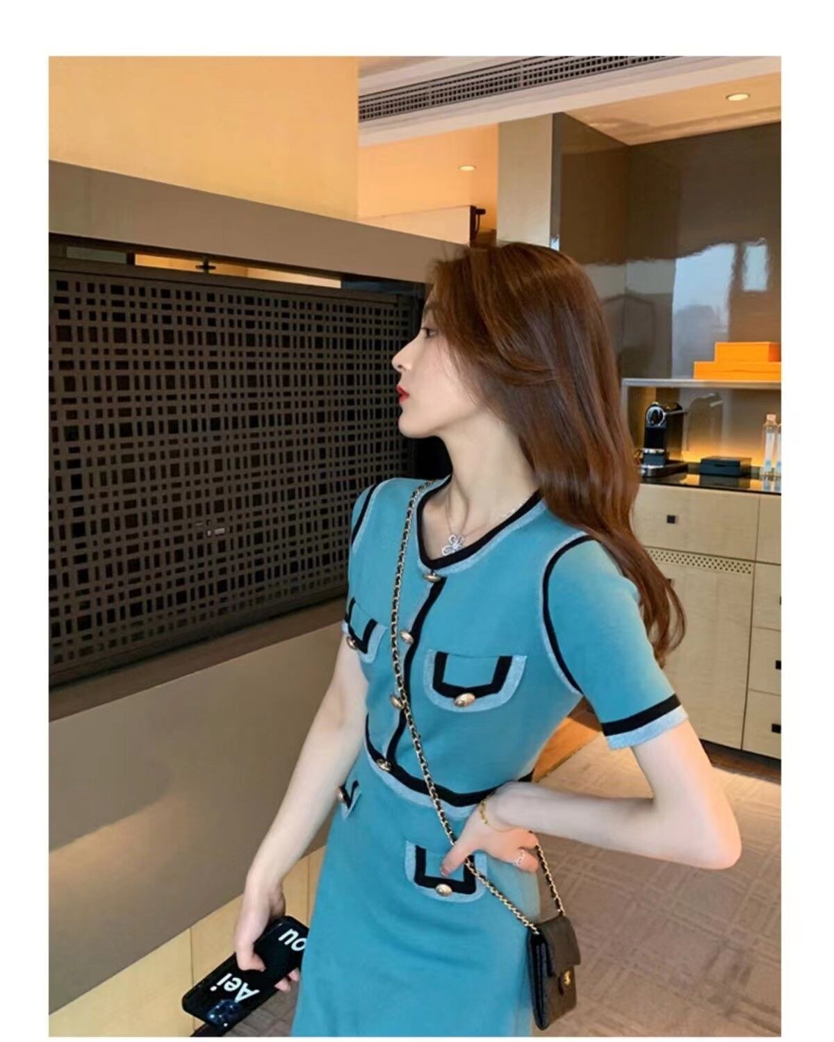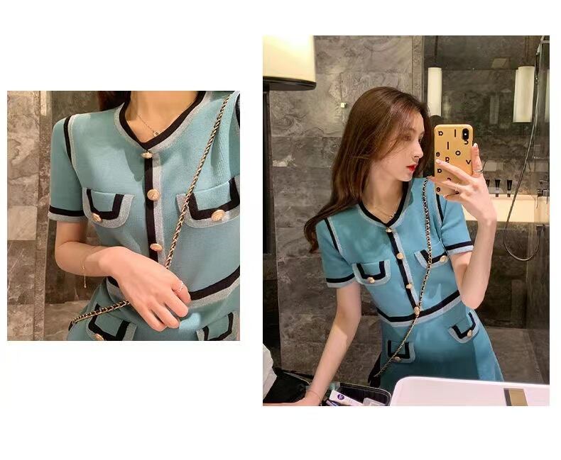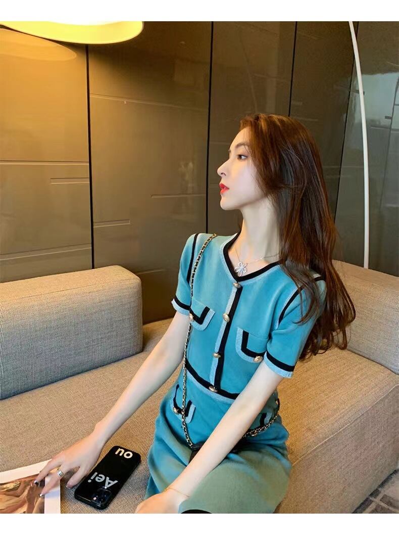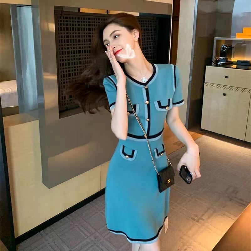 【dress】一目惚れ!2022夏新作韓国ファッションラウンドネック半袖配色薄手ニットセレブワンピースF2446