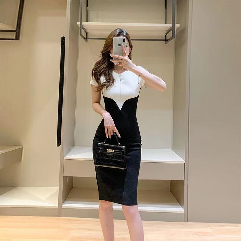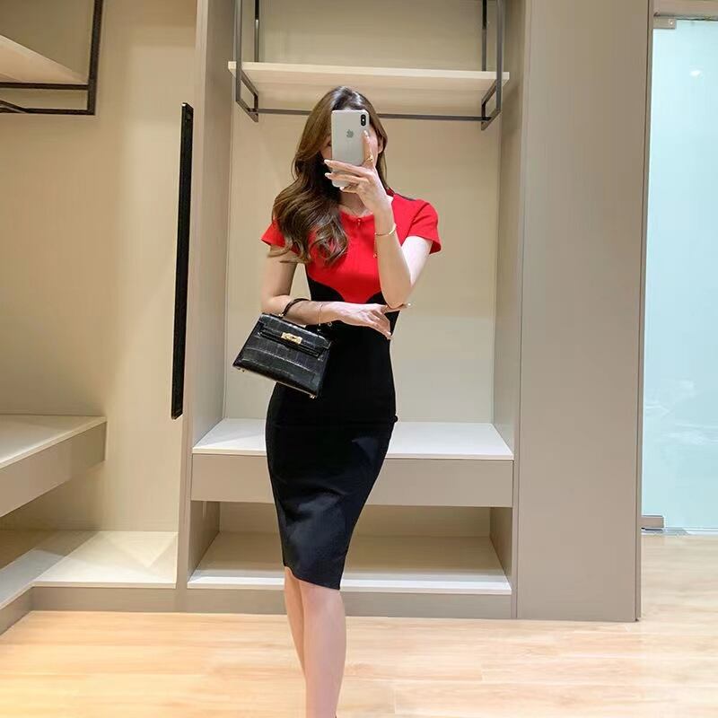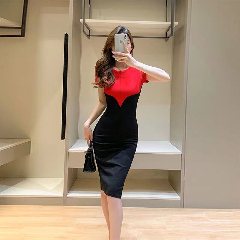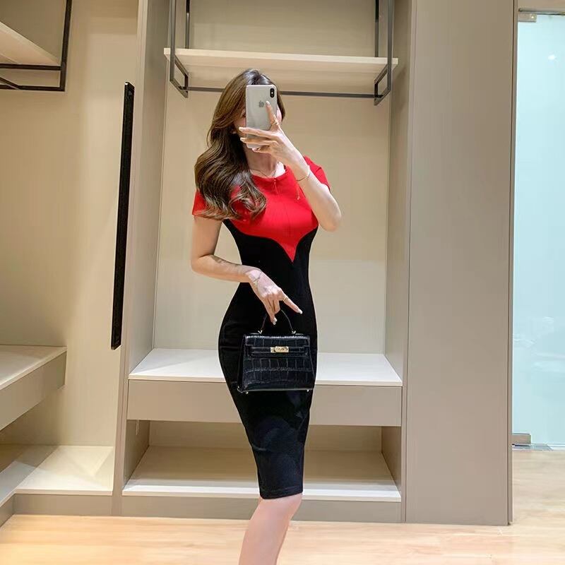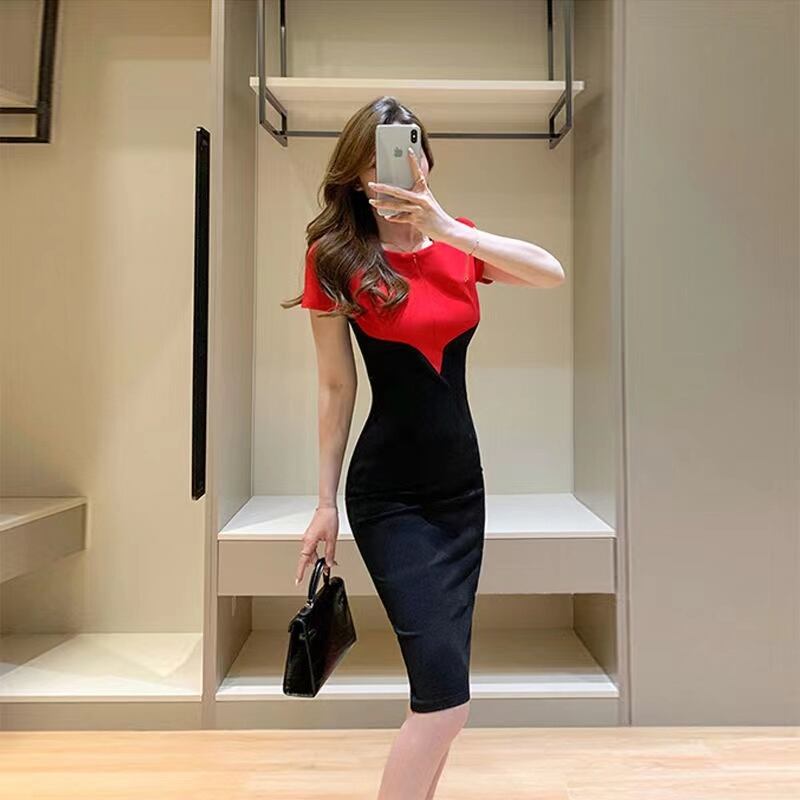 【dress】早い者勝ち夏新作2色ラウンドネック半袖配色韓国ファッションタイトワンピースF2630