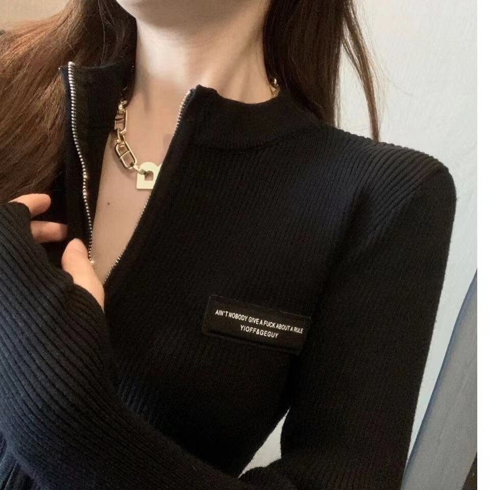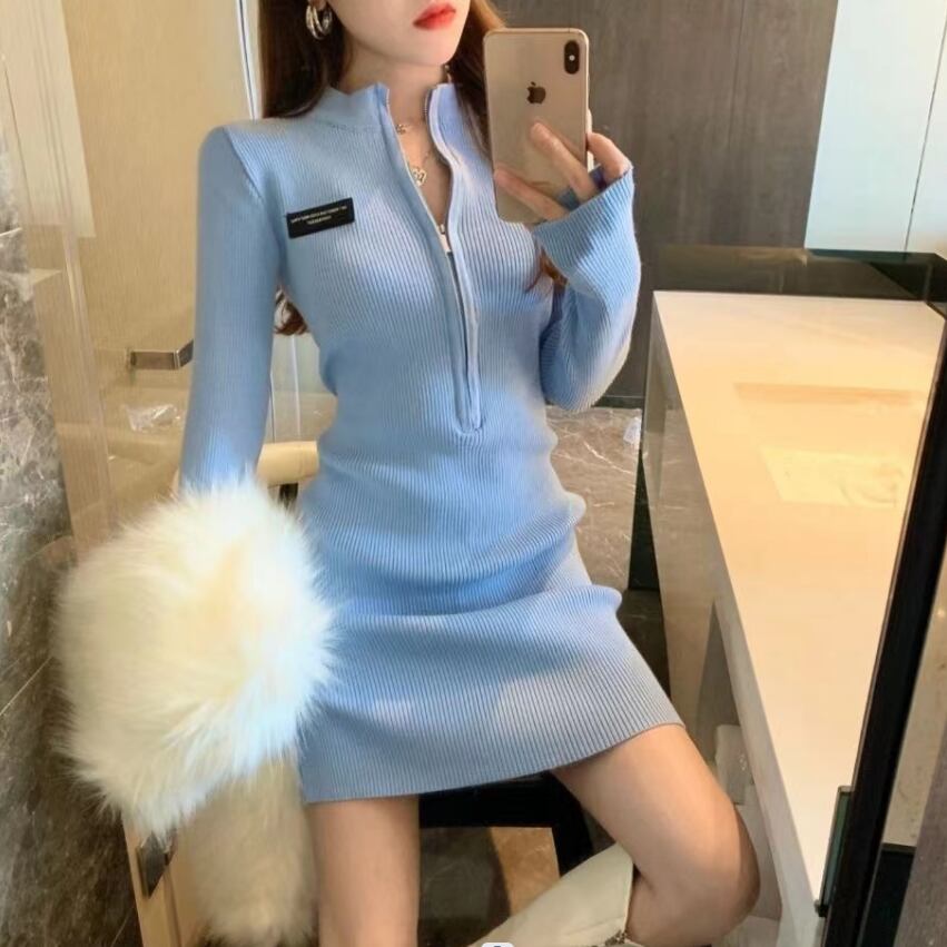 【dress】細身効果抜群♪韓国風INS風秋冬ファスナー長袖体型カバーニットワンピースF3523