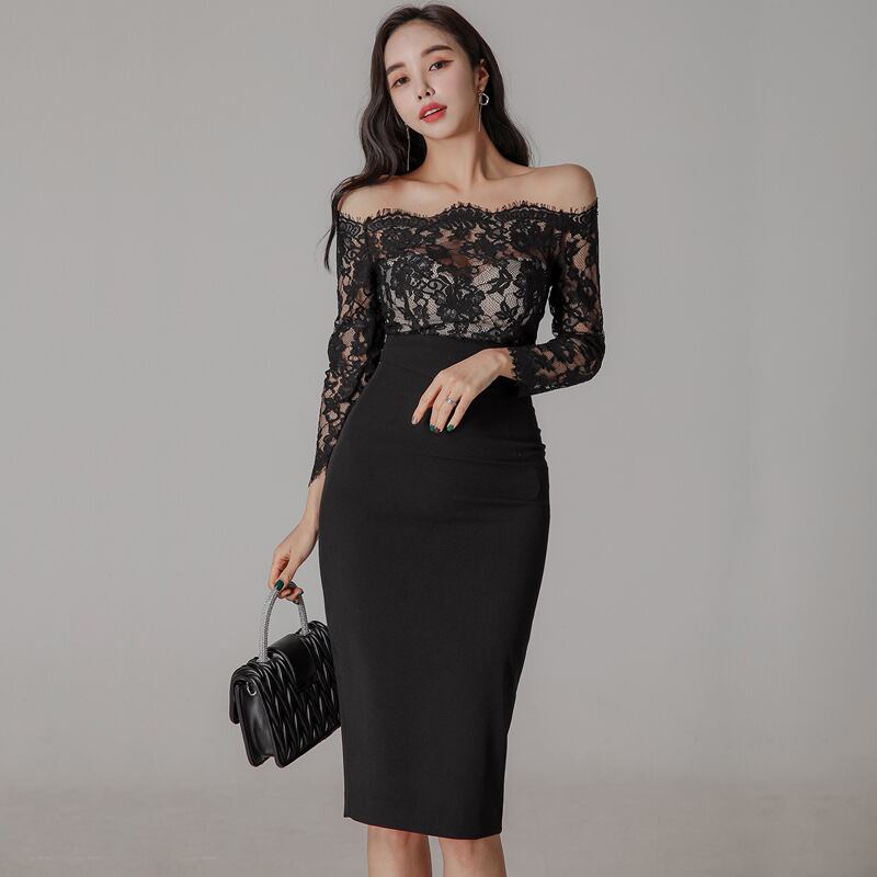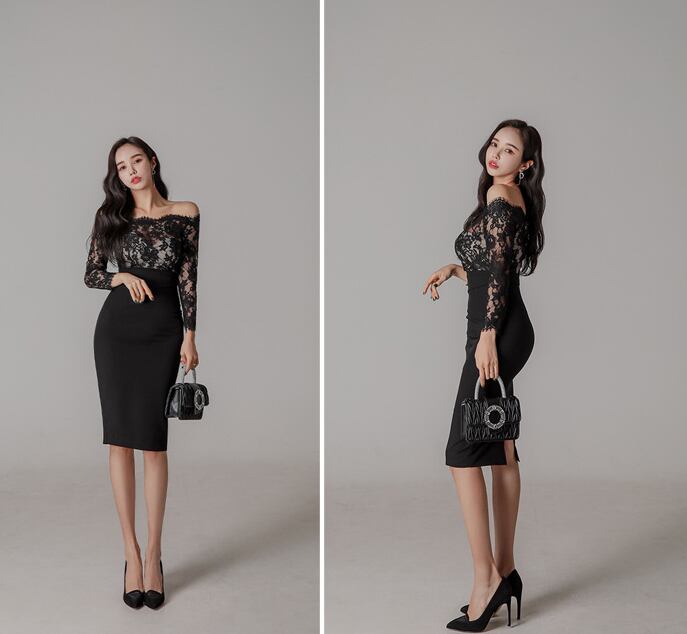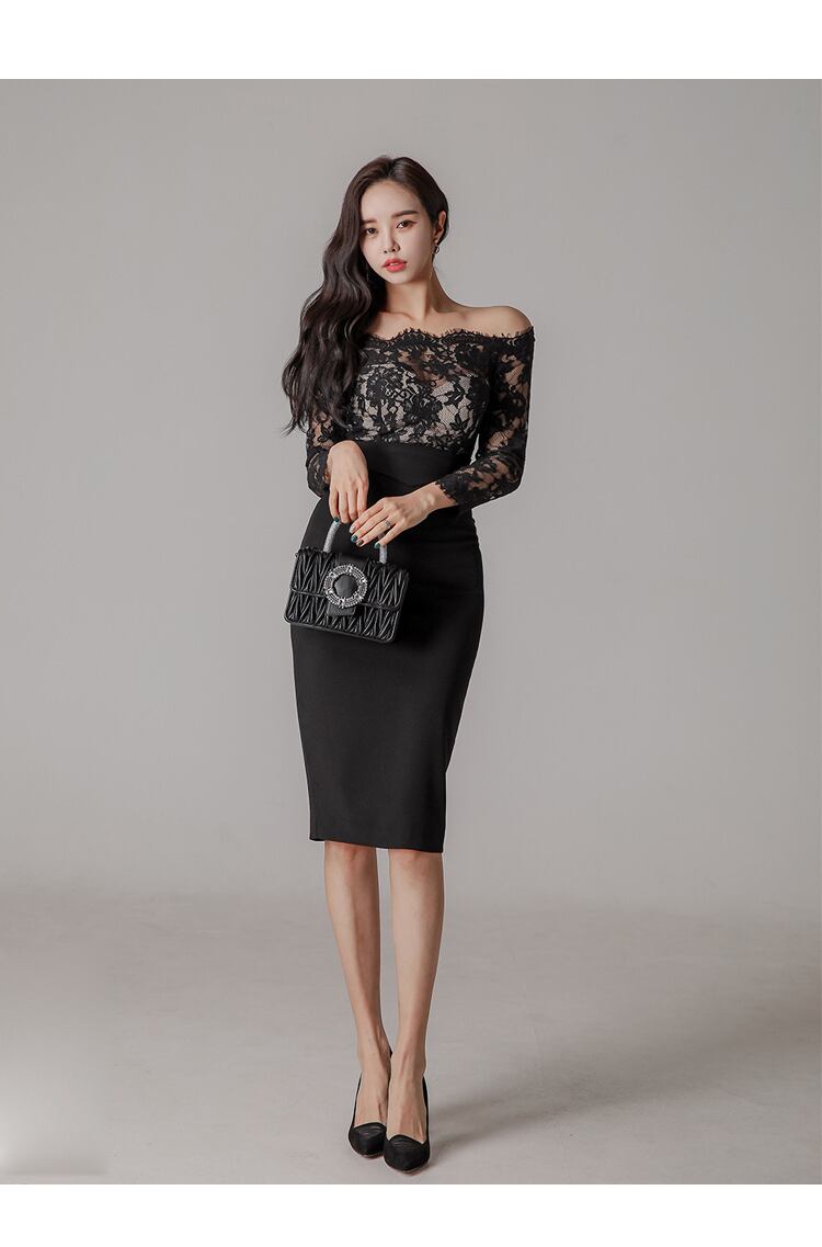 【dress】好感度100%フェミニン韓国風ボートネック長袖人気レース切り替えタイトワンピースF4503