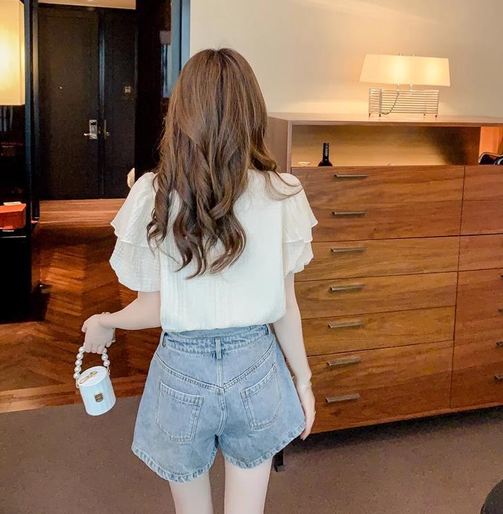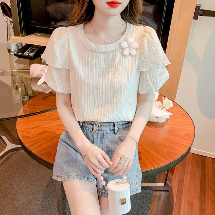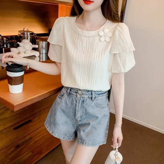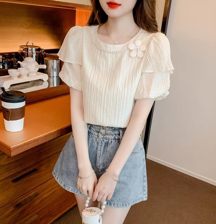 【tops】ラウンドネック半袖パフ袖ブラウスF7509