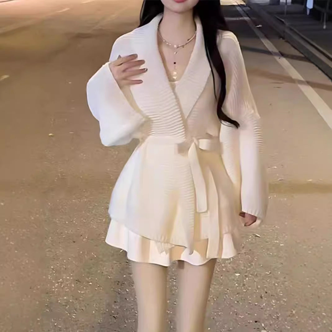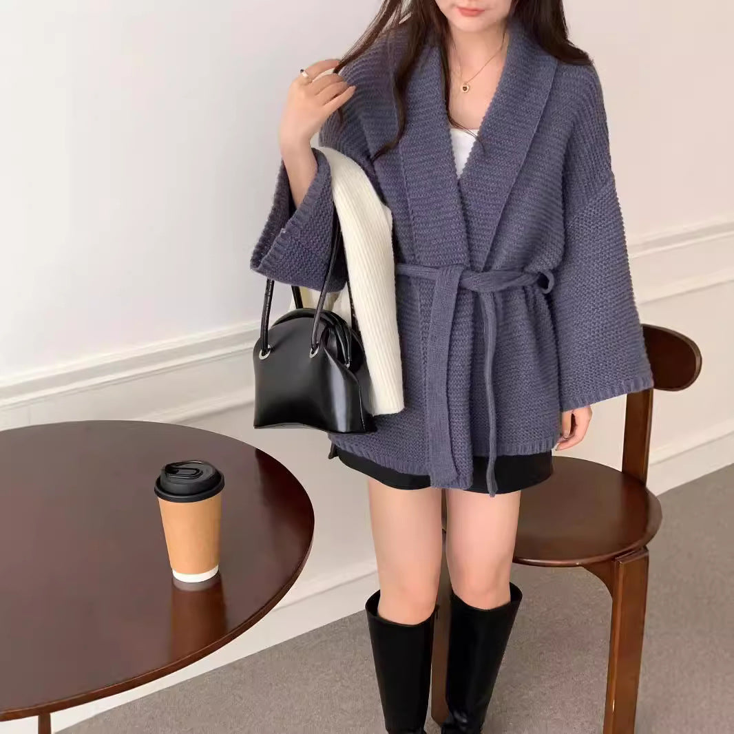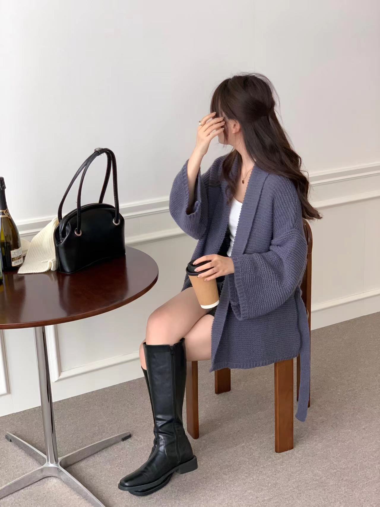 【outer】ウエストリボン長袖ニットカーディガンF8349