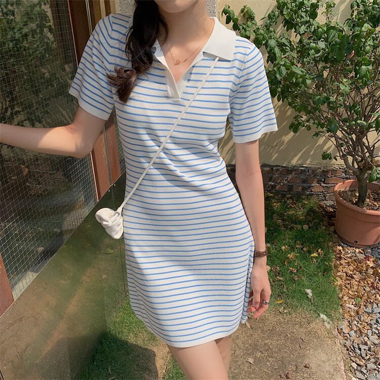 【dress】韓国風スウィートVネック着痩せストライプ柄ニットワンピース G0210