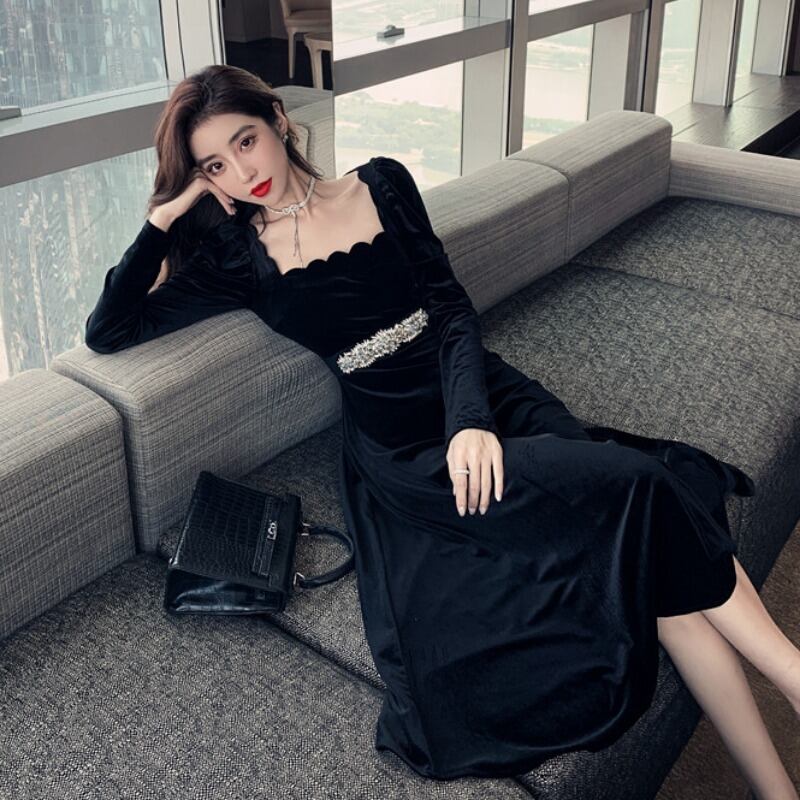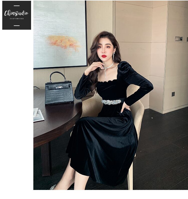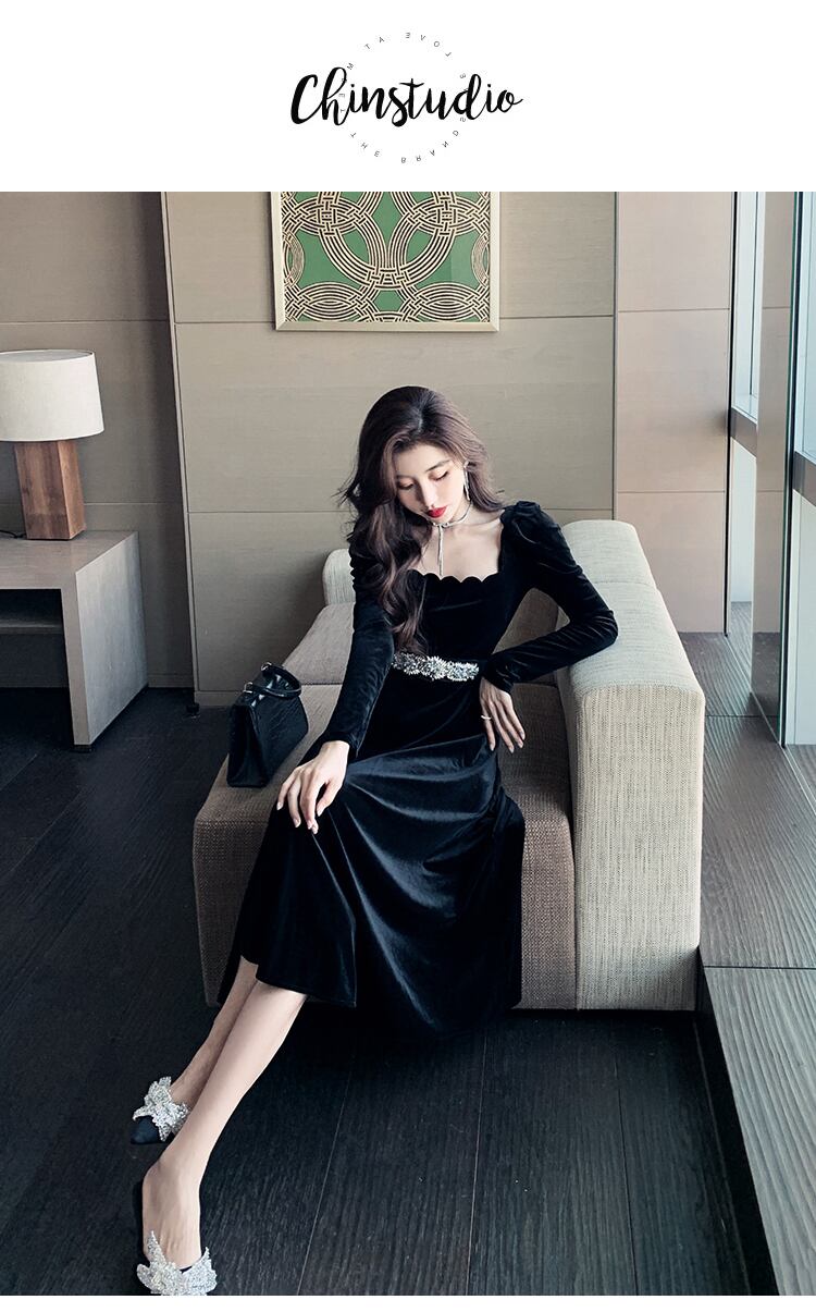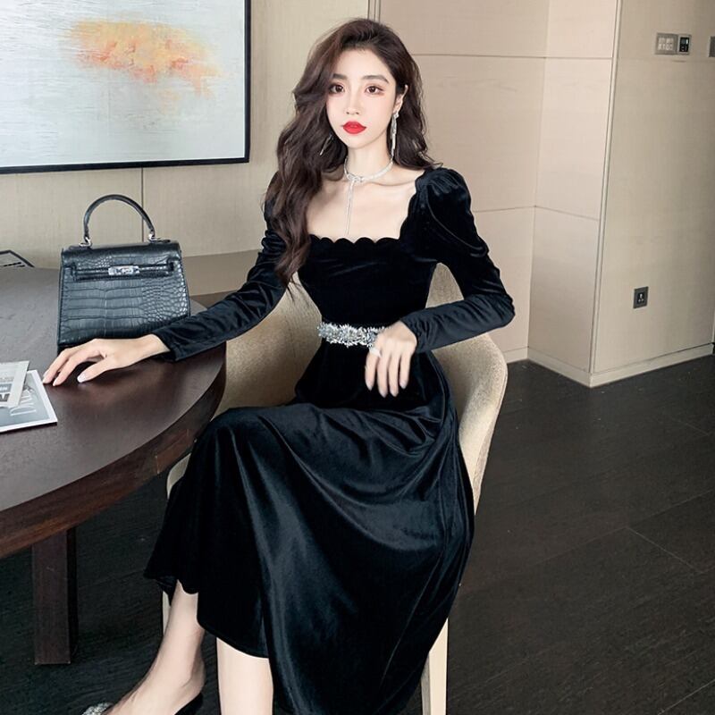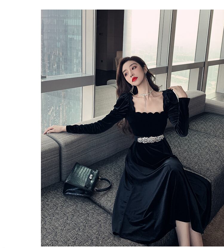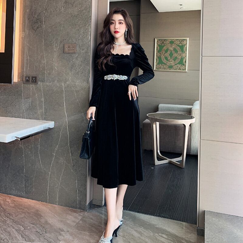 【dress】美人度アップ!気質満点ハイウエスト長袖 スクエアネックワンピース G1418