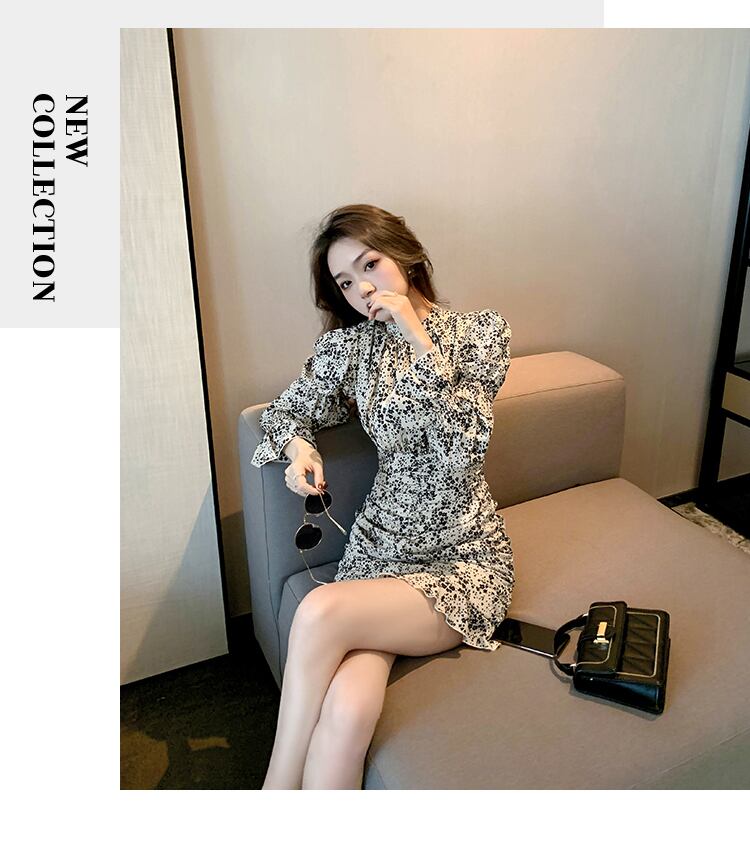 【dress】気質満点 レトロスタンドネックタイト不規則花柄ワンピース G1631