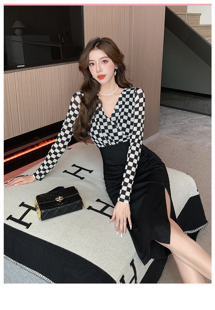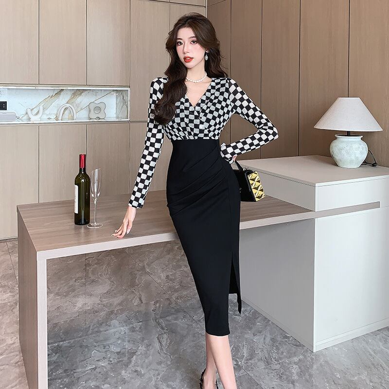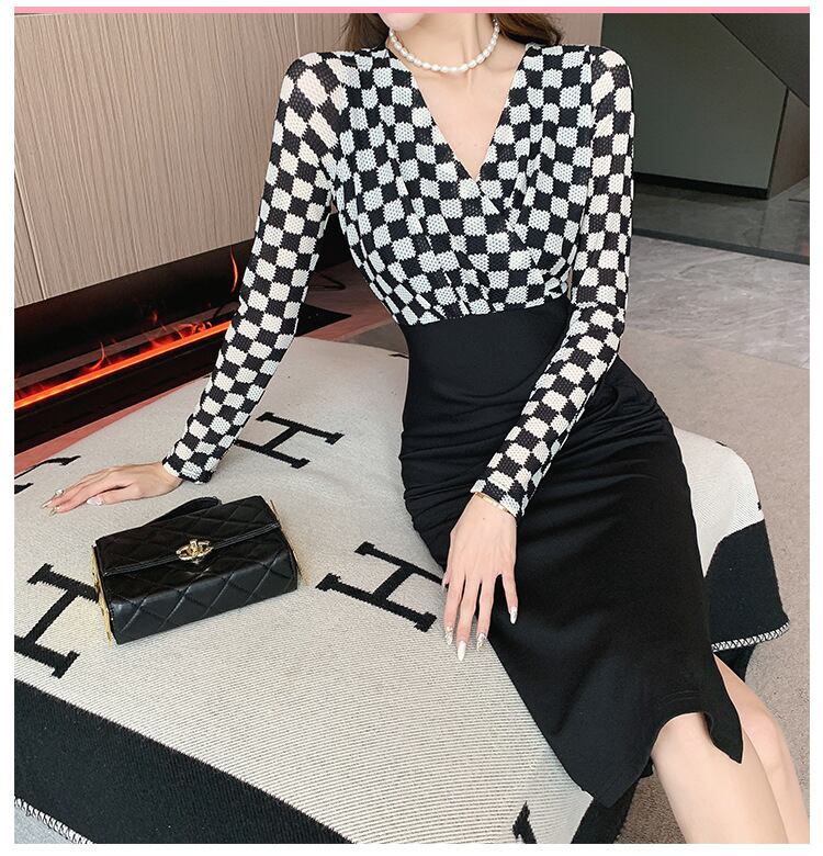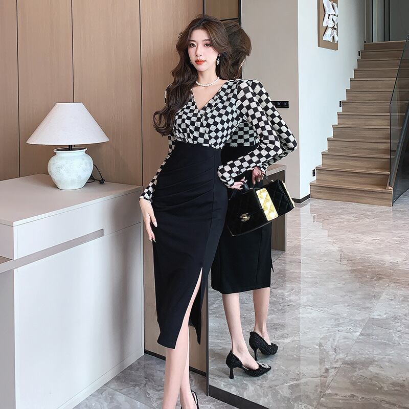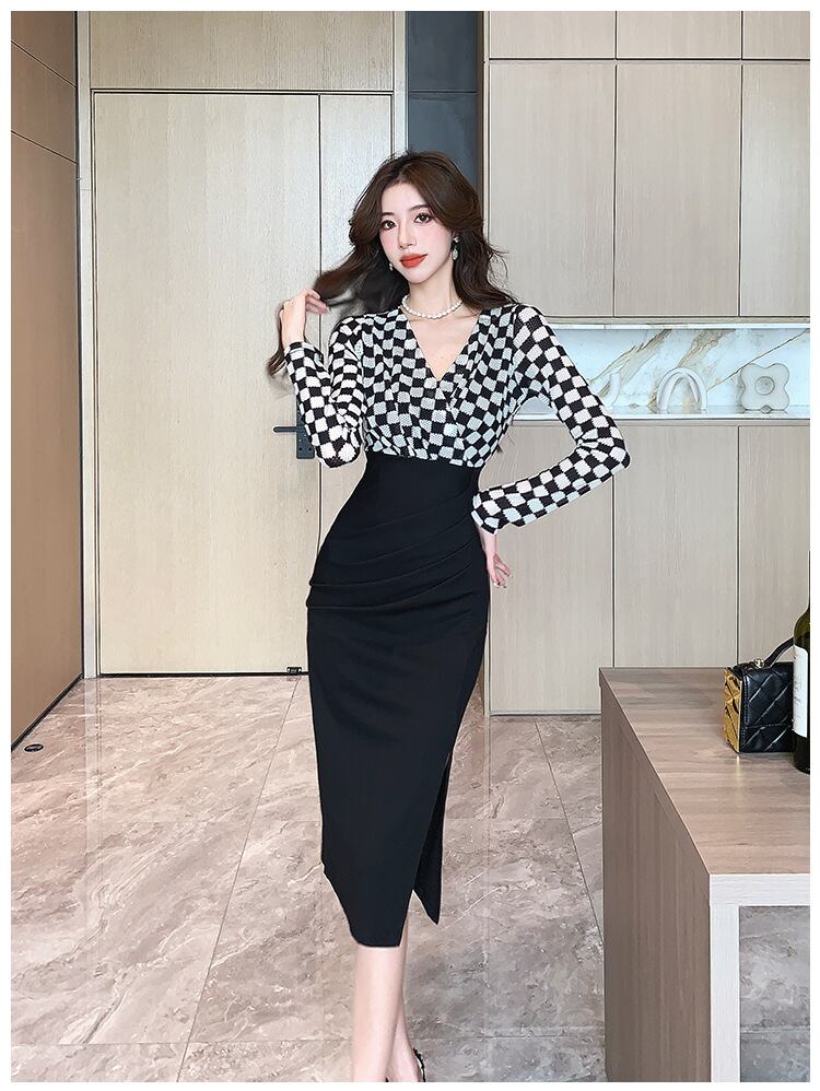 【dress】Vネック長袖切り替えワンピースG16919