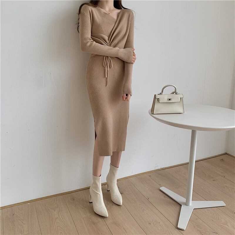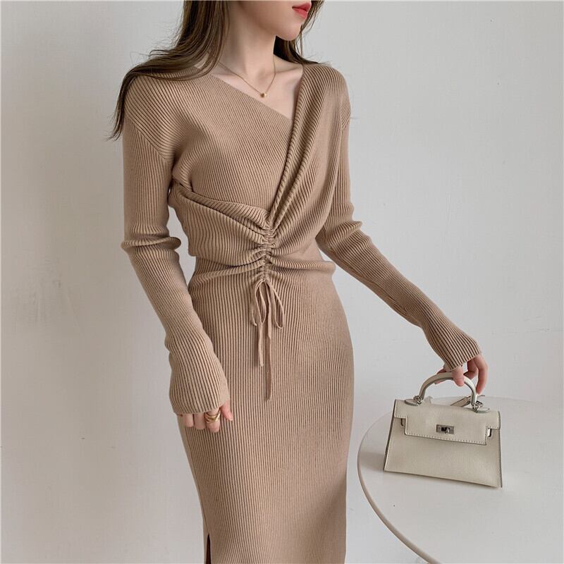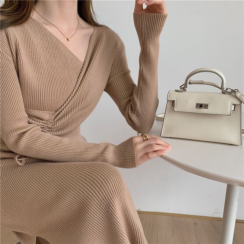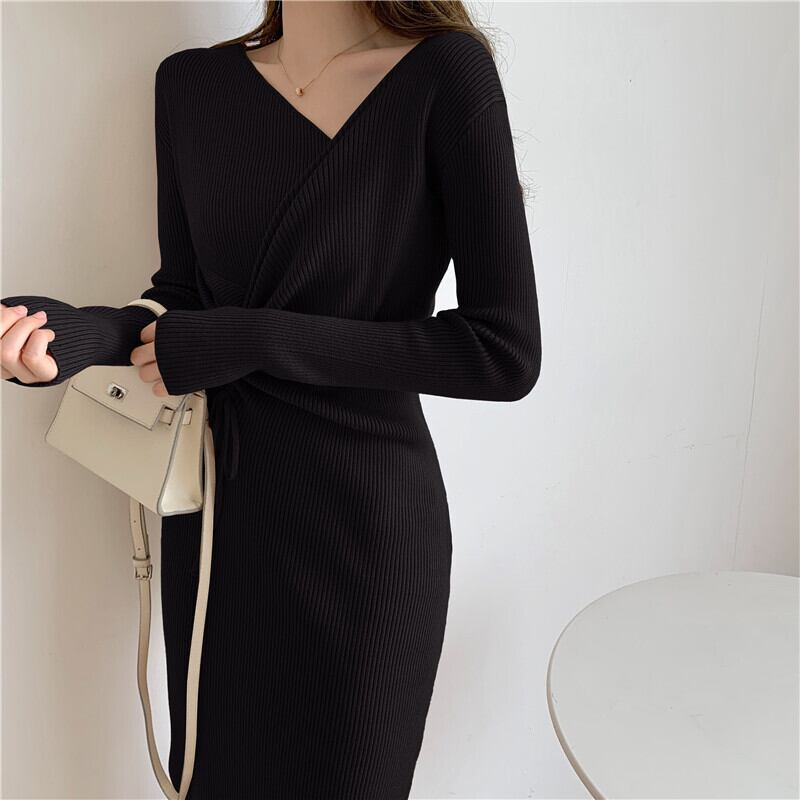 【dress】上品な質感!気質満点体型カバー長袖Vネックニットワンピース G1895