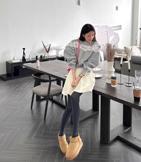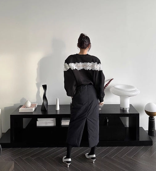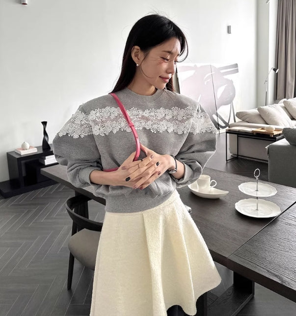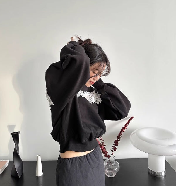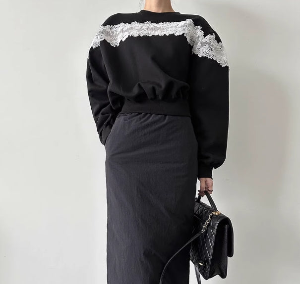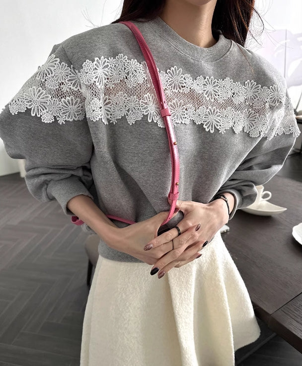 【tops】ラウンドネック切り替えレース長袖パーカーG23296
