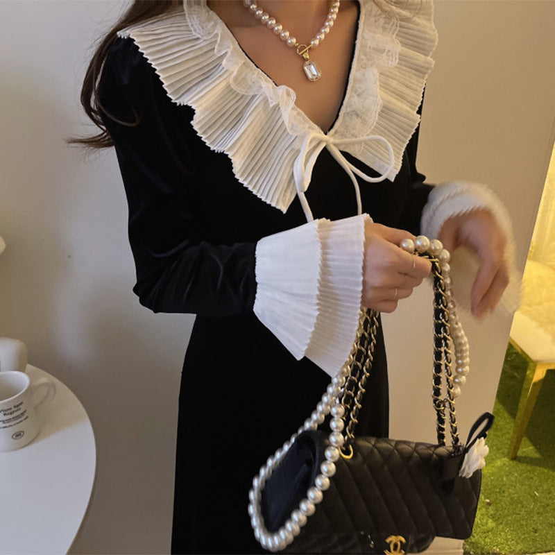 【dress】折り襟ギャザー長袖ワンピースG23870