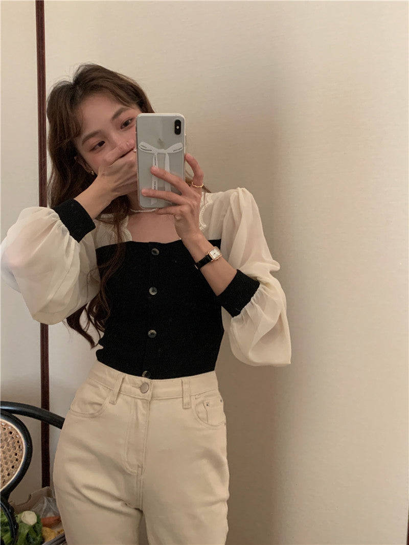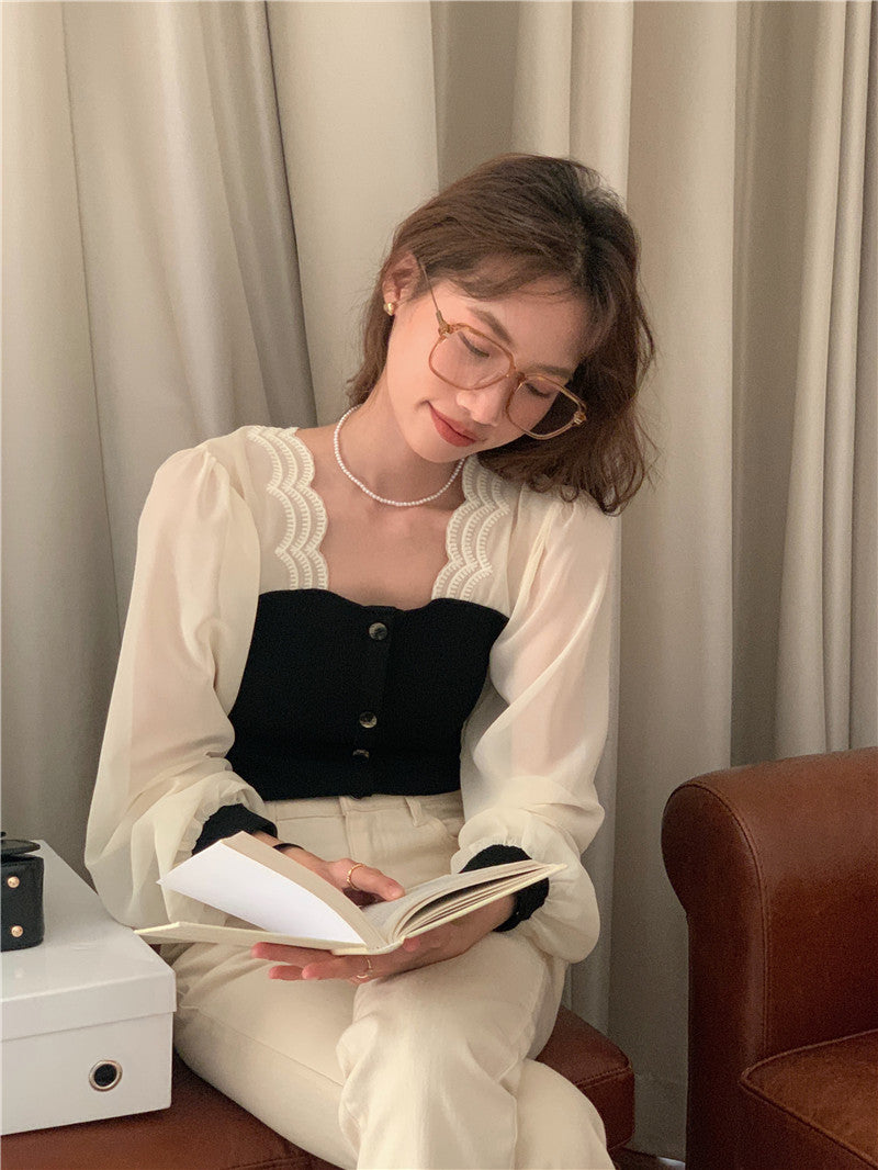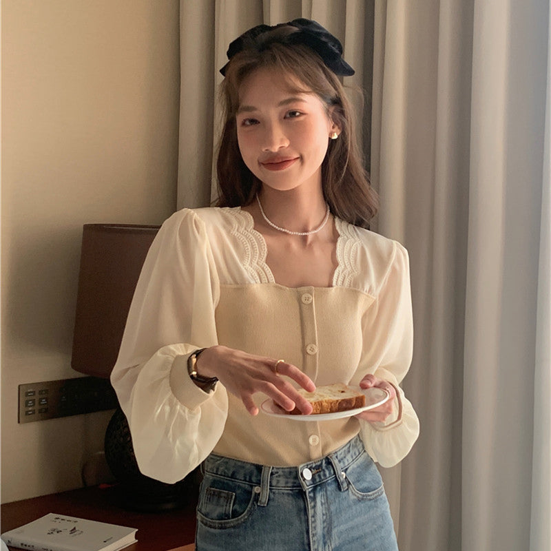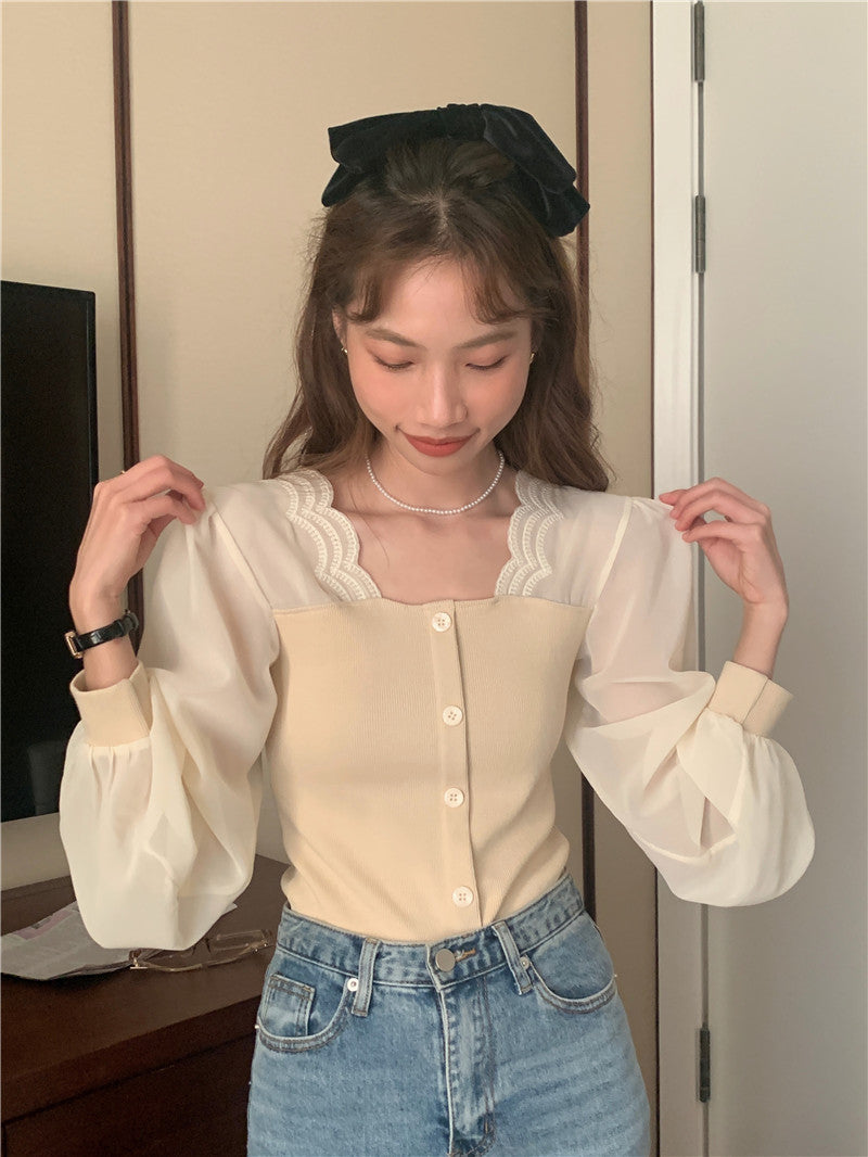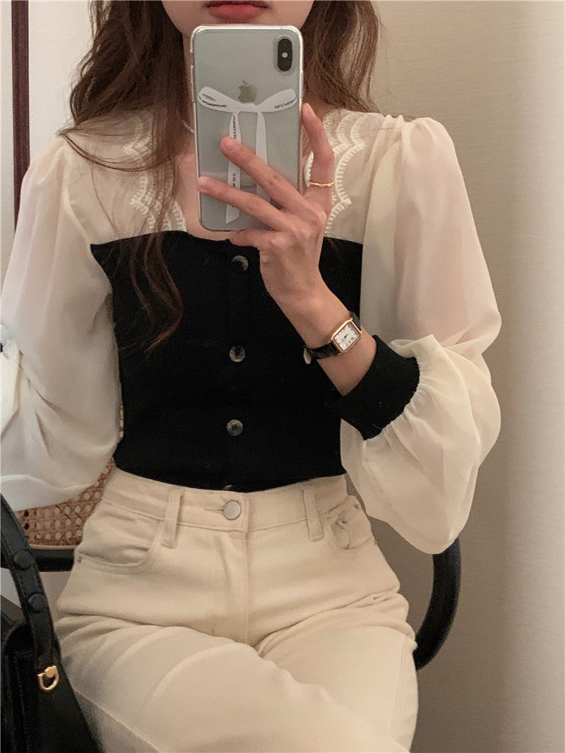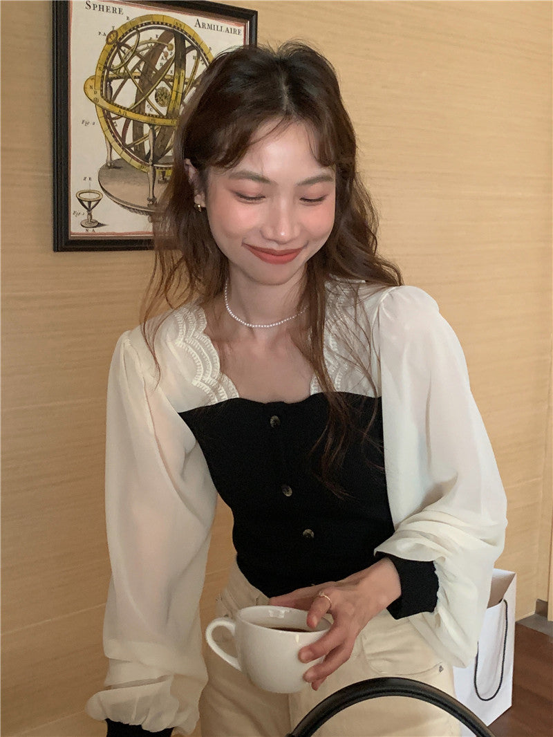 【tops】スクエアネック偽二つ切り替え長袖ブラウスG24005