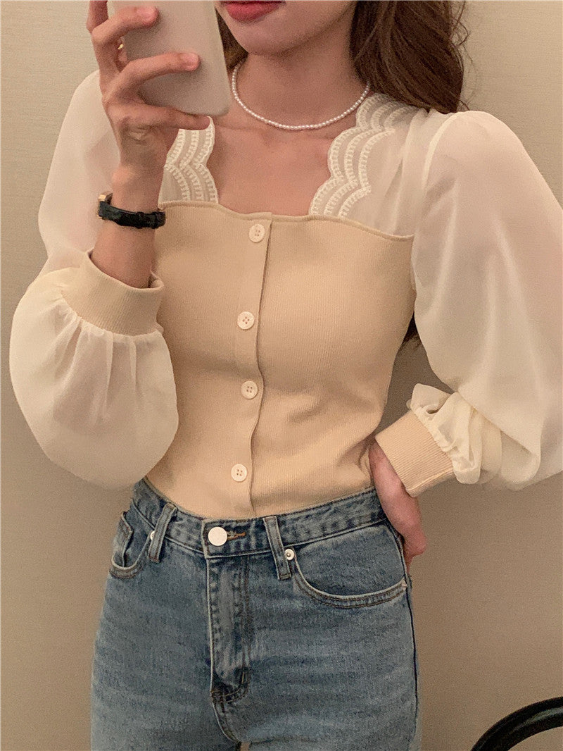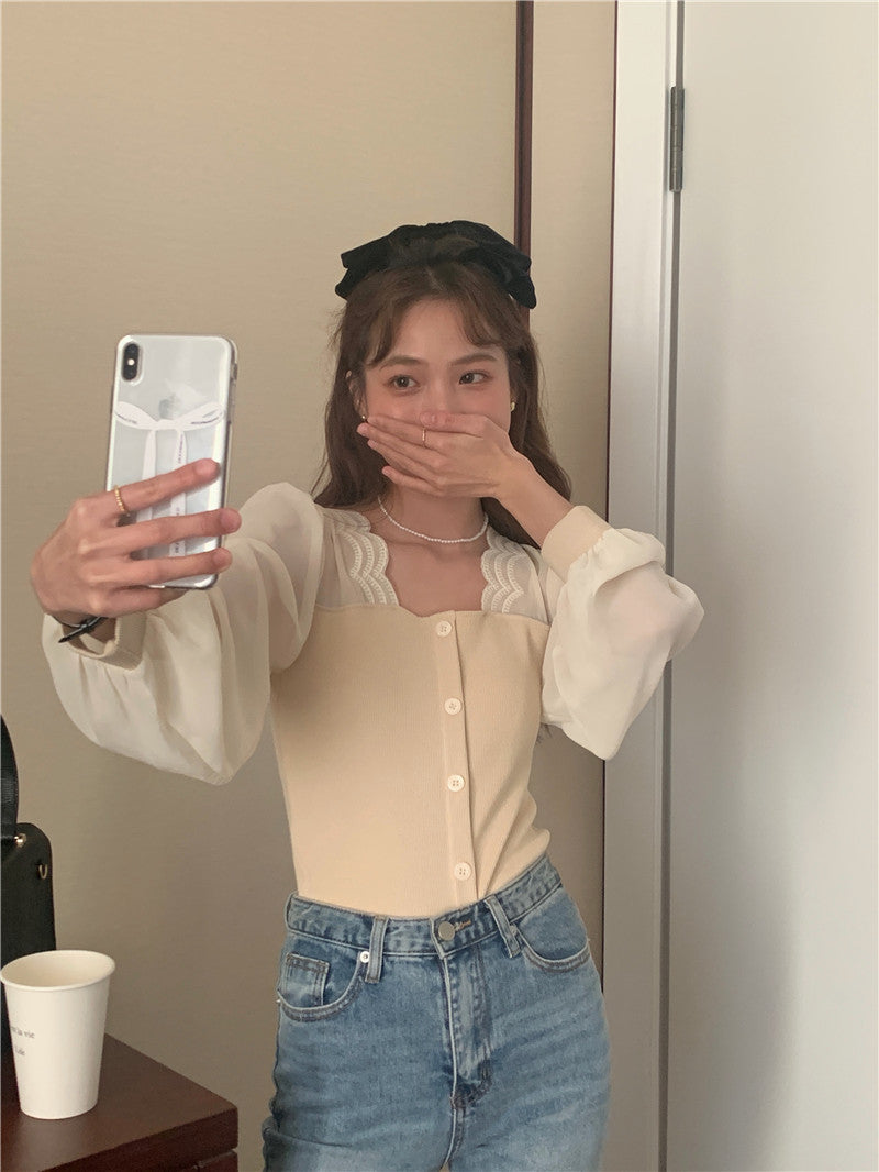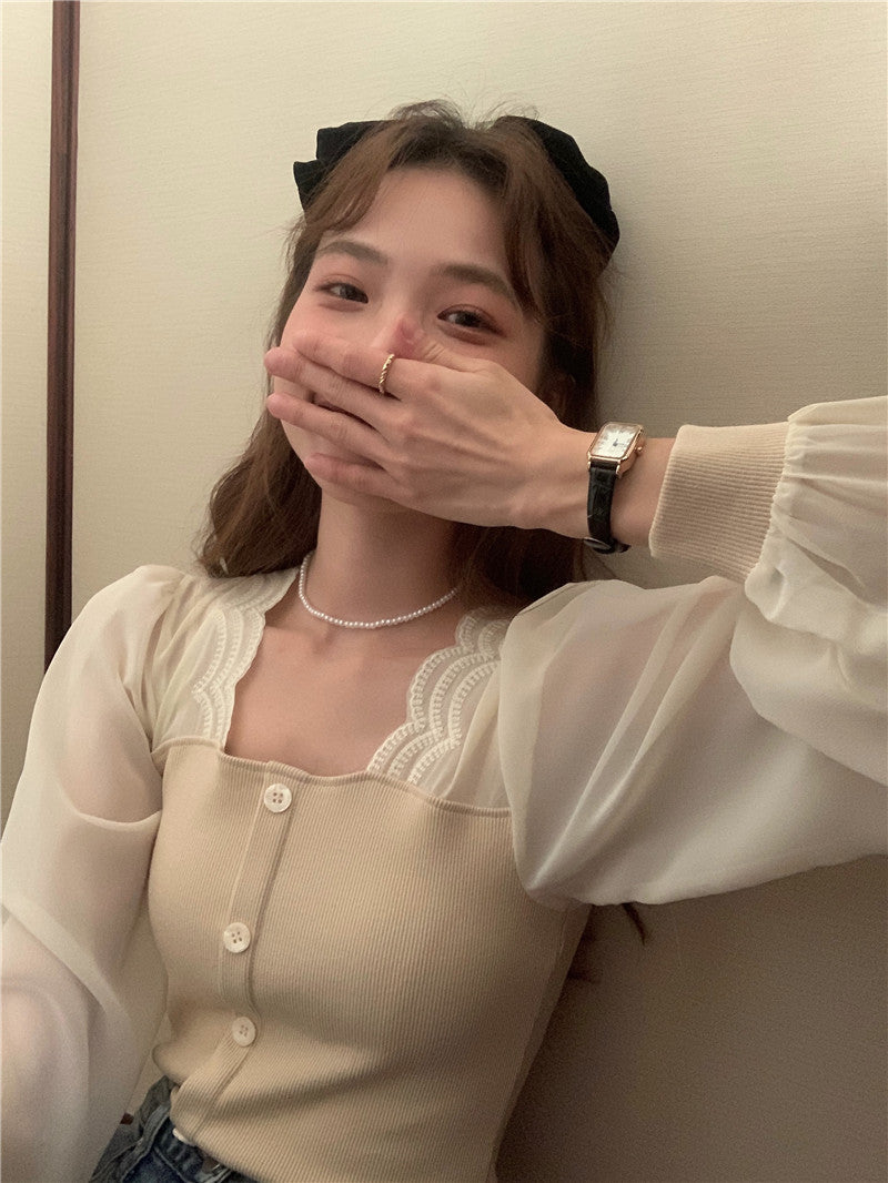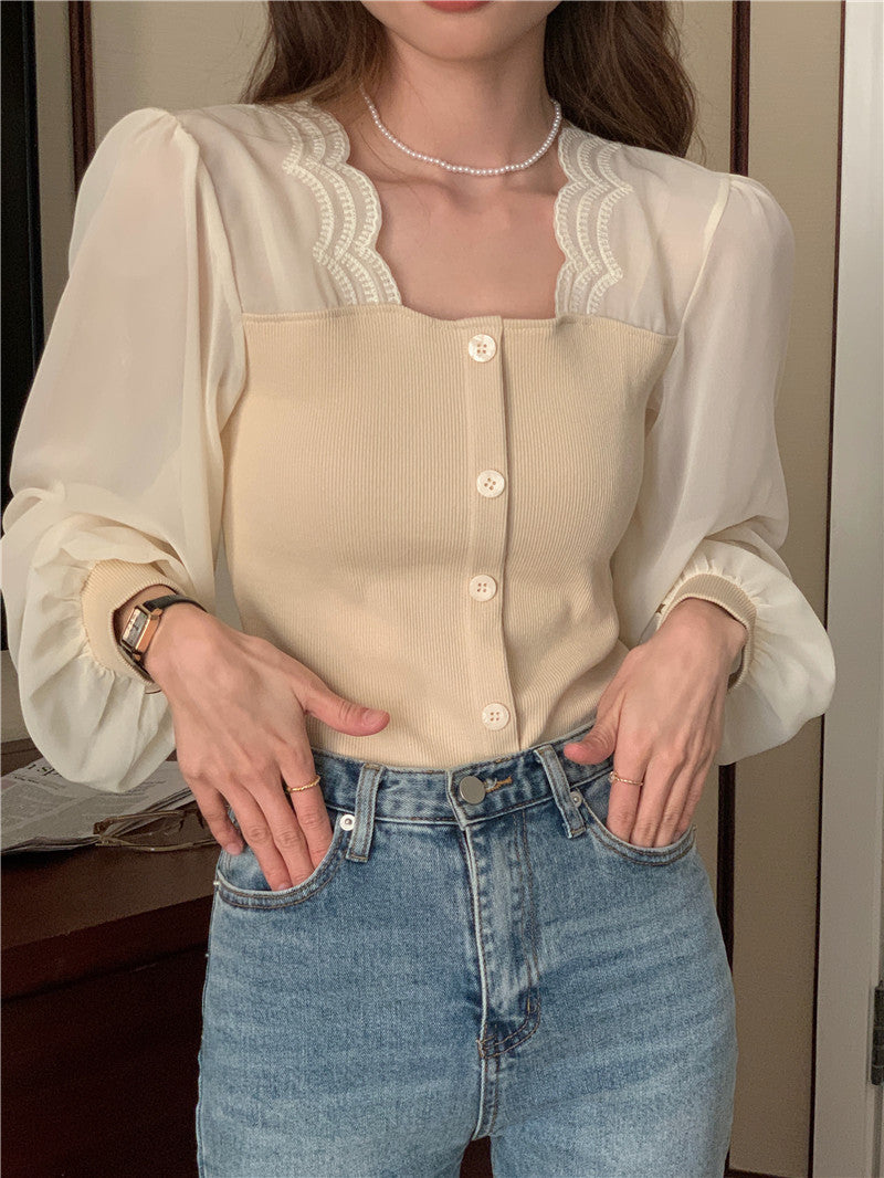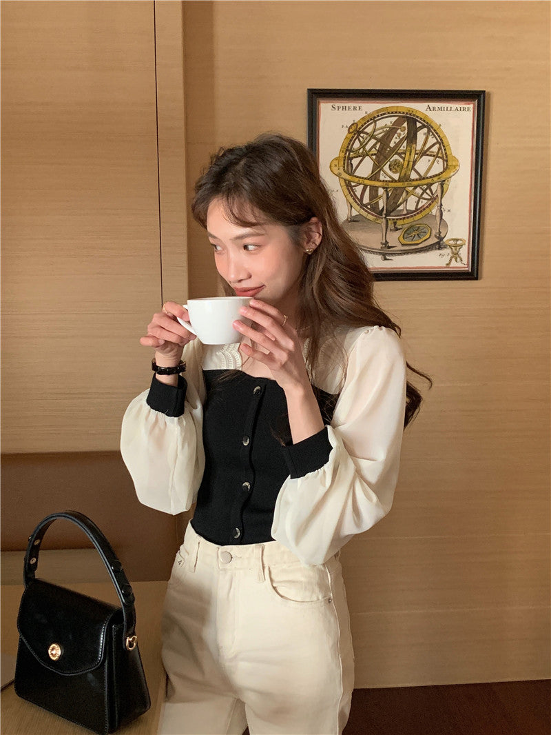 【tops】スクエアネック偽二つ切り替え長袖ブラウスG24005