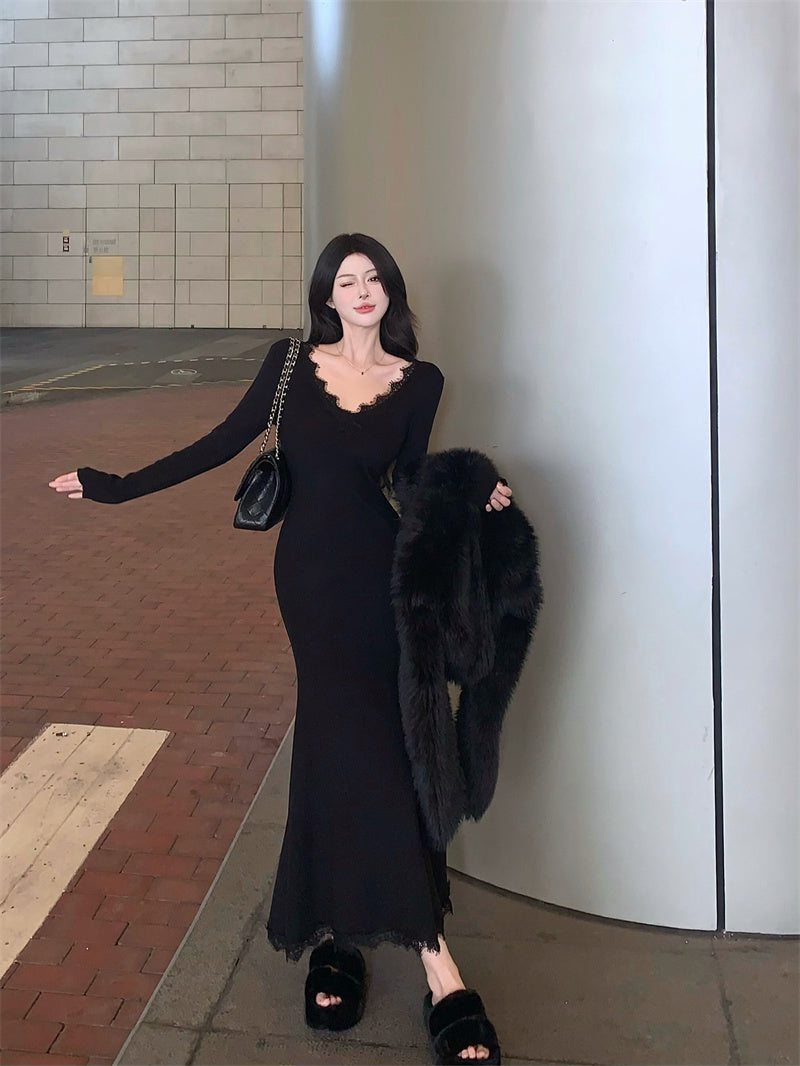 【dress】Vネックレース長袖マーメイドワンピースG24193