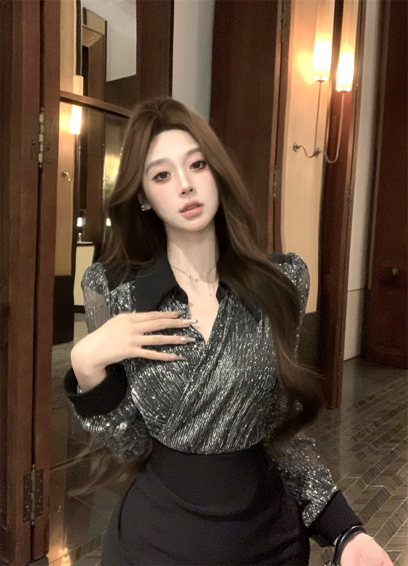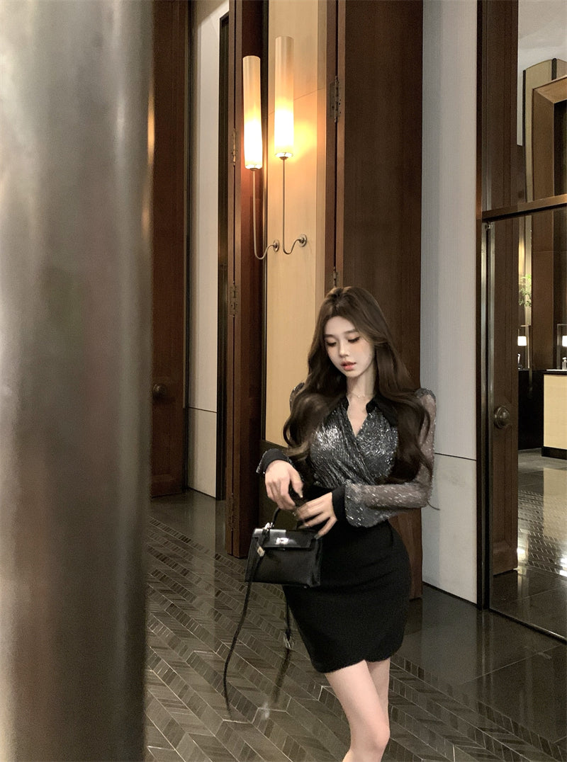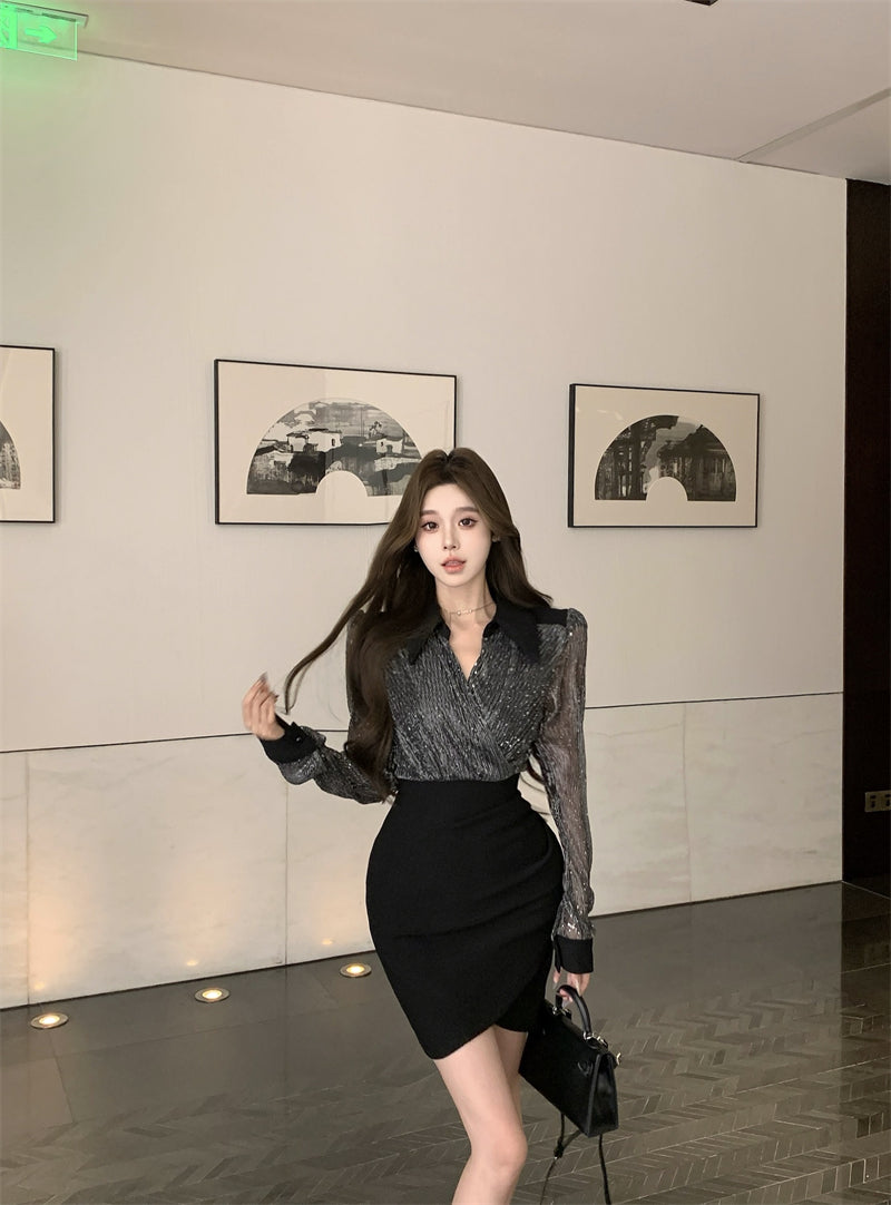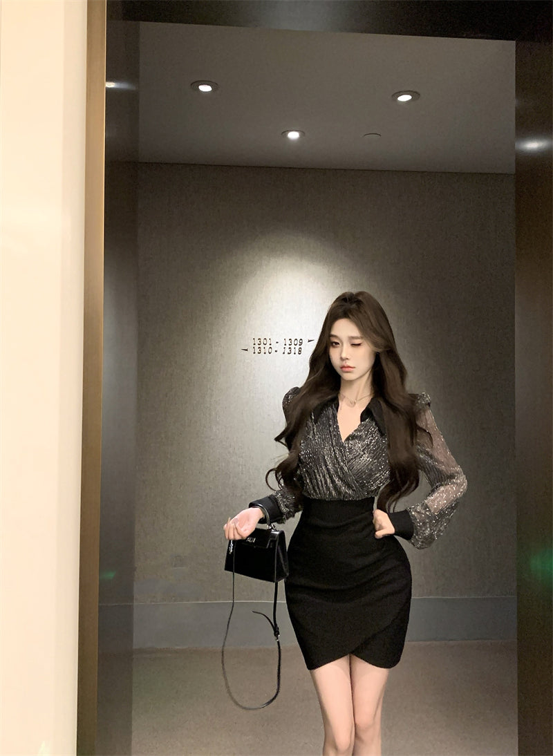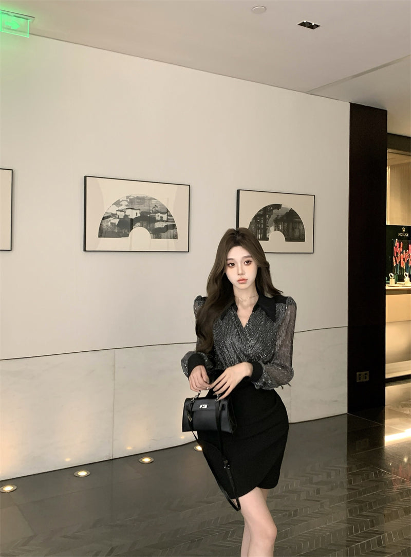 【dress】Vネック偽二つ切り替え長袖ワンピースG24373