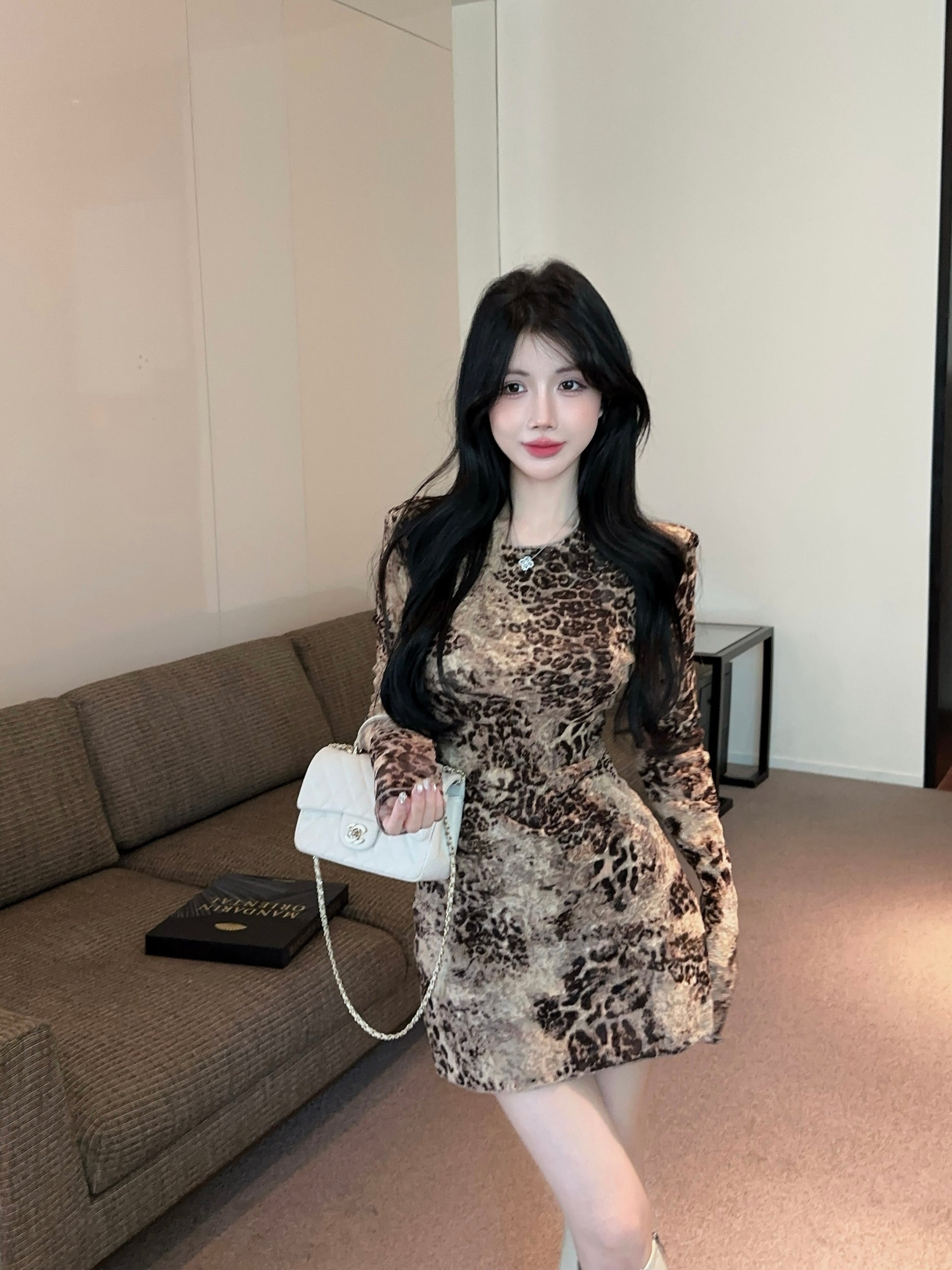 【dress】ヒョウ柄プリント長袖タイトワンピースG24421