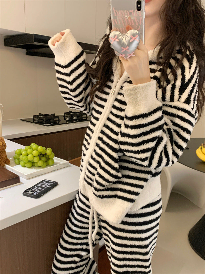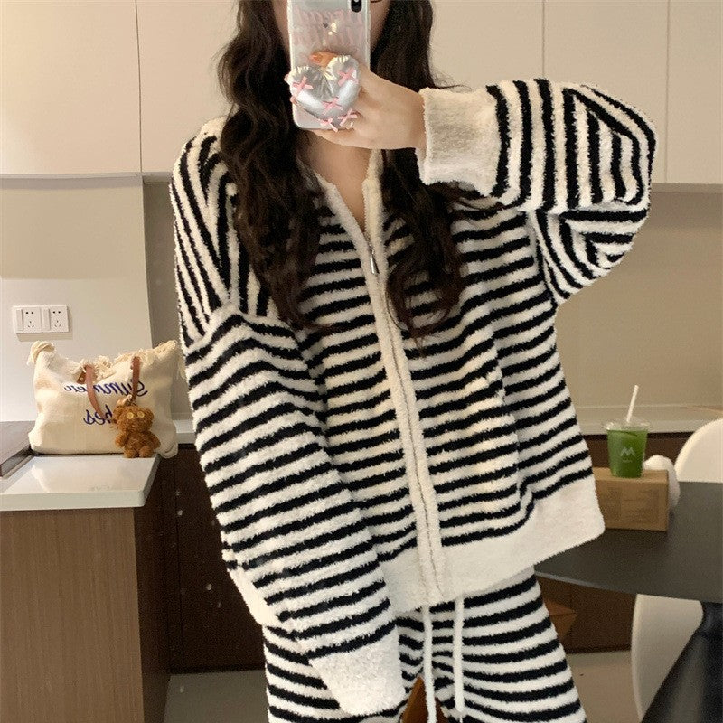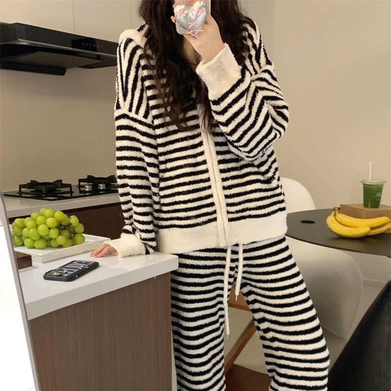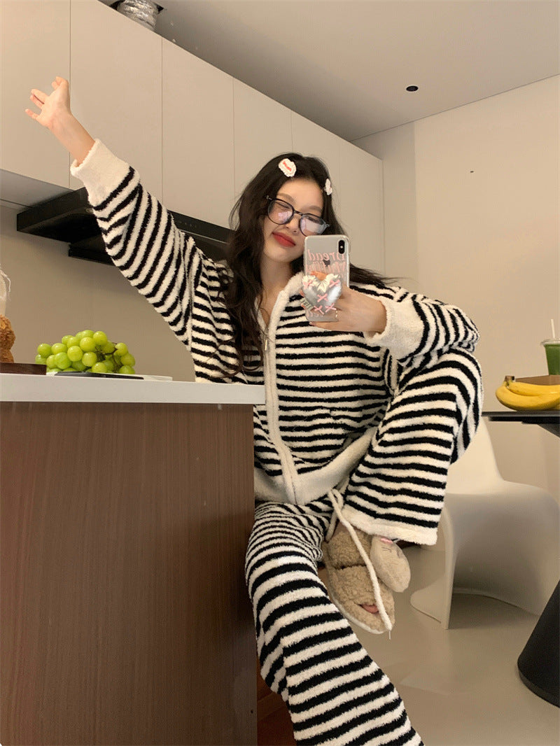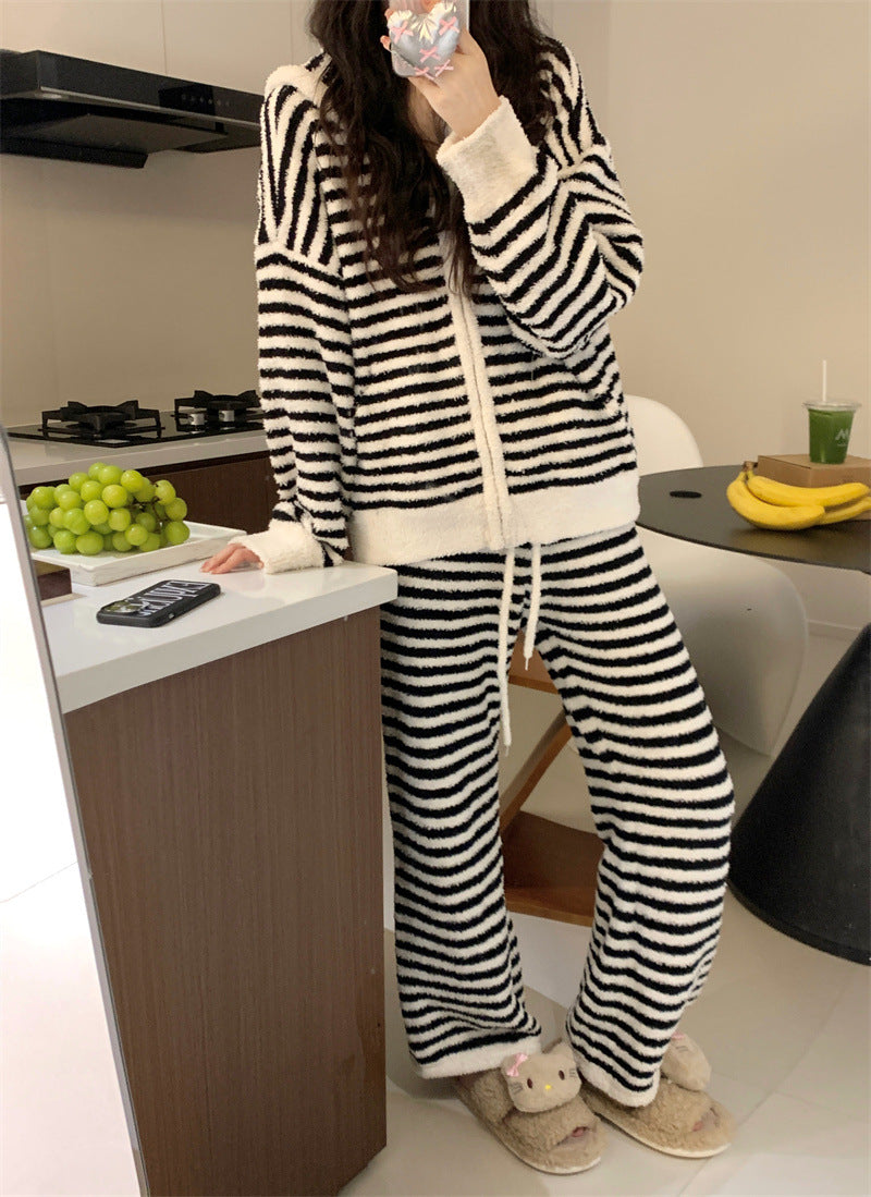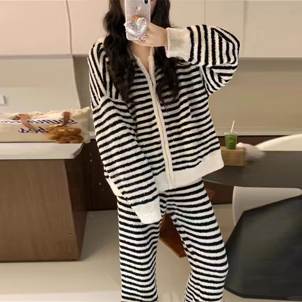 【ホーム・生活】秋冬厚手裏起毛ストライプ柄上下セットルームウェアパジャマG24581