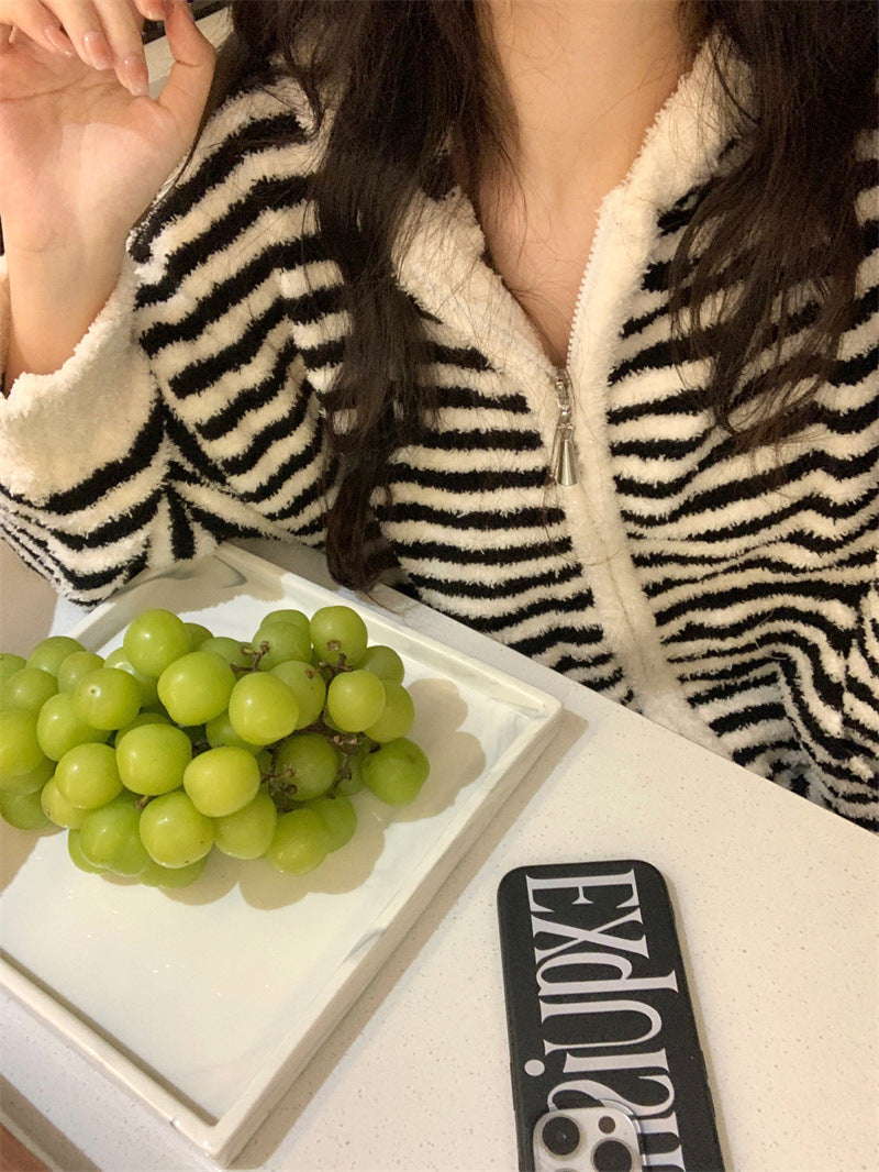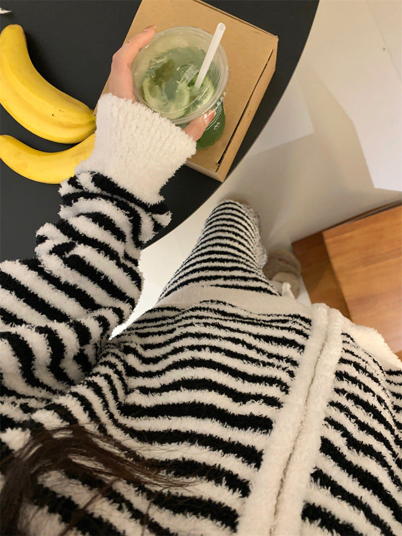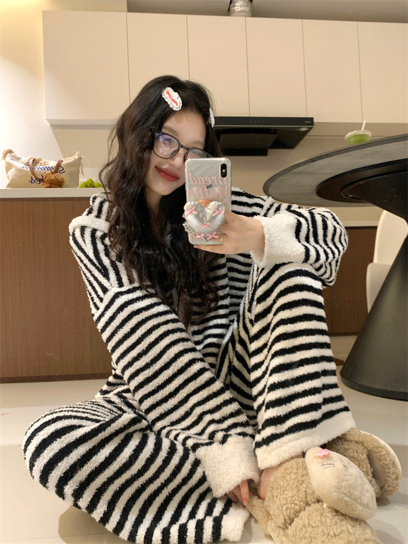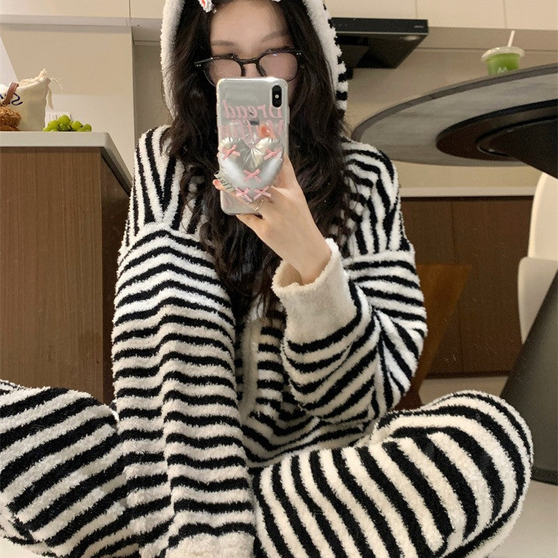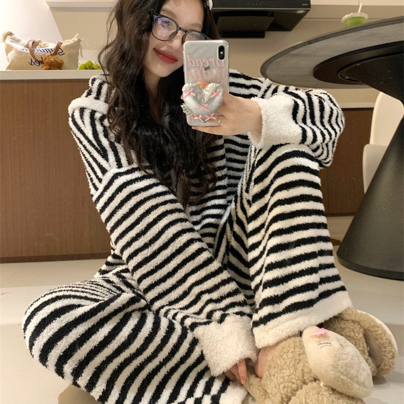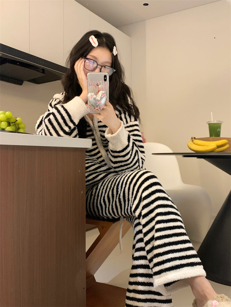 【ホーム・生活】秋冬厚手裏起毛ストライプ柄上下セットルームウェアパジャマG24581