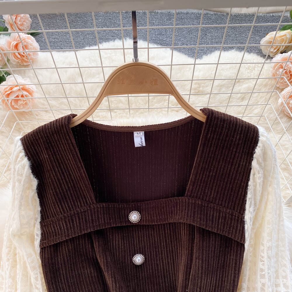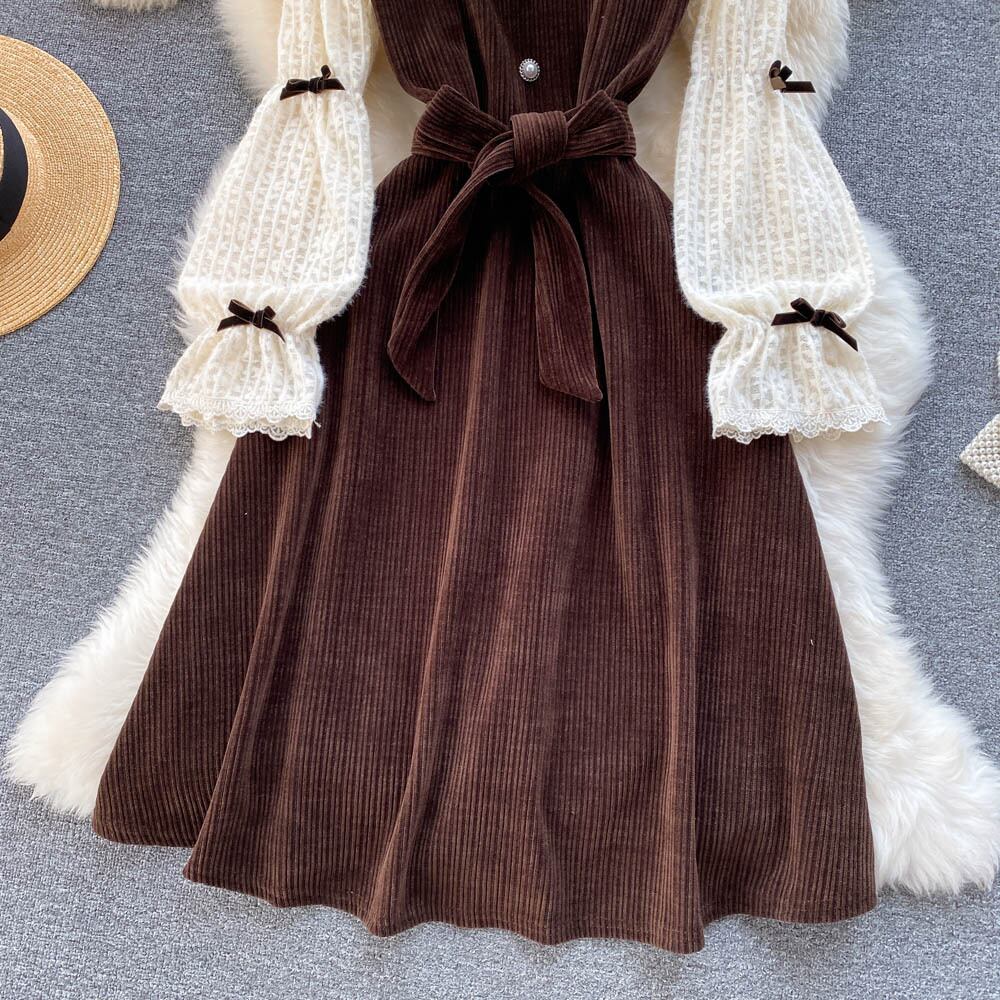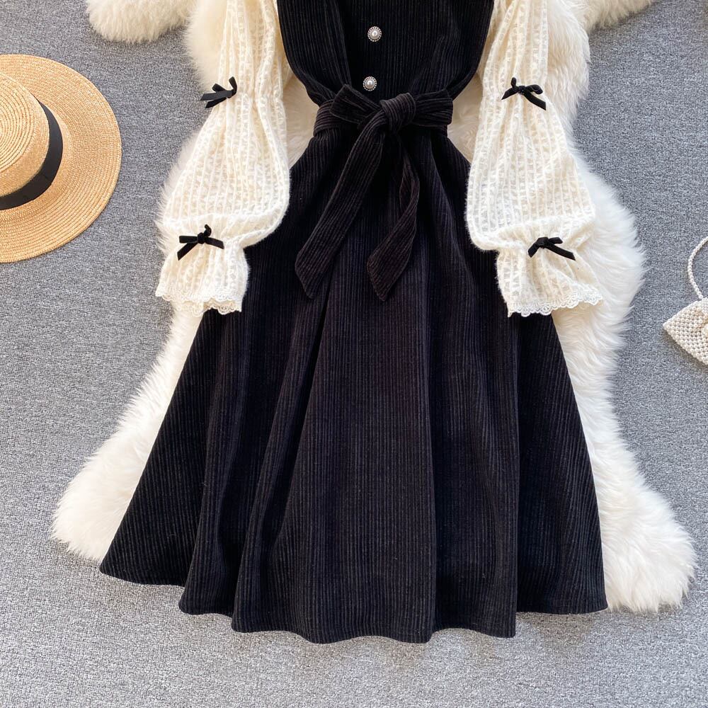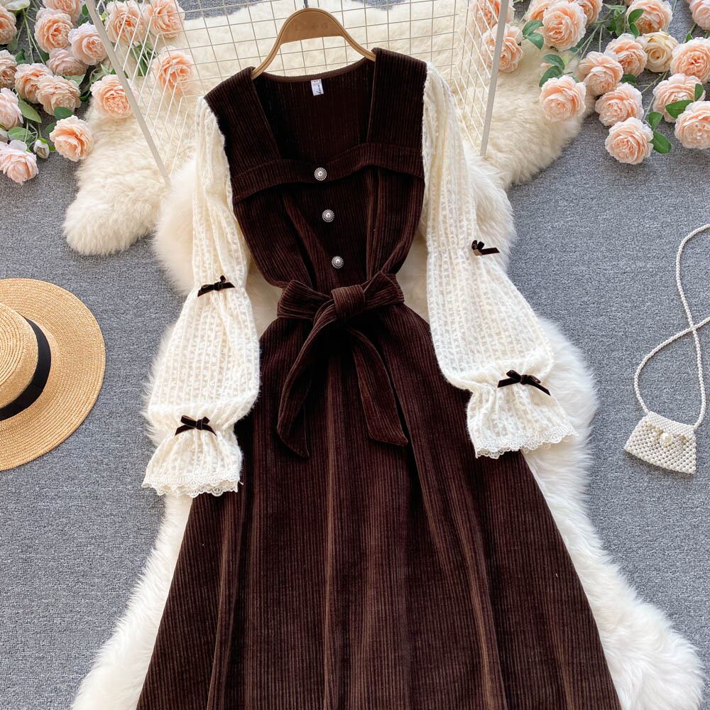 【dress】ファッションレトロスウィートデザインレース切り替えパフスリーブワンピース G3200