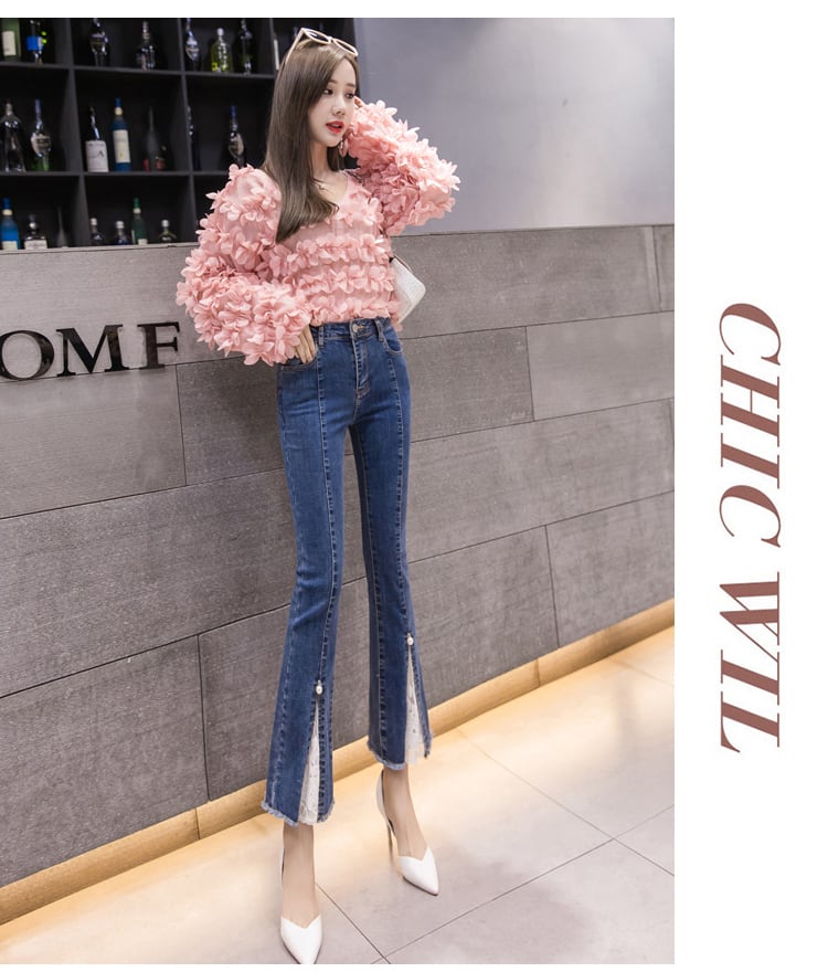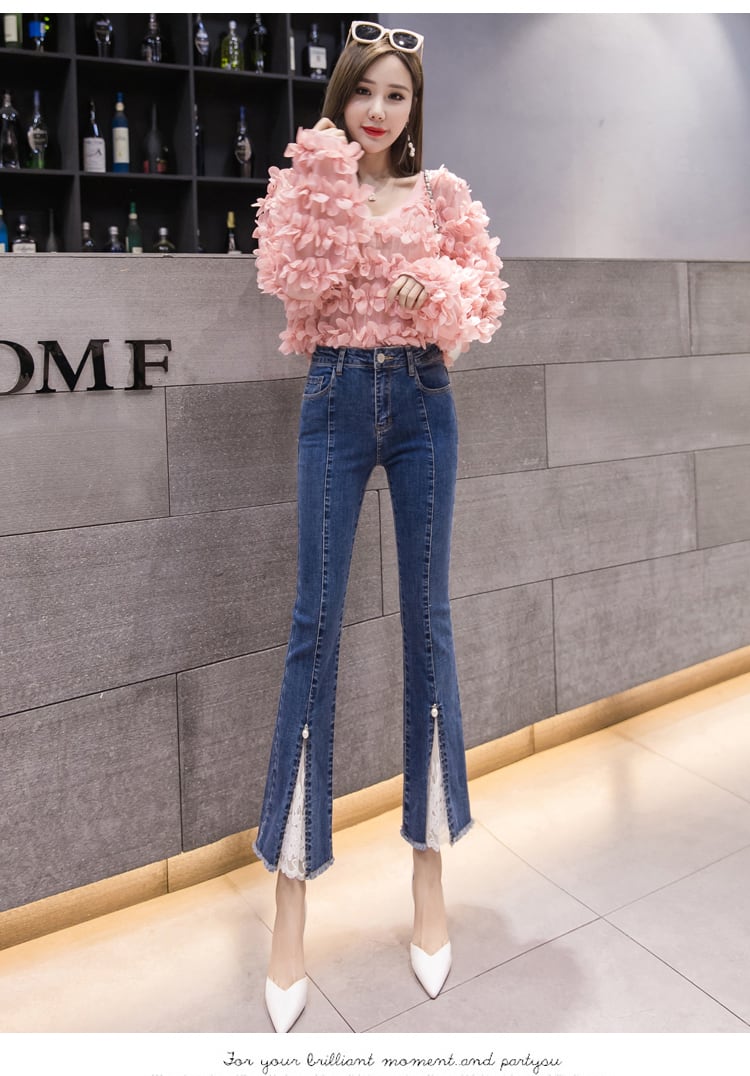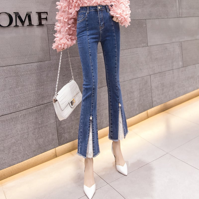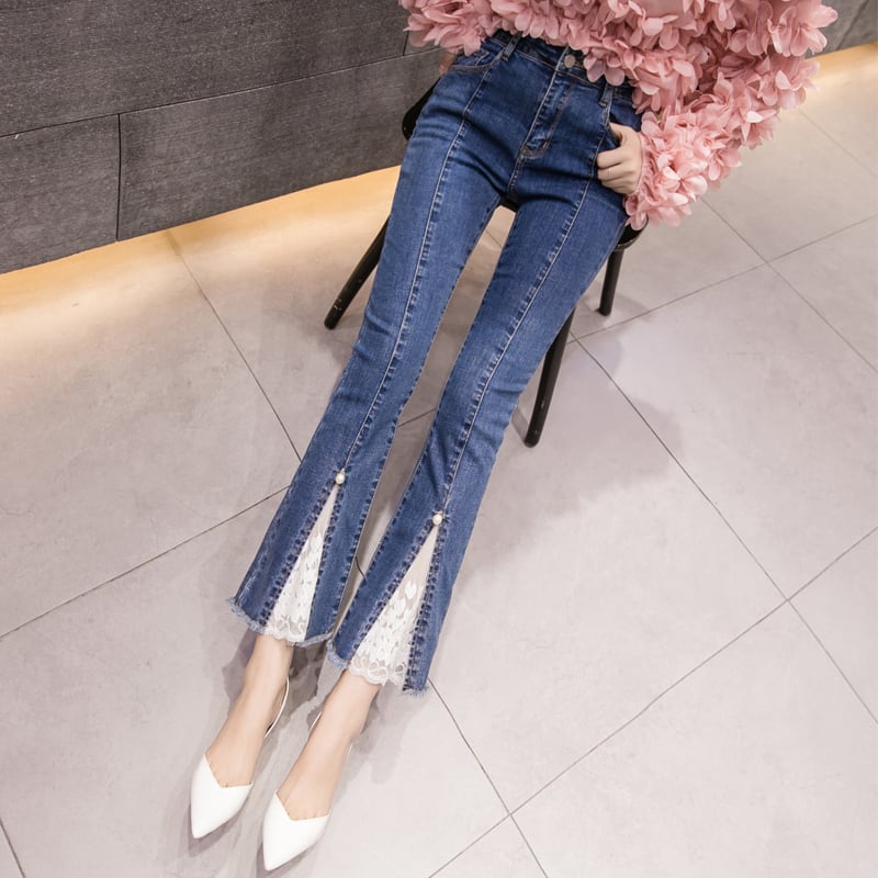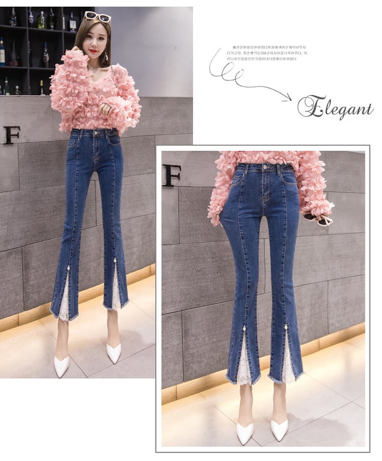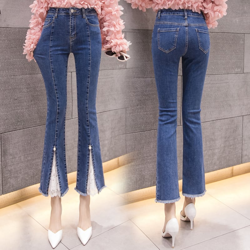 【bottoms】好感度UP!合わせやすい九分丈ハイウエスト着痩せ切り替えレースデニムパンツ G3448
