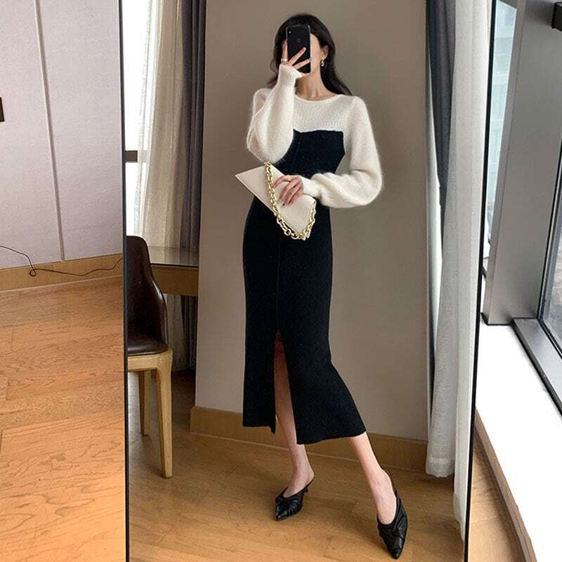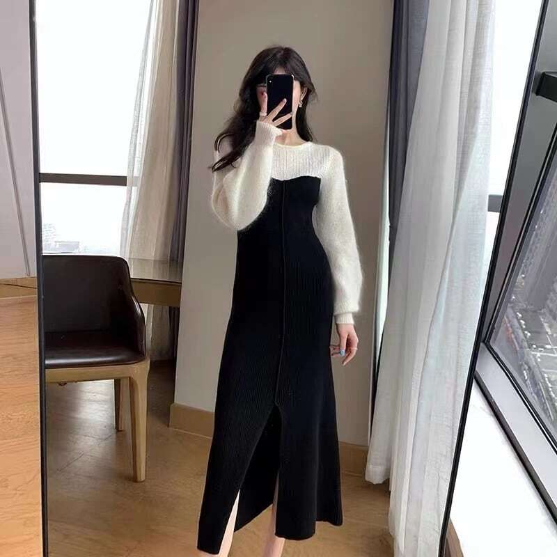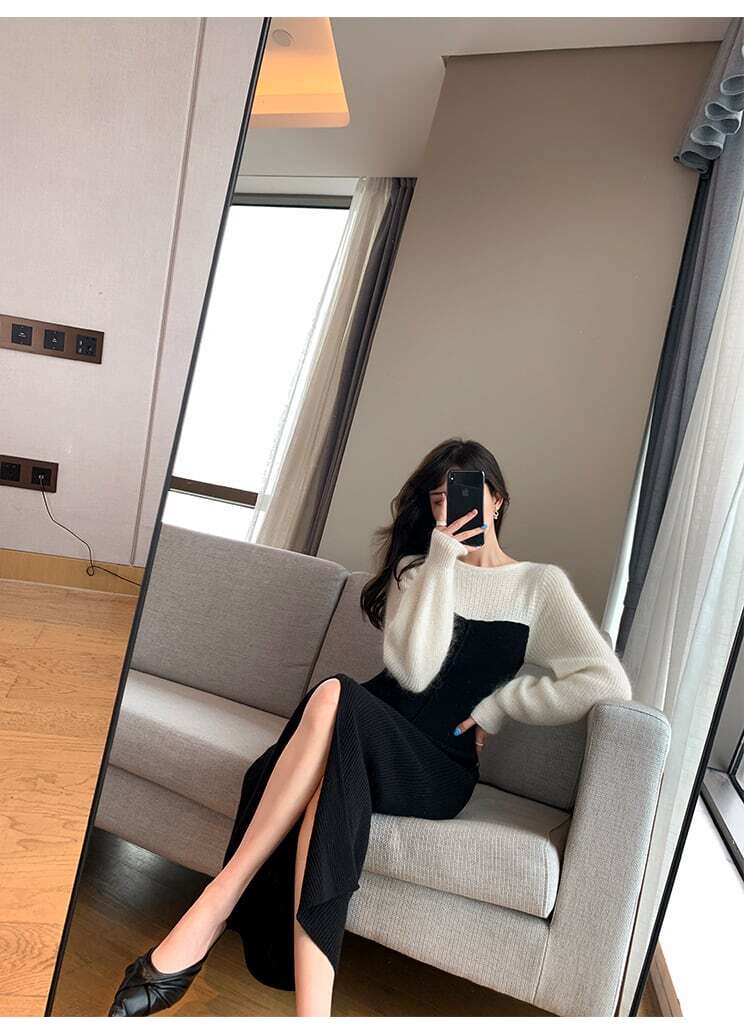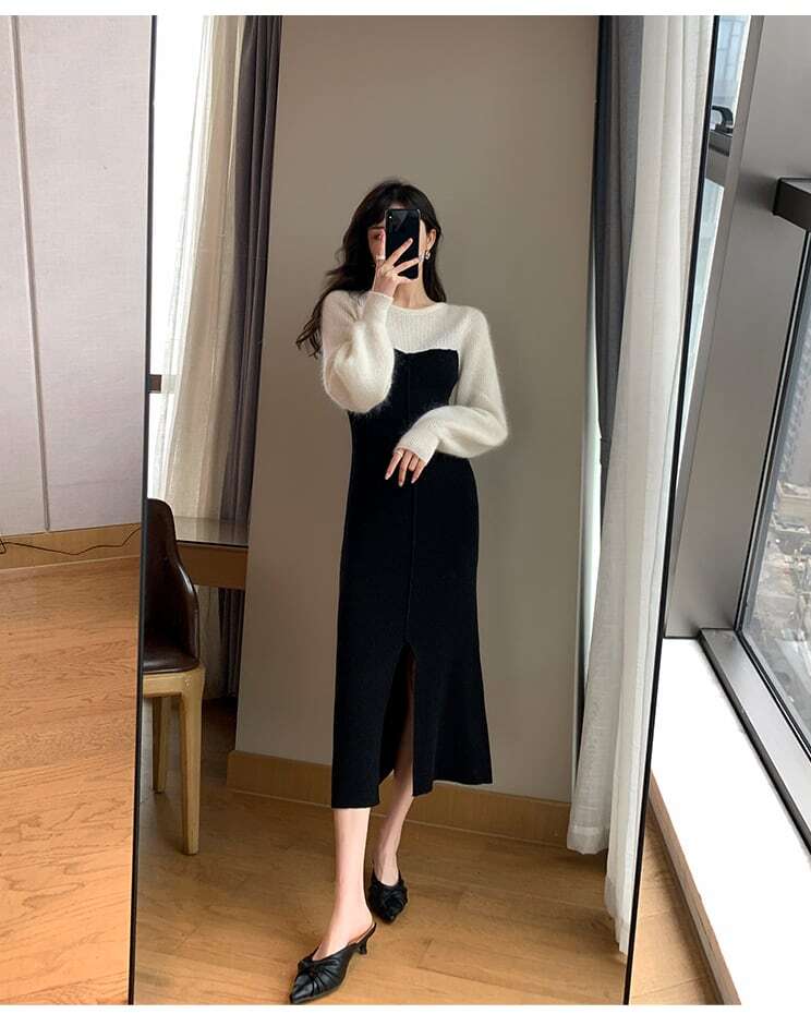 【dress】好感度UP!気質満点カラーマッチングレトロスリット着痩せニットワンピース G3908
