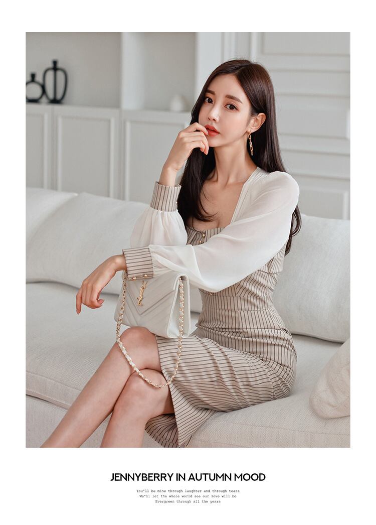 【dress】ファッション!気質満点レトロシフォン切り替え体型カバータイトワンピース G4907