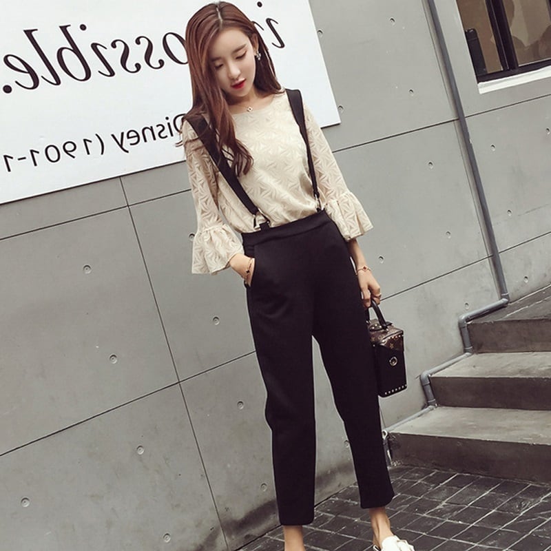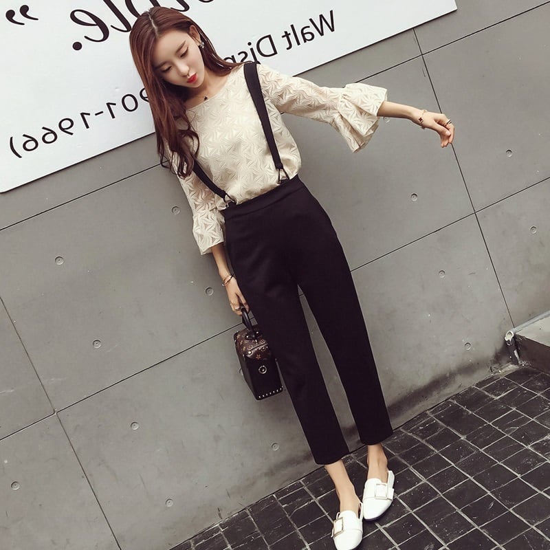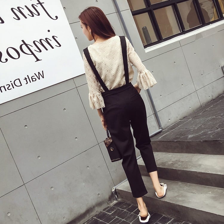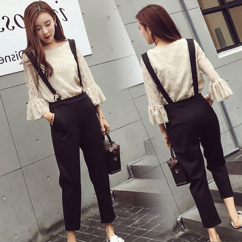 【set】大人可愛いフレアスリーブトップス+サロペット通勤日常セットアップF0063