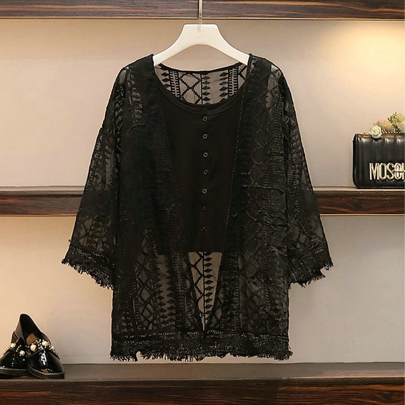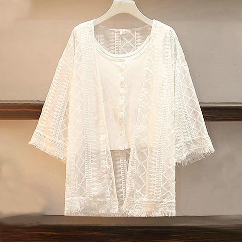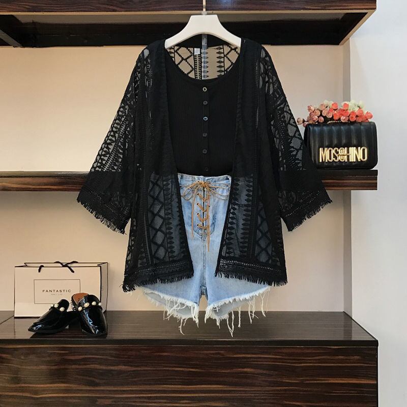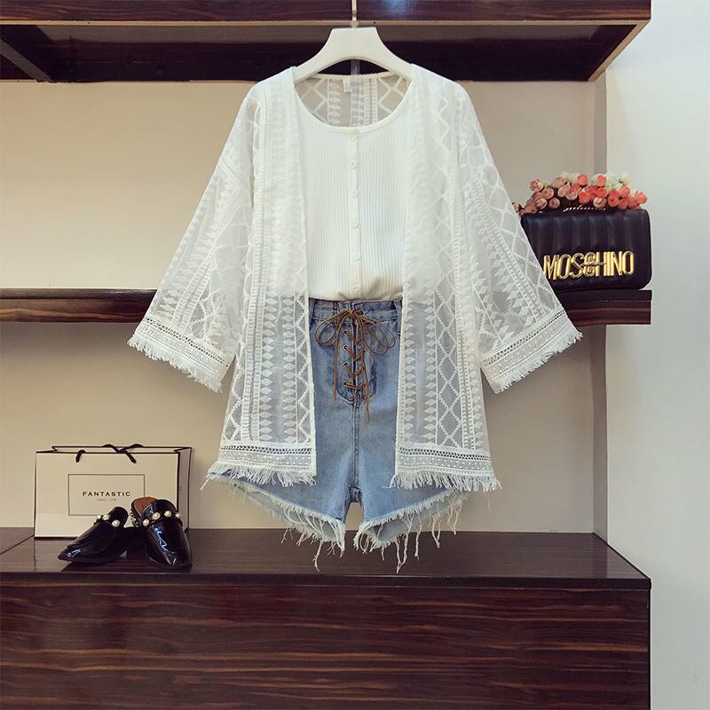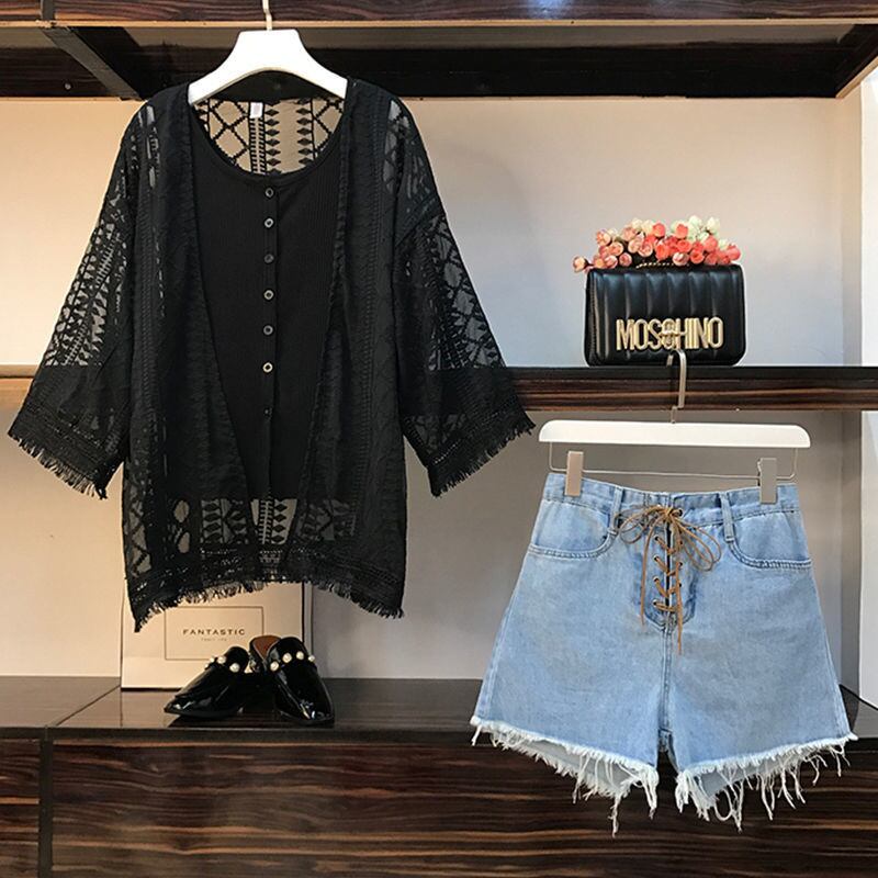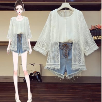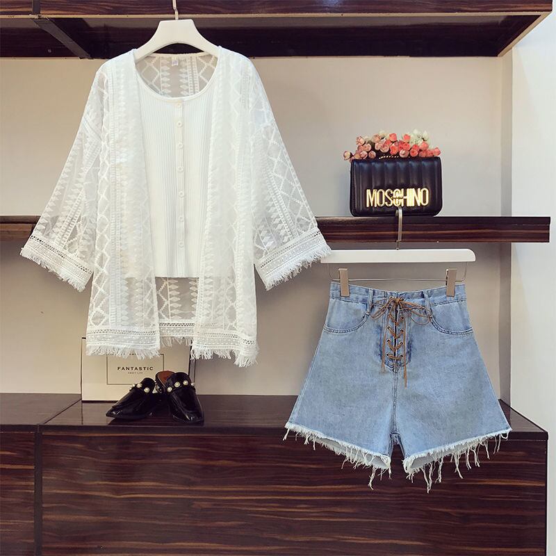 【set】好感度満載!3点セットレースカーディガン+無地タンクトップ+デニムショートパンツF0233