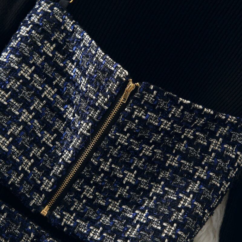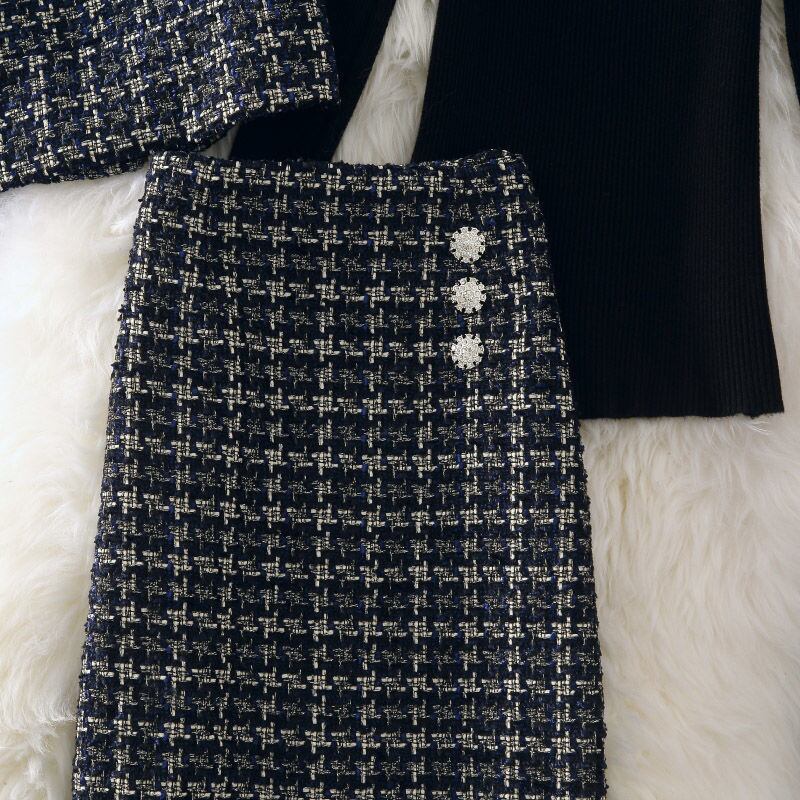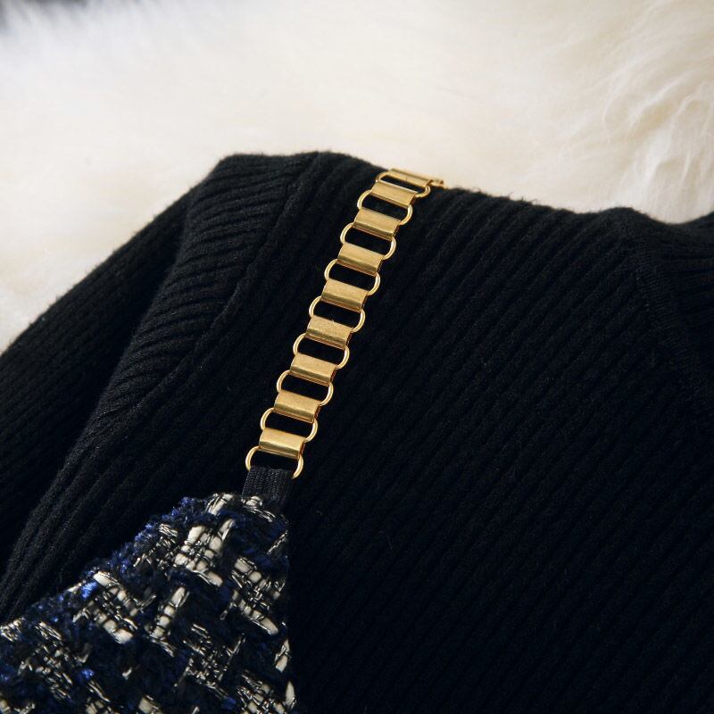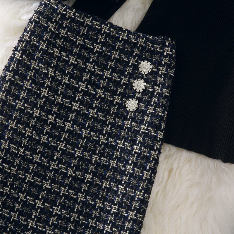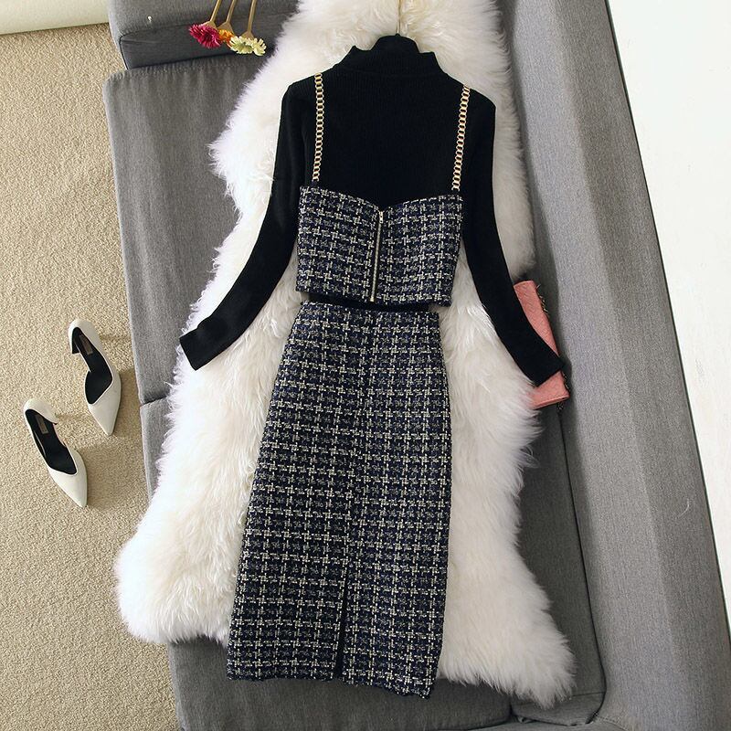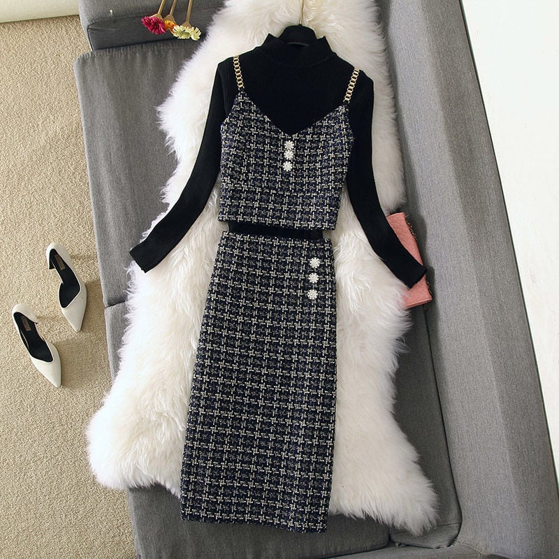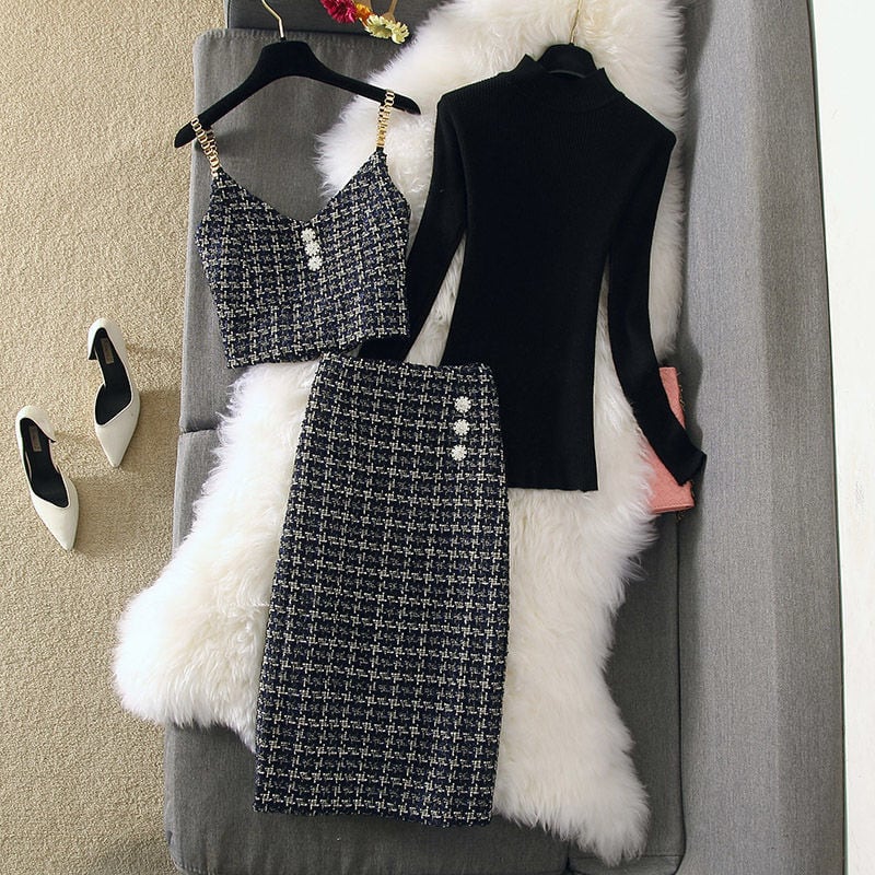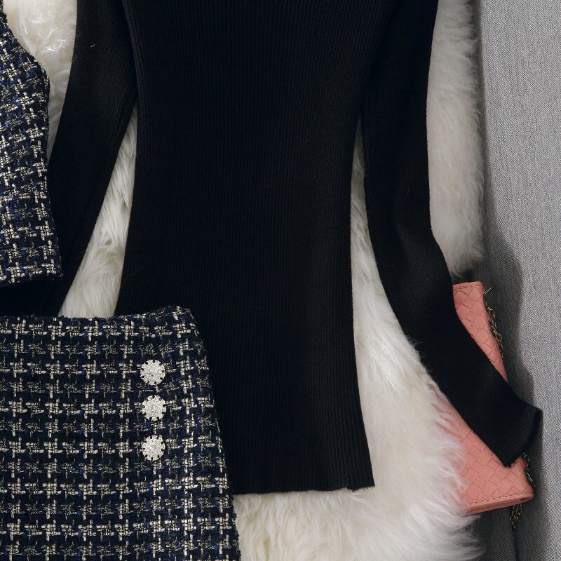 【set】無地セーター+チェック柄ベスト+ボディラインスカート3点セットF0817