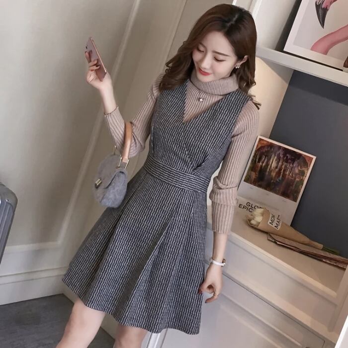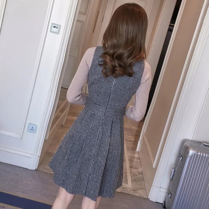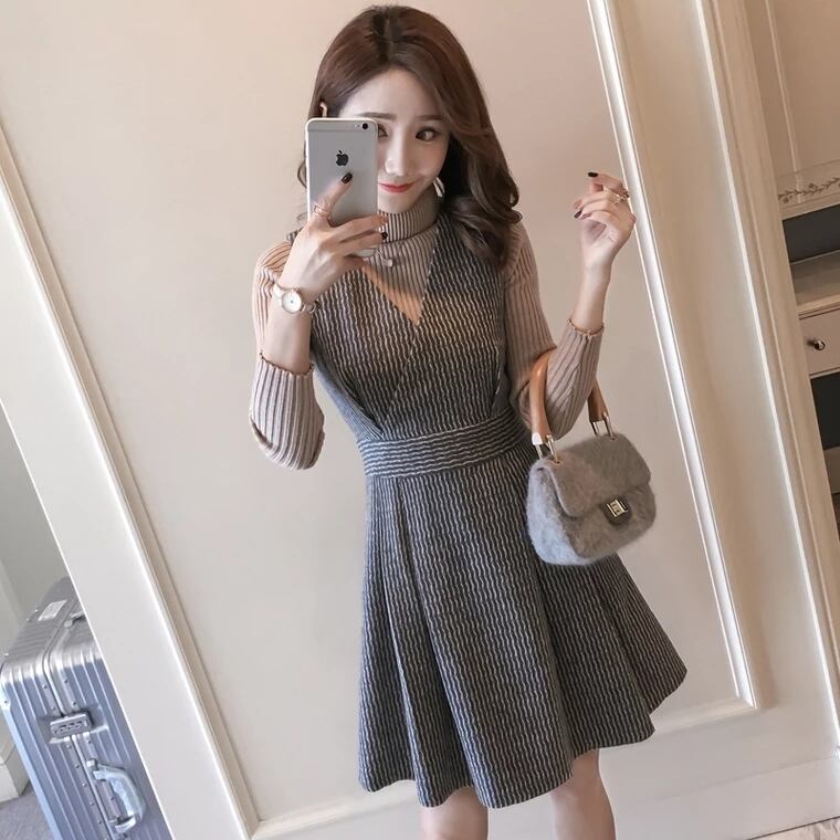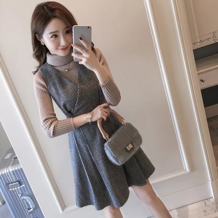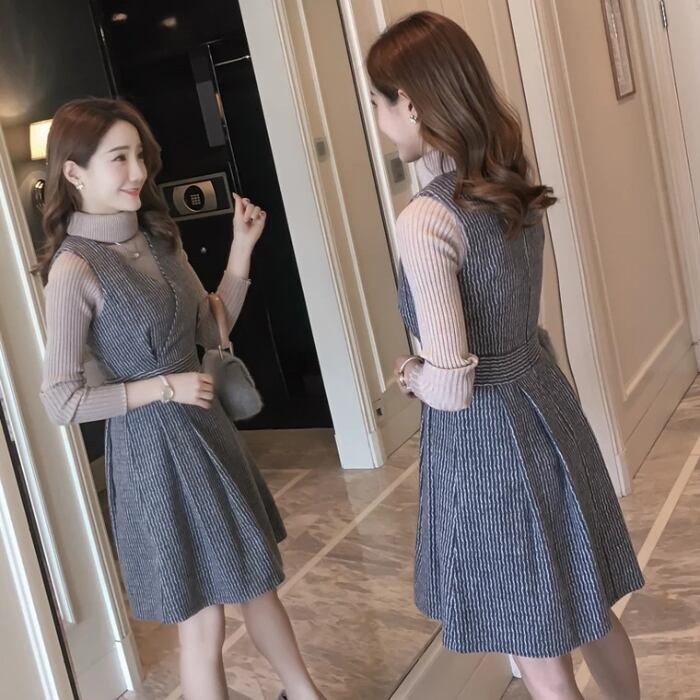 【set】話題沸騰中2点セット無地セーター+ウェスト絞りチョッキワンピース通勤日常セットアップF1277