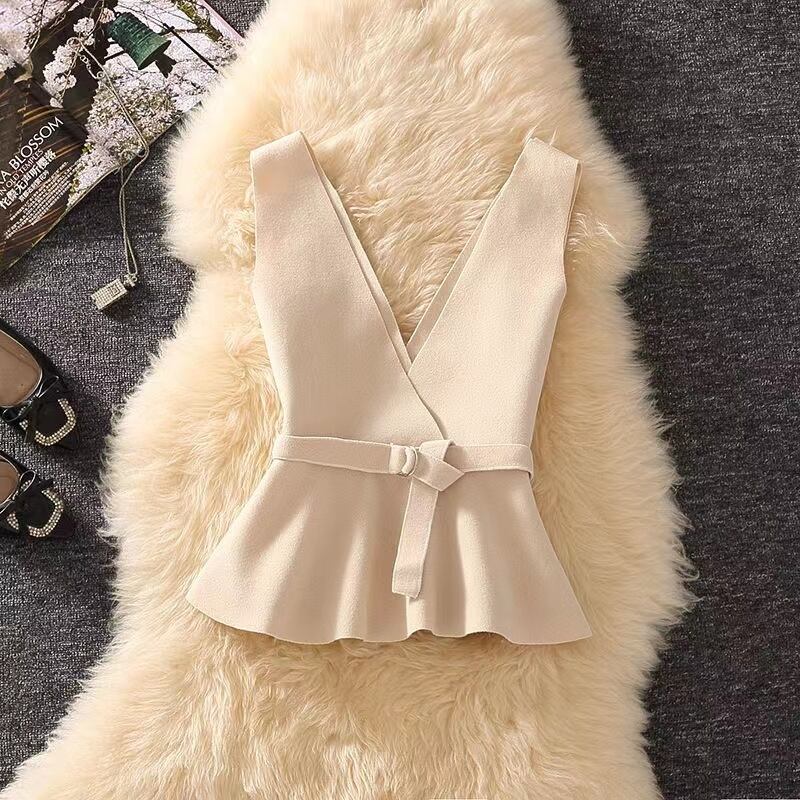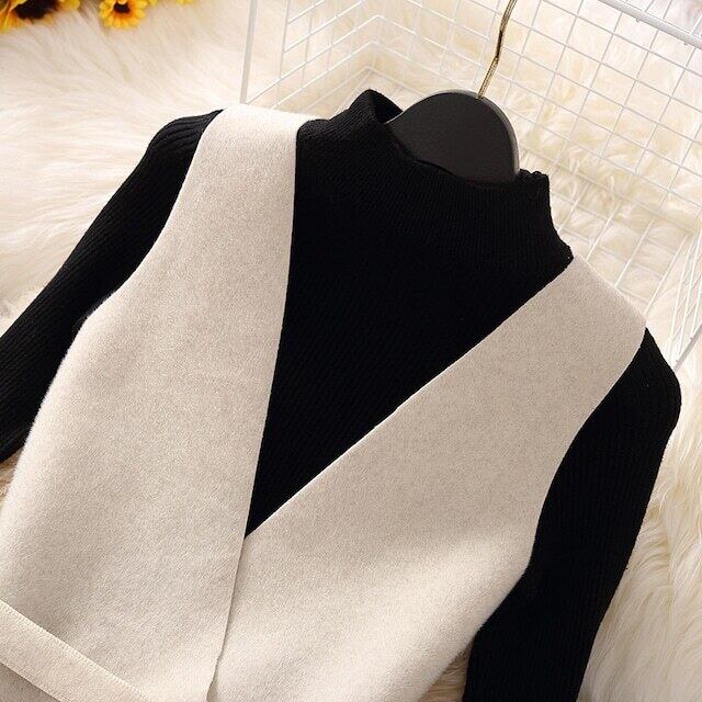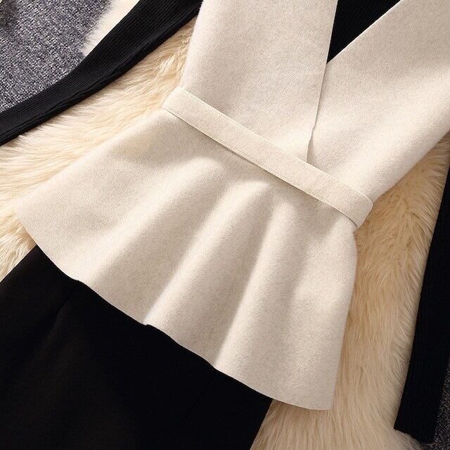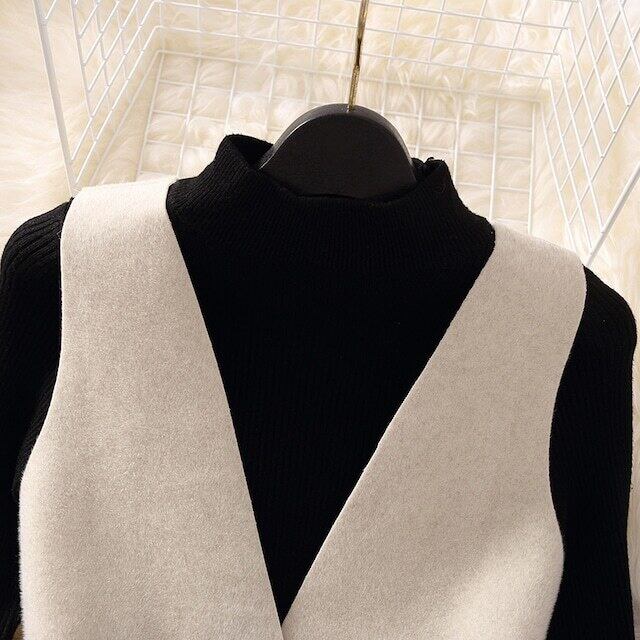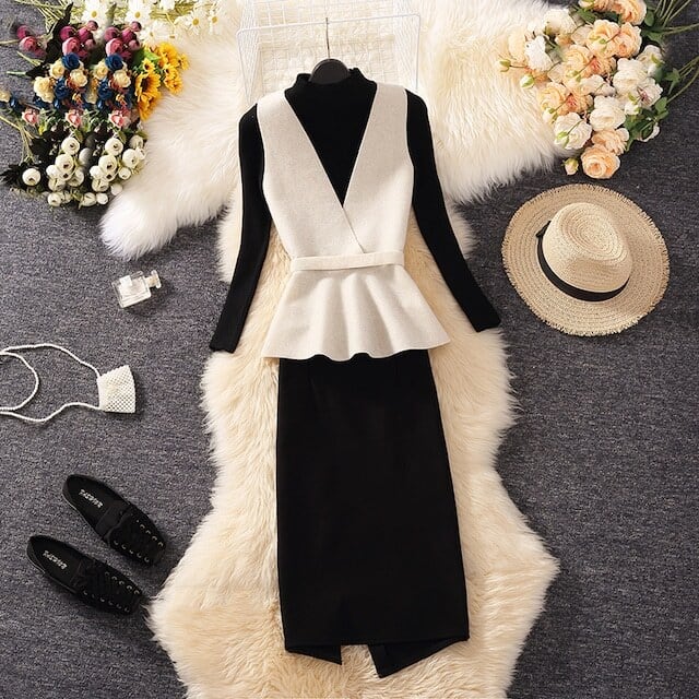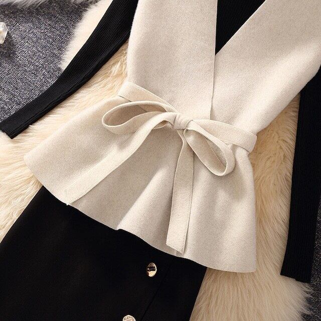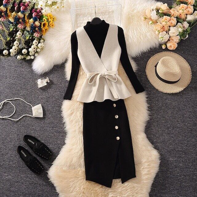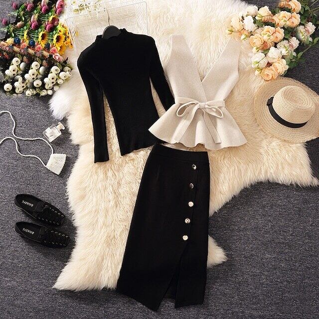 【set】好感度満載!秋冬新作Vネックベスト+無地セーター+美シルエットスカート通勤日常3点セットF1295