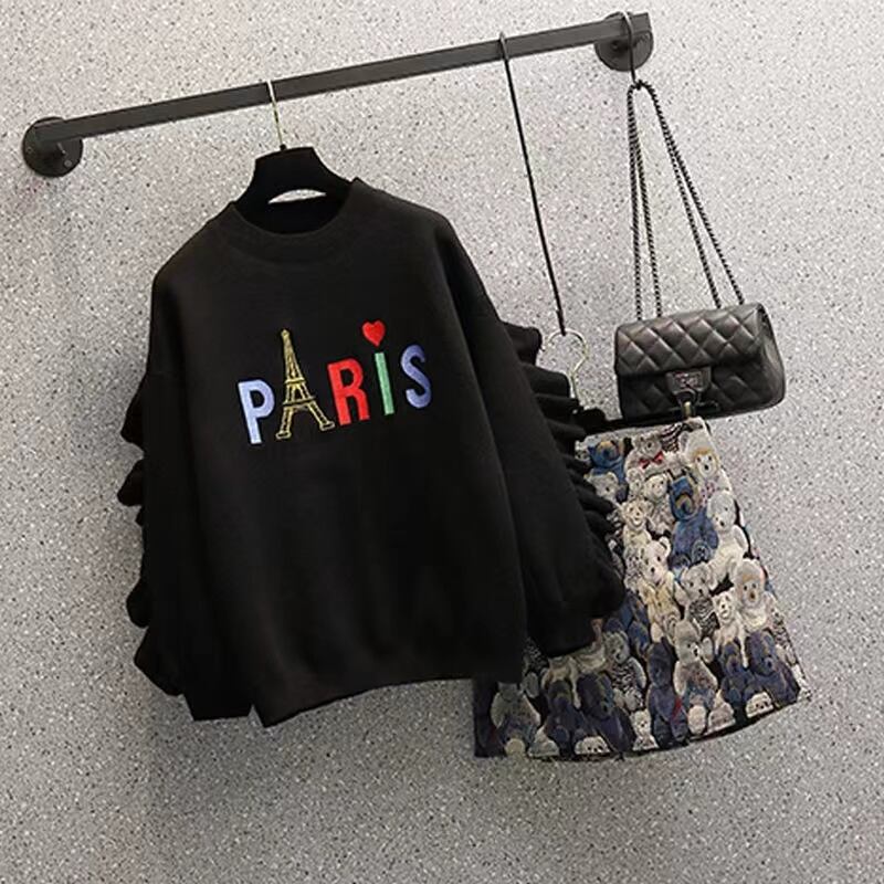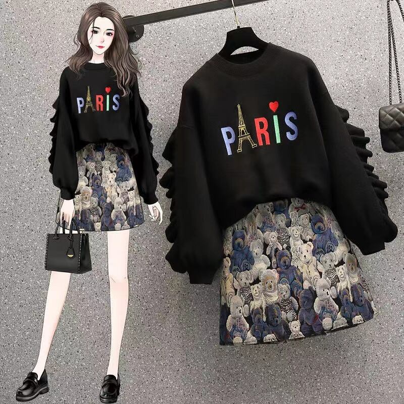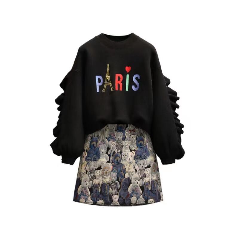 【set】話題沸騰中2点セットラウンドネック長袖パーカー+動物柄配色Aラインスカート通勤日常おしゃれセットアップF1310