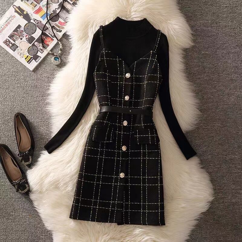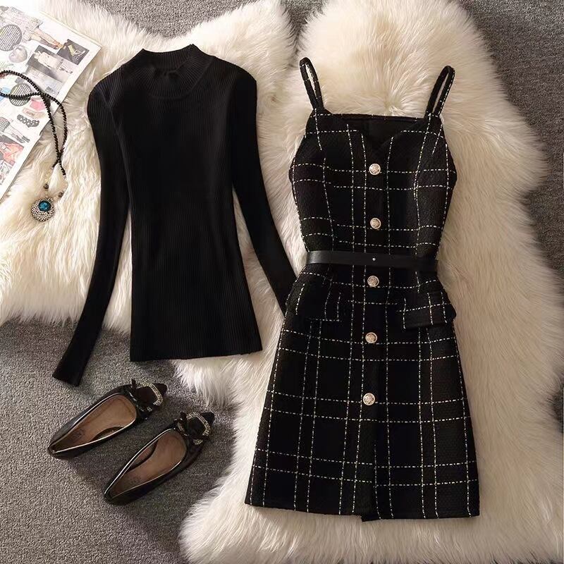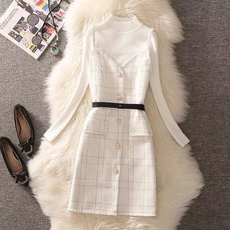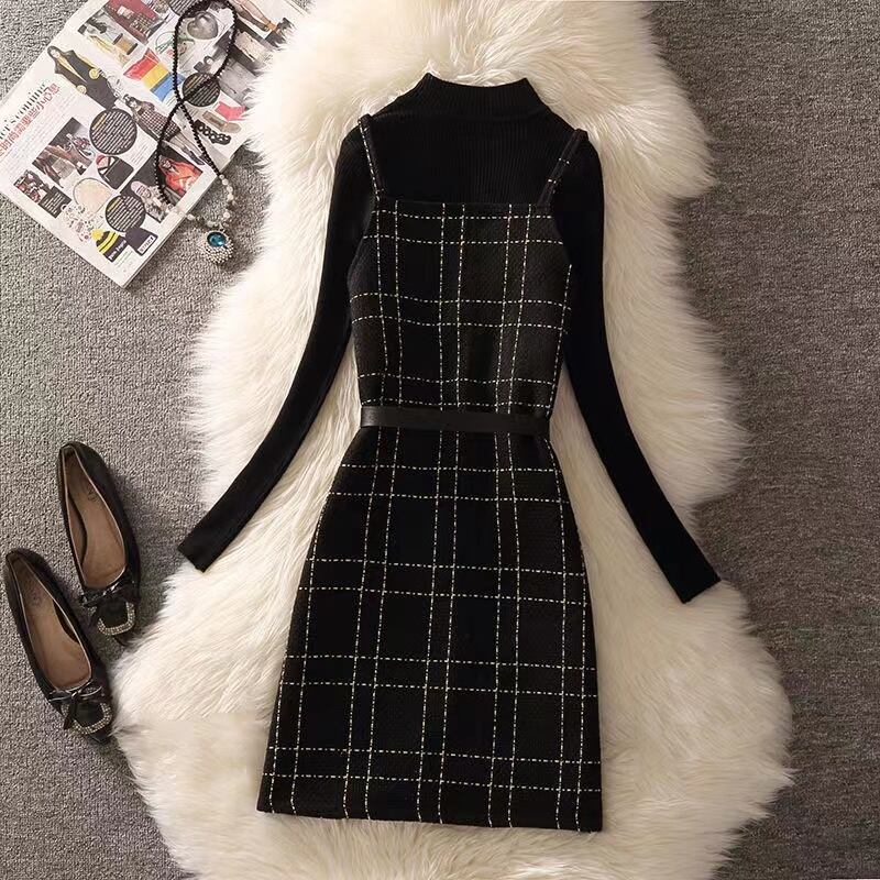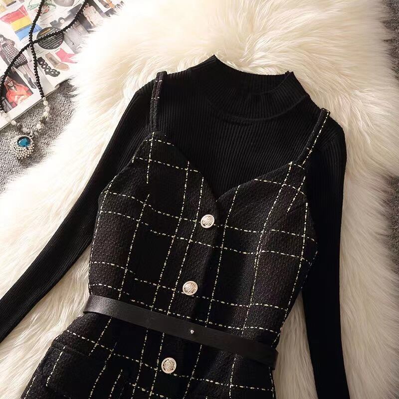 【set】一目惚れ!2点セット無地セーター+Vネックウェスト絞りチェック柄キャミワンピース通勤日常セットアップF1405