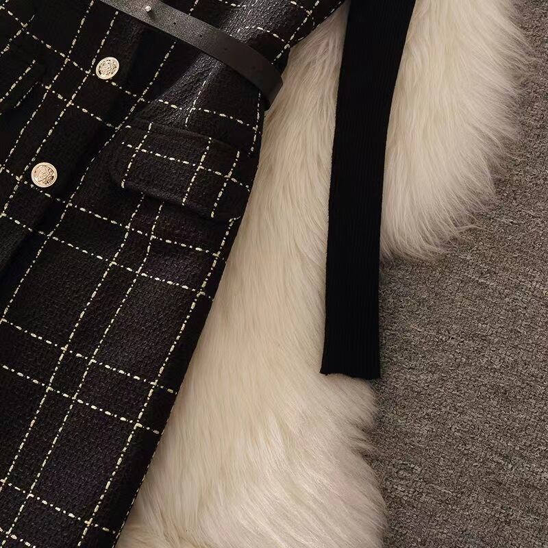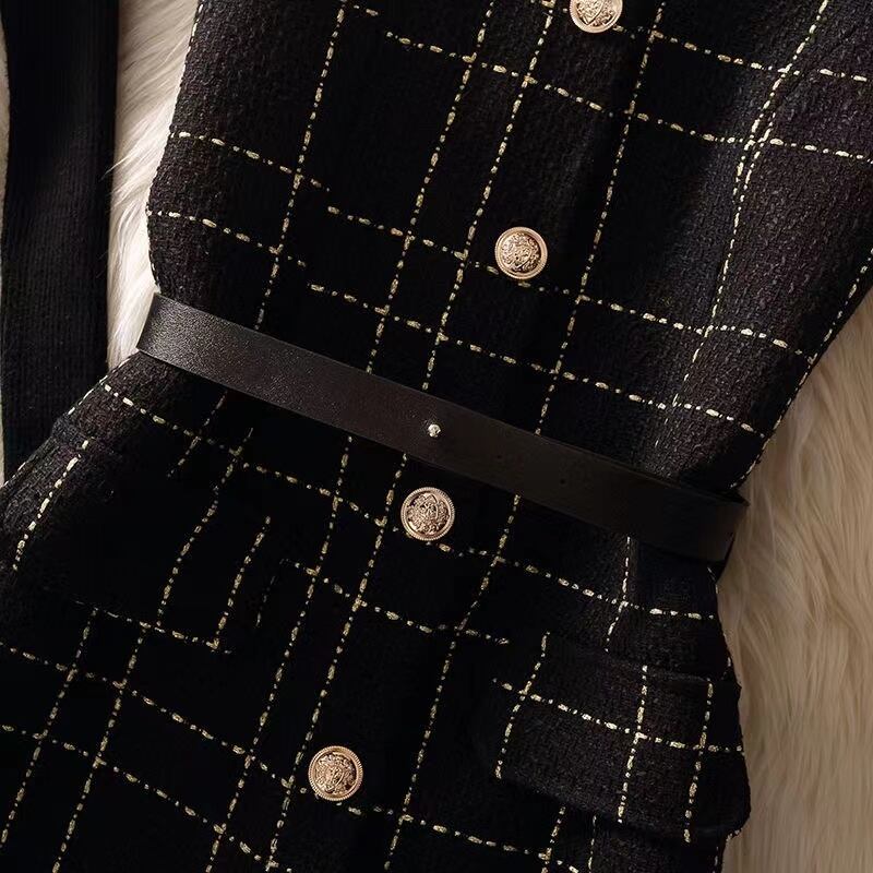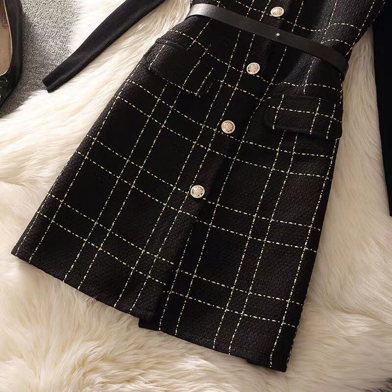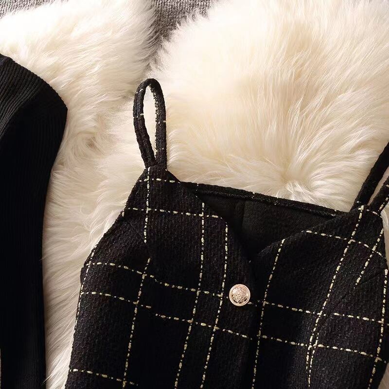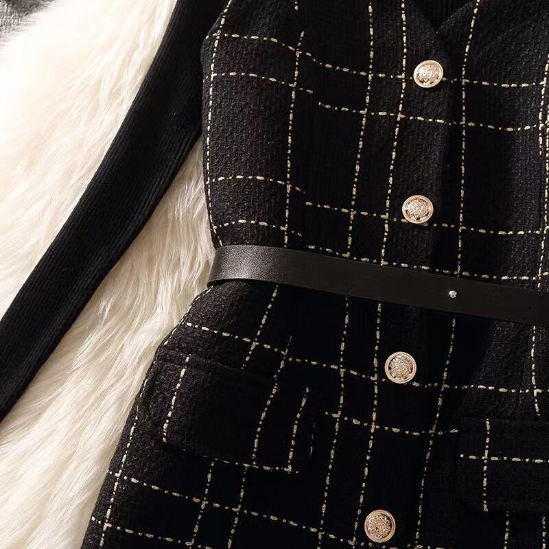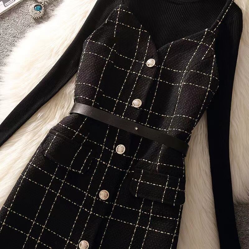 【set】一目惚れ!2点セット無地セーター+Vネックウェスト絞りチェック柄キャミワンピース通勤日常セットアップF1405