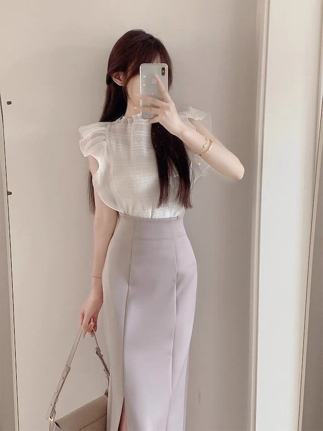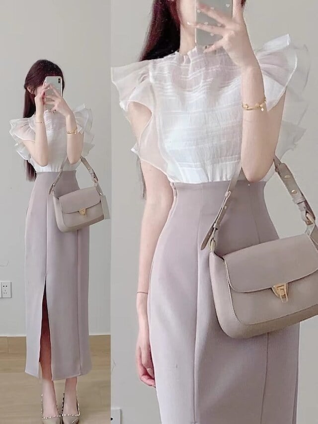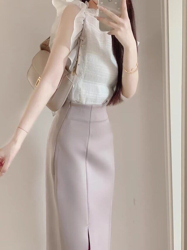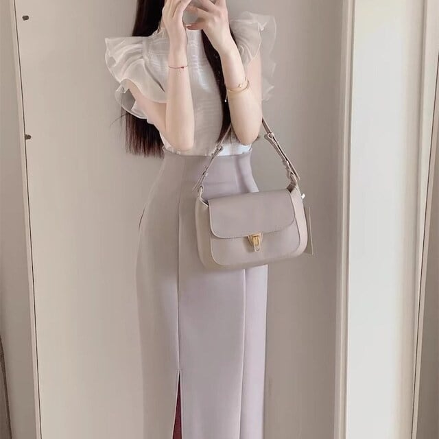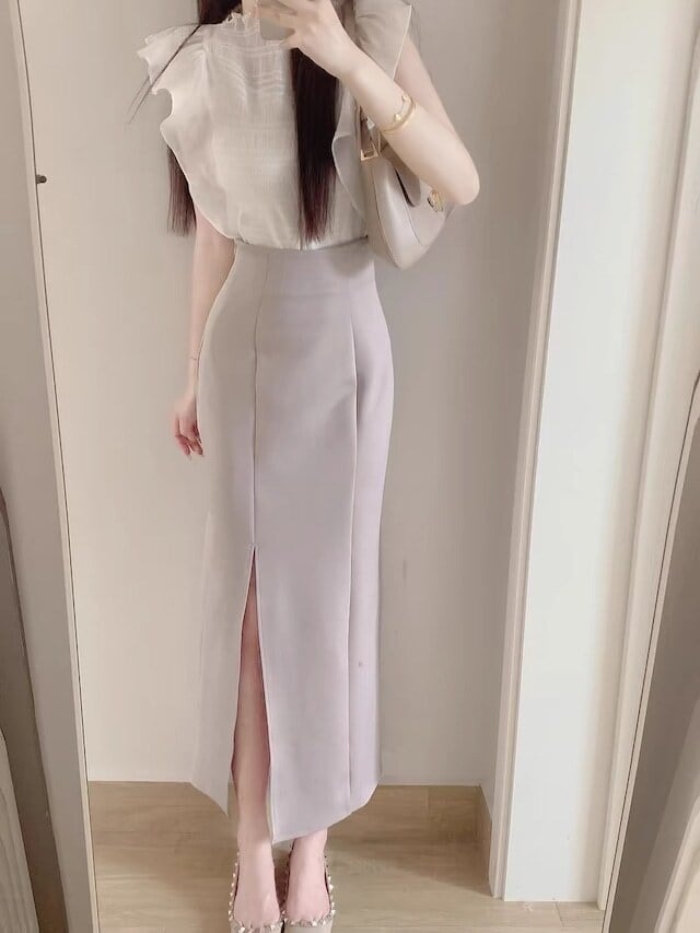 【set】フレンチスリーブトップス+スリットスカートセットF7163