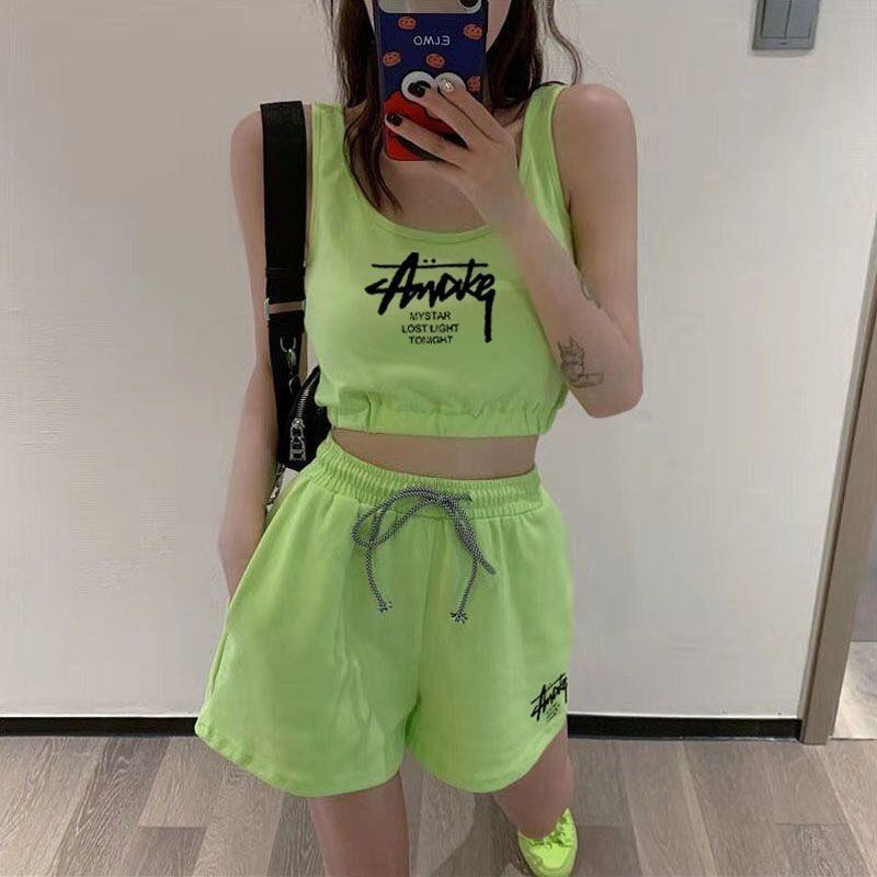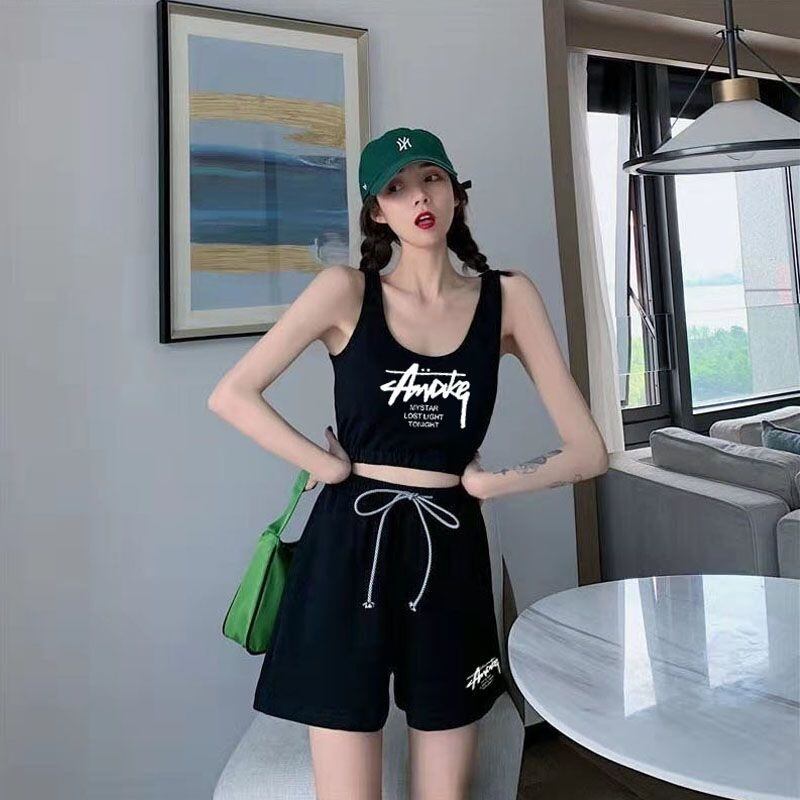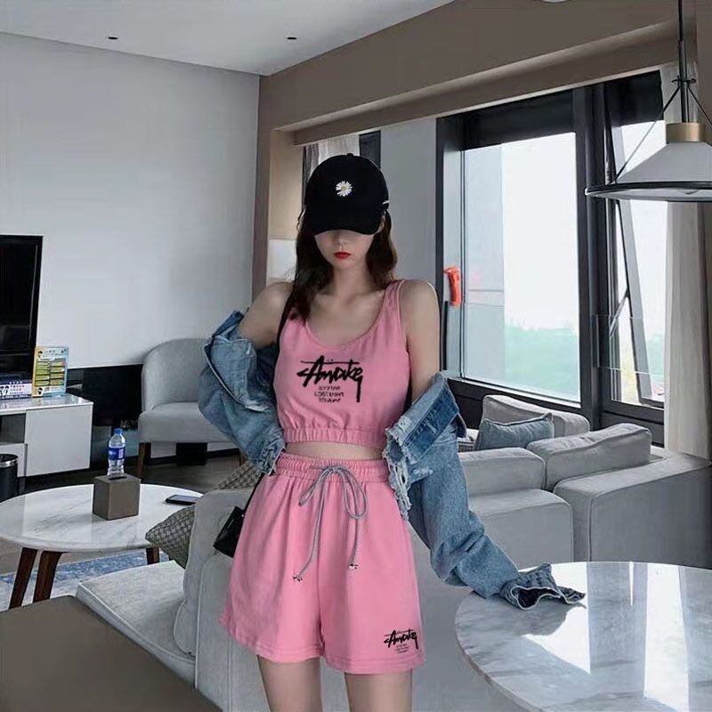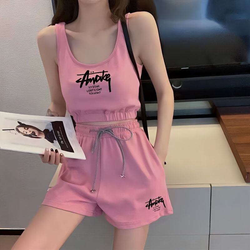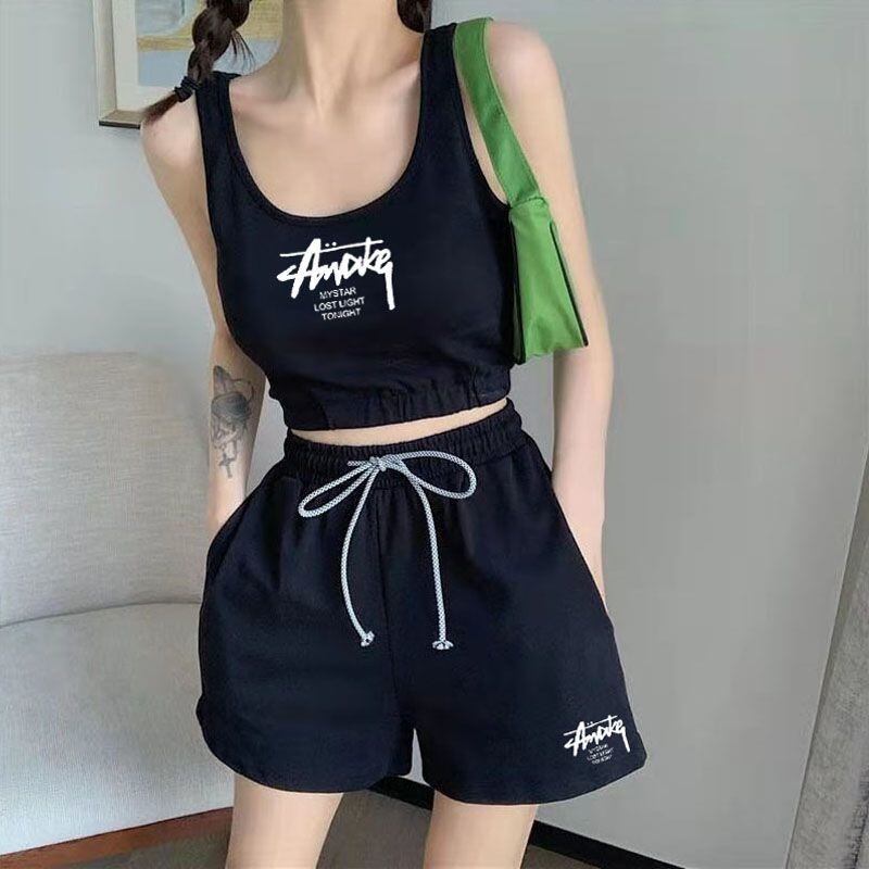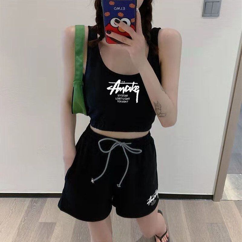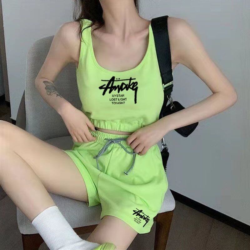 【set】英字柄配色タンクトップ+ショートパンツ2点セットF7337