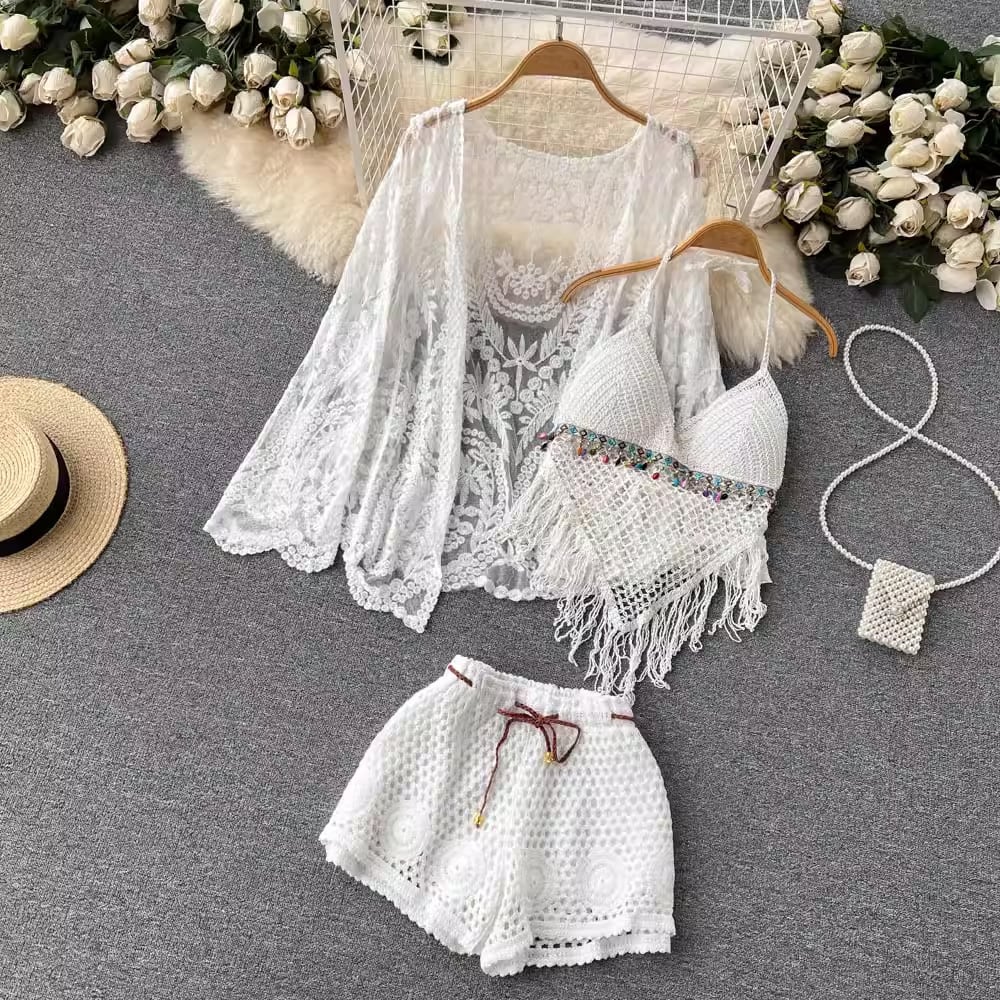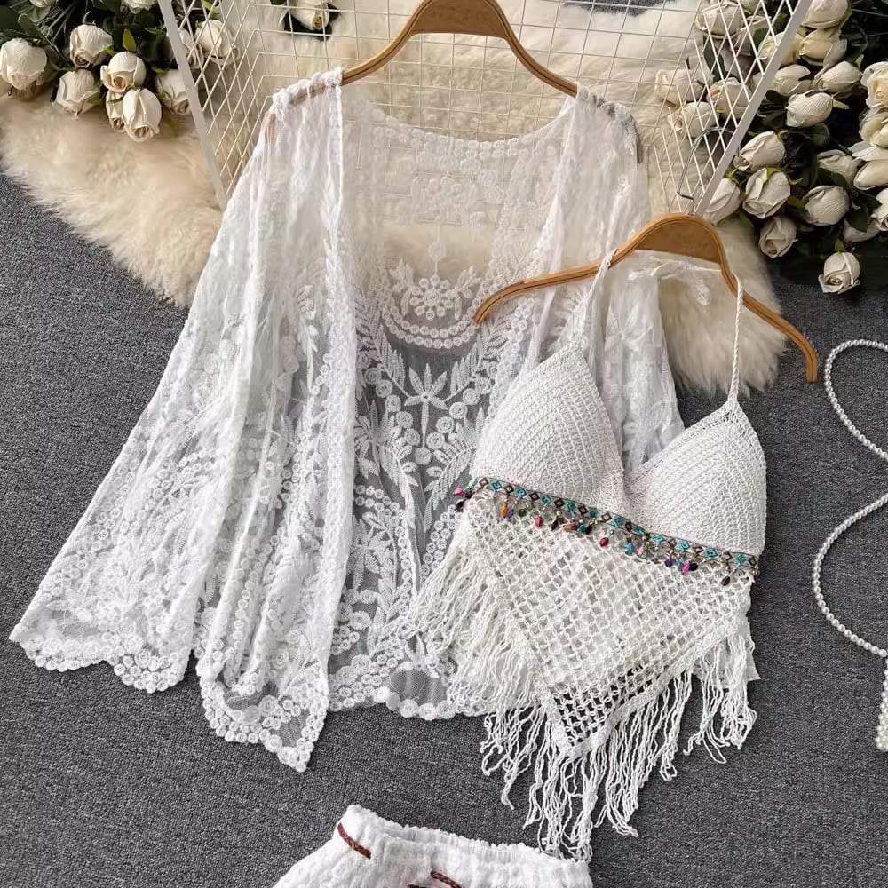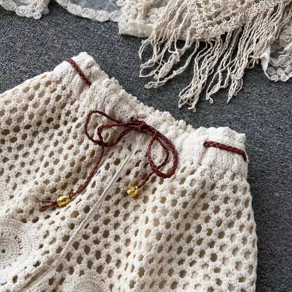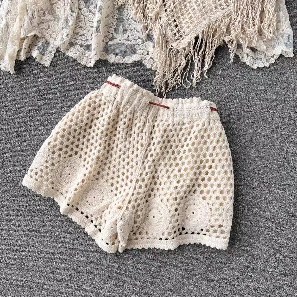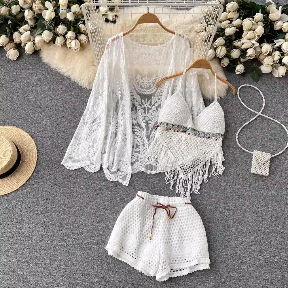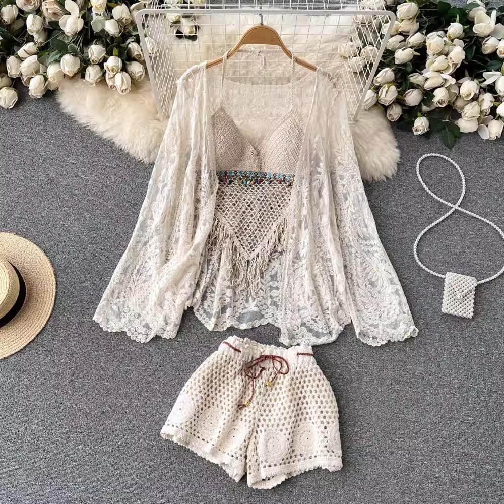 【set】カーディガン+フリンジキャミソール+ショートパンツ3点セットF7520